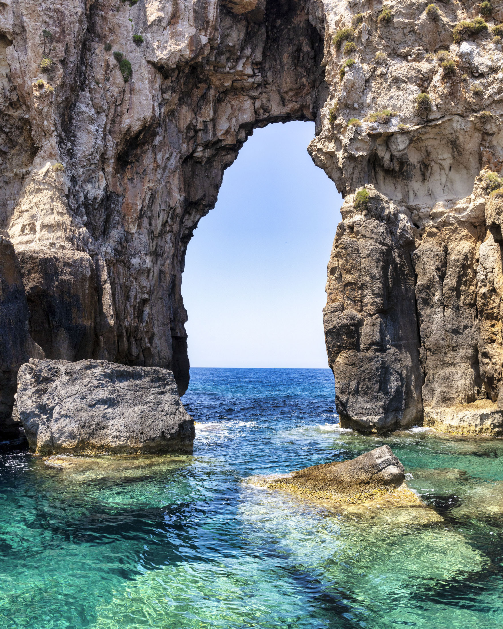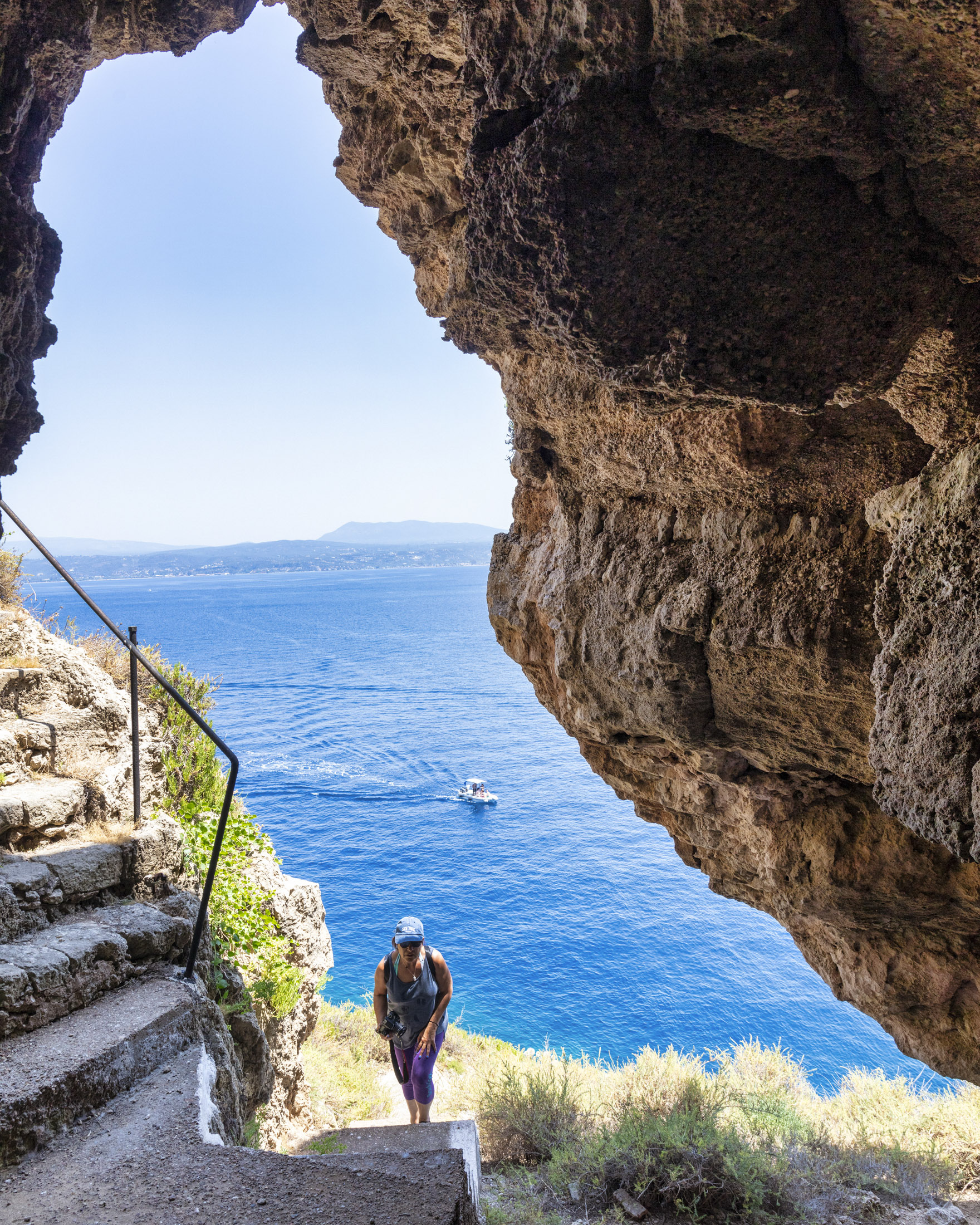 Αποβιβαζόμαστε στο νησάκι και ξαφνικά έρχομαι αντιμέτωπη με μια σειρά από απότομα σκαλιά. Μαζί μας ανεβαίνει τρέχοντας μια παρέα νεαρών Άγγλων με σαγιονάρες. Τους ακολουθώ με γενναιότητα, μέχρι που αποκαμωμένη θα κάνω στάση στη σκιερή μεγάλη σπηλιά για να χαζέψω τα κρυστάλλινα νερά και τα δεμένα αρόδο σκάφη. Μετά θα τους ακολουθήσω ως το πλάτωμα της κορυφής. Εκεί, βρίσκεται το μνημείο των Γάλλων Πεσόντων, κτισμένο το 1890, που έχει κηρυχθεί Ιστορικό Διατηρητέο Μνημείο. Η θέα προς την Πύλο, όσο και προς το Ιόνιο πέλαγος είναι εντυπωσιακή. Ένα μικρό μονοπάτι οδηγεί προς την πίσω πλευρά όπου θαυμάζουμε τα απόκρημνα βράχια με τα υπέροχα σχήματα.