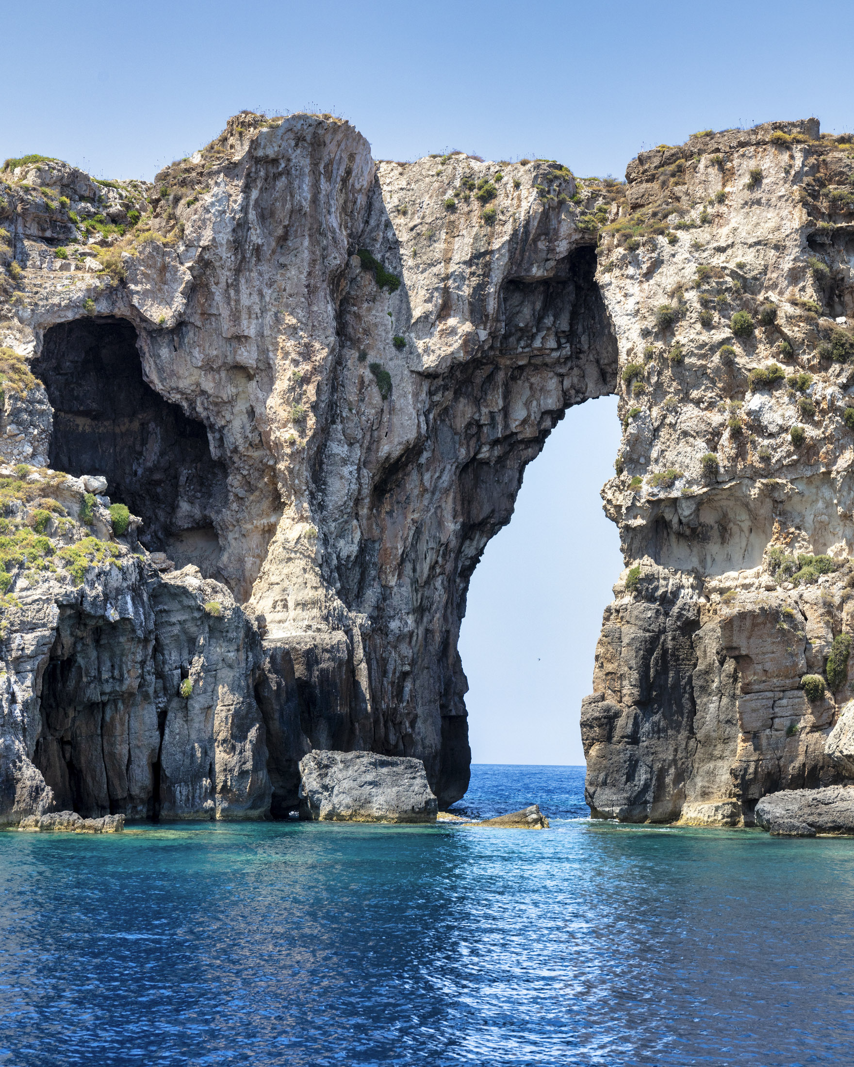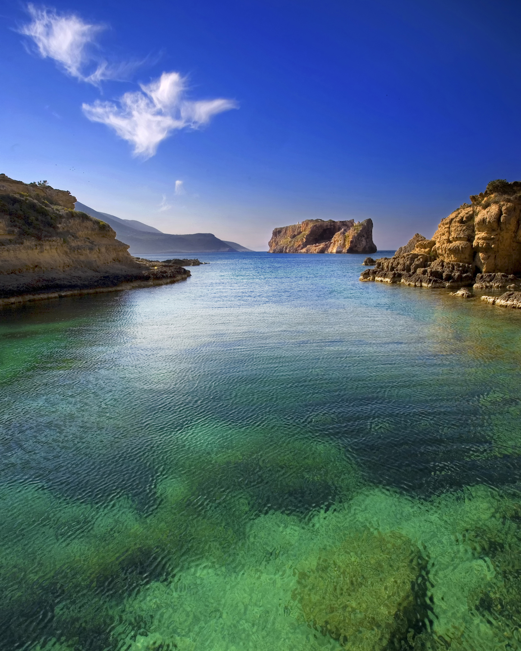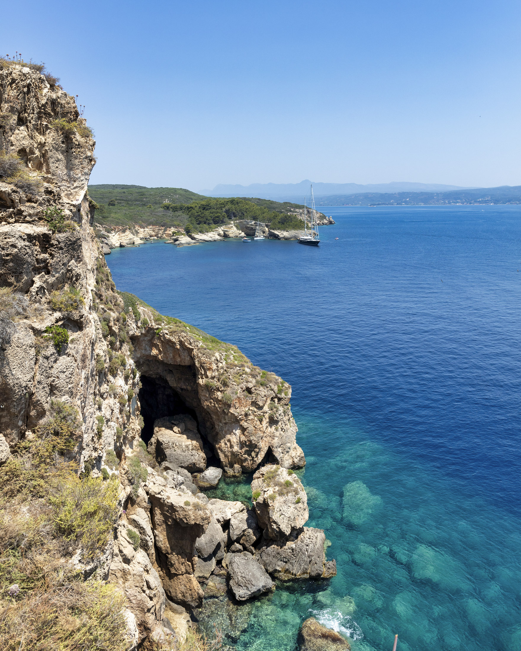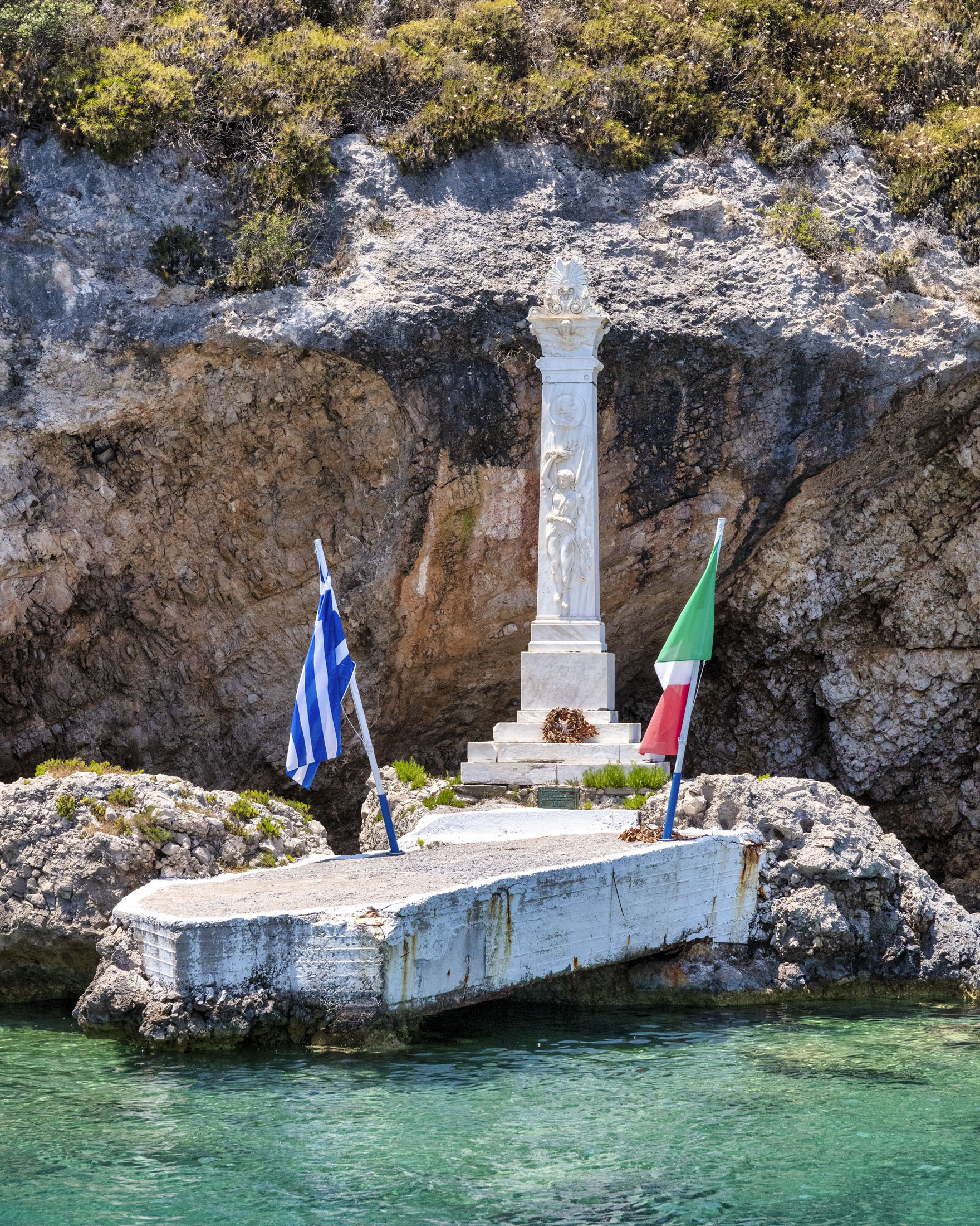 Αποβιβαζόμαστε στο νησάκι και ξαφνικά έρχομαι αντιμέτωπη με μια σειρά από απότομα σκαλιά. Μαζί μας ανεβαίνει τρέχοντας μια παρέα νεαρών Άγγλων με σαγιονάρες. Τους ακολουθώ με γενναιότητα, μέχρι που αποκαμωμένη θα κάνω στάση στη σκιερή μεγάλη σπηλιά για να χαζέψω τα κρυστάλλινα νερά και τα δεμένα αρόδο σκάφη. Μετά θα τους ακολουθήσω ως το πλάτωμα της κορυφής. Εκεί, βρίσκεται το μνημείο των Γάλλων Πεσόντων, κτισμένο το 1890, που έχει κηρυχθεί Ιστορικό Διατηρητέο Μνημείο. Η θέα προς την Πύλο, όσο και προς το Ιόνιο πέλαγος είναι εντυπωσιακή. Ένα μικρό μονοπάτι οδηγεί προς την πίσω πλευρά όπου θαυμάζουμε τα απόκρημνα βράχια με τα υπέροχα σχήματα.