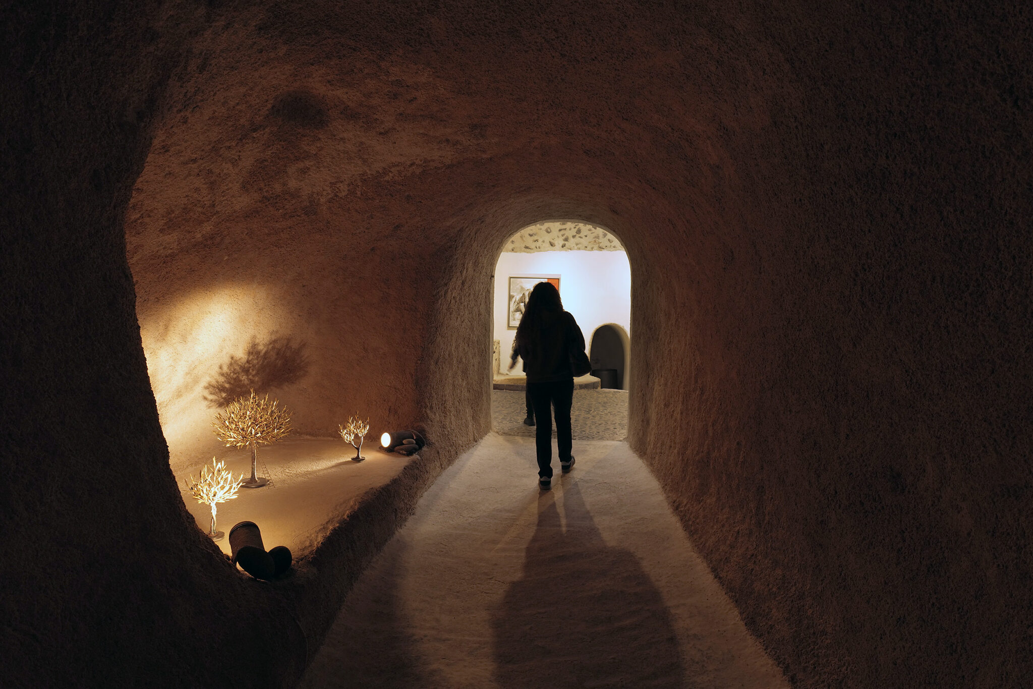 Οι χοντροί τοίχοι με τις ηφαιστειακές πέτρες, τα σμιλεμένα πέτρινα σκαλιά που οδηγούν στον μεγάλο υπόσκαφο χώρο του παλιού οινοποιείου σε βάθος 12 μέτρων και τα τρία ακόμη τμήματα του Art Space, αποπνέουν μια μυσταγωγική ατμόσφαιρα και ξετυλίγουν το αφήγημα της θηραϊκής οινικής κουλτούρας που ξεκινά 4.000 χρόνια πριν. Στα πλαίσια οργανωμένης ξενάγησης ξεδιπλώνονται μπροστά μας ιστορίες σαν αυτές που εκτυλίσσονταν στα πατητήρια, όταν προσθέτονταν κάθε μέρα επί 2-3 βδομάδες επτά τόνοι σταφύλια, για την εκχύμωση που γινόταν σταδιακά με το ίδιο το βάρος των σταφυλιών, για το νέκταρ που έρεε τη νύχτα κι έδωσε στο σαντορινιό κρασί το όνομα Νυχτέρι, για τα πώς απαιτούνται 11 κιλά λευκά σταφύλια για να παραχθεί ένα λίτρο Vinsanto και για τη φύλαξη στις «άφουρες» όπως ονομάζονταν παλιά τα κελάρια με τα βαρέλια.