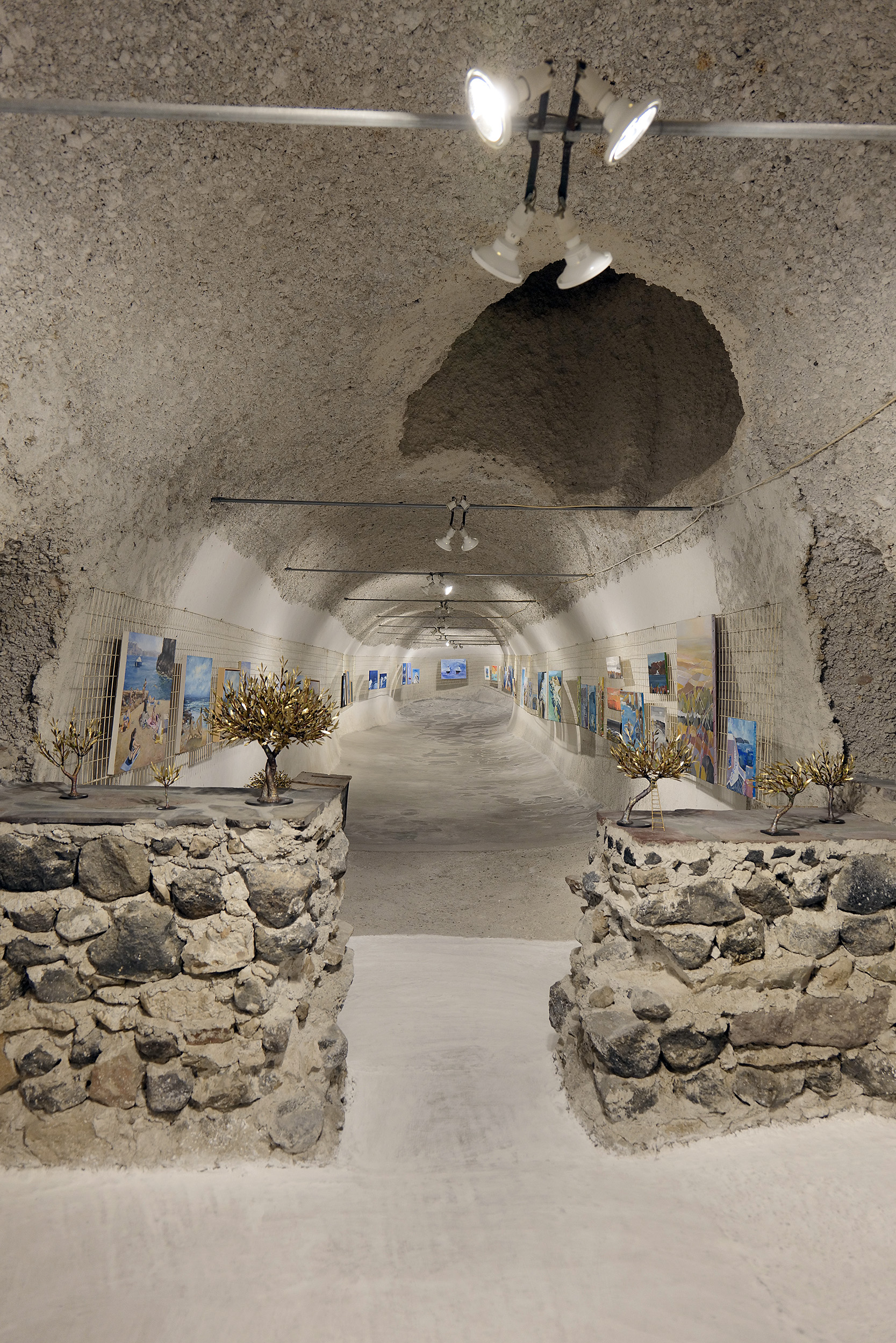 Οι χοντροί τοίχοι με τις ηφαιστειακές πέτρες, τα σμιλεμένα πέτρινα σκαλιά που οδηγούν στον μεγάλο υπόσκαφο χώρο του παλιού οινοποιείου σε βάθος 12 μέτρων και τα τρία ακόμη τμήματα του Art Space, αποπνέουν μια μυσταγωγική ατμόσφαιρα και ξετυλίγουν το αφήγημα της θηραϊκής οινικής κουλτούρας που ξεκινά 4.000 χρόνια πριν. Στα πλαίσια οργανωμένης ξενάγησης ξεδιπλώνονται μπροστά μας ιστορίες σαν αυτές που εκτυλίσσονταν στα πατητήρια, όταν προσθέτονταν κάθε μέρα επί 2-3 βδομάδες επτά τόνοι σταφύλια, για την εκχύμωση που γινόταν σταδιακά με το ίδιο το βάρος των σταφυλιών, για το νέκταρ που έρεε τη νύχτα κι έδωσε στο σαντορινιό κρασί το όνομα Νυχτέρι, για τα πώς απαιτούνται 11 κιλά λευκά σταφύλια για να παραχθεί ένα λίτρο Vinsanto και για τη φύλαξη στις «άφουρες» όπως ονομάζονταν παλιά τα κελάρια με τα βαρέλια.