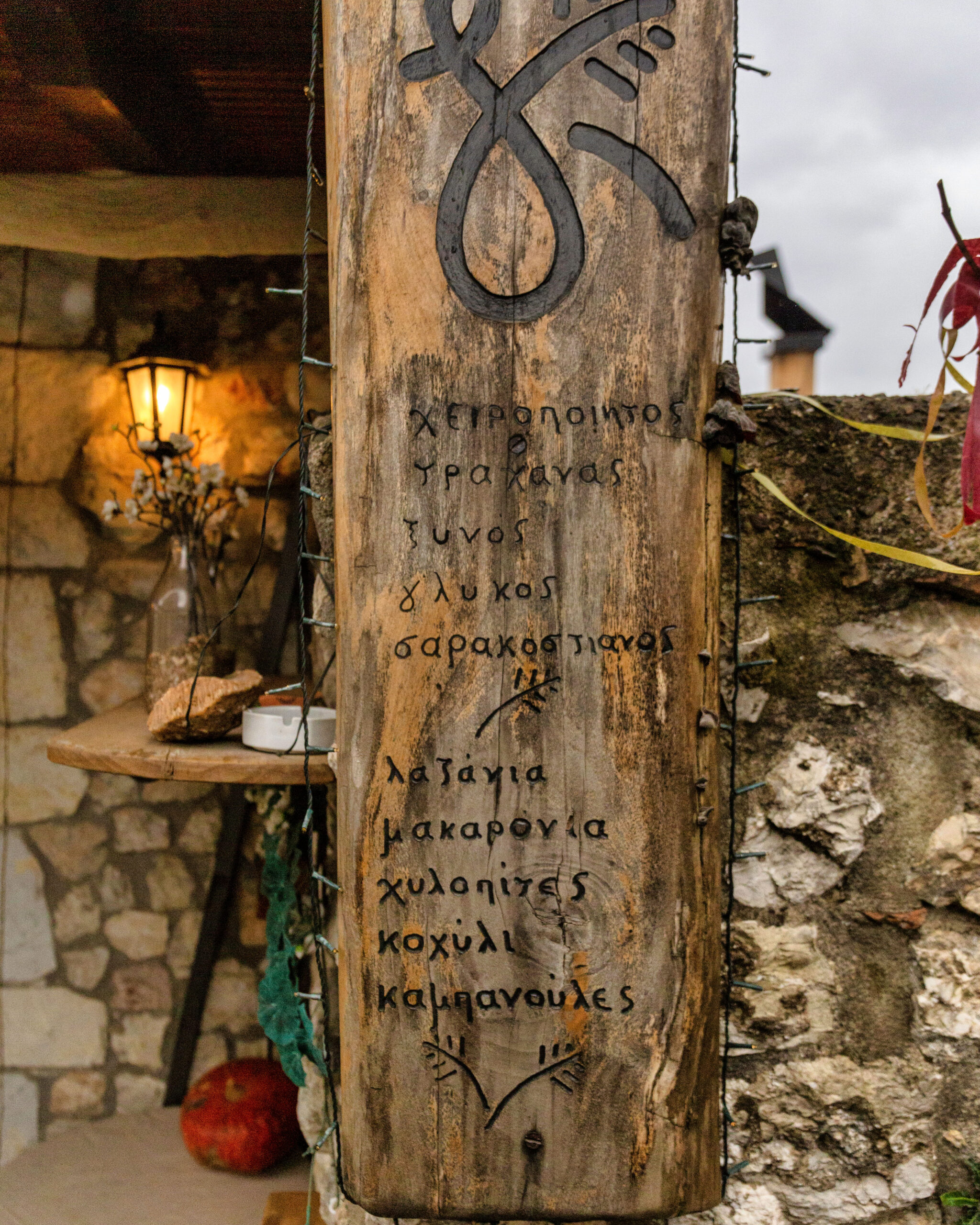 Σε ένα ράφι του ψυγείου μου έχω ένα μεγάλο, καλαίσθητο σακουλάκι με ξινό τραχανά. Γράφει επάνω «Τα ζυμαρικά της Κυριακής». Ο τραχανάς αυτός ήταν ένα από τα πολλά προϊόντα της που ταξίδεψαν μαζί μας από την Καρύταινα στην Αθήνα. Δώρα από καρδιάς. Την Κυριακή Μπακογιάννη την είχαμε γνωρίσει δυο μέρες πριν στο καλαίσθητο παντοπωλείο της στο κεντρικό σοκάκι που οδηγεί προς το κάστρο. Εκεί όπου τοπικά προϊόντα μαζί με δικά της χειροποίητα ζυμαρικά και τραχανάδες παρατάσσονται στα ράφια. Διάφορα αντικείμενα φτιαγμένα από ξύλο στολίζουν την πέτρινη πρόσοψη. Την κάνουν να εναρμονίζεται απόλυτα με το χωριό.