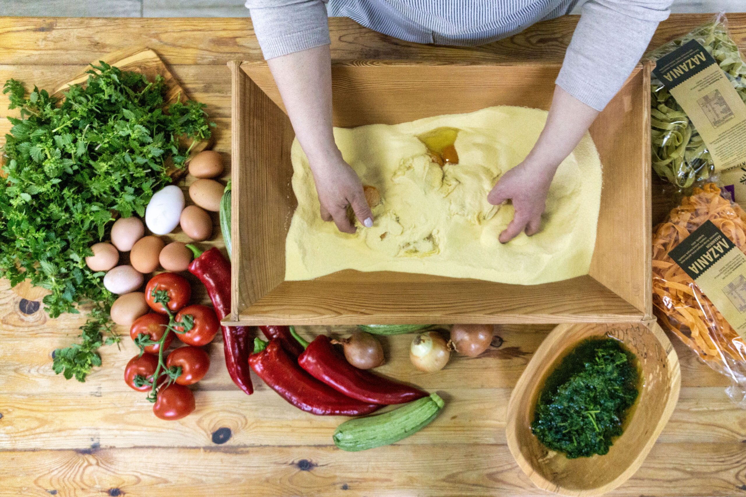 Στεκόμαστε στο πεντακάθαρο εργαστήριό της, η φωτογράφιση έχει τελειώσει. Τα χρωματιστά χειροποίητα ζυμαρικά της είναι ακόμη απλωμένα στον μεγάλο ξύλινο πάγκο. Συντροφιά με τομάτες, κολοκύθια, αυγά, φρέσκα βότανα και βρασμένες τσουκνίδες σε μια γαβάθα.