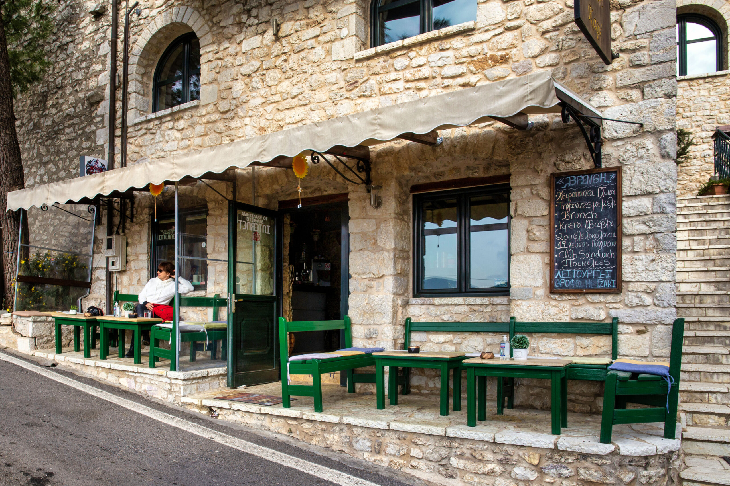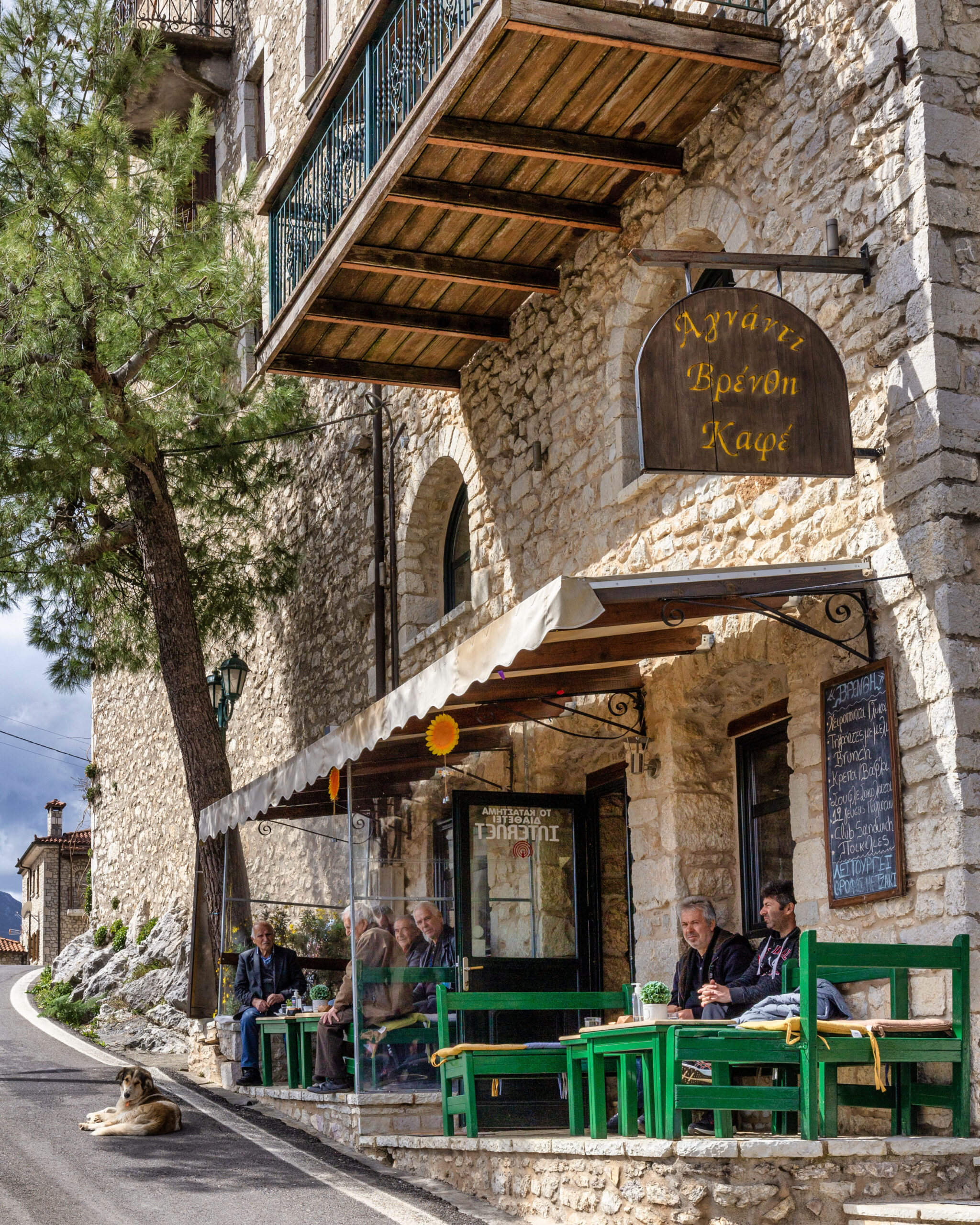 «Ο μπαμπάς μου είχε όνειρο να επιστρέψει στο χωριό και τα κατάφερε στα 45 του. Έφτιαξε πρώτα το κτήμα με τα περιβόλια, τα πρόβατα, τις κότες του. Μετά έφτιαξε το μαγαζί, έχοντας κάνει πρώτα πολύ διαφήμιση. Φαντάσου ότι πήγαινε ο ίδιος από χωριό σε χωριό για να ενημερώσει τους ανθρώπους, μήνες πριν. Και τελικά τα κατάφερε. Σε λίγο καιρό το μαγαζί γέμισε, δεν ήξερες πού να βάλεις τον κόσμο». Μια παρέα ηλικιωμένων πλησιάζει από τον κεντρικό δρόμο, στρίβει, κάθεται. Σε λίγα λεπτά θα σερβιριστεί ελληνικά καφεδάκια. Οι ηλικιωμένοι. Η τυπική εικόνα που βλέπεις στα ξεχασμένα ορεινά χωριά. Αυτοί που έμειναν. Αυτοί που όταν φύγουν για πάντα θα αφήσουν πίσω τους σπίτια κλειστά που σιγά σιγά θα ερειπώσουν.