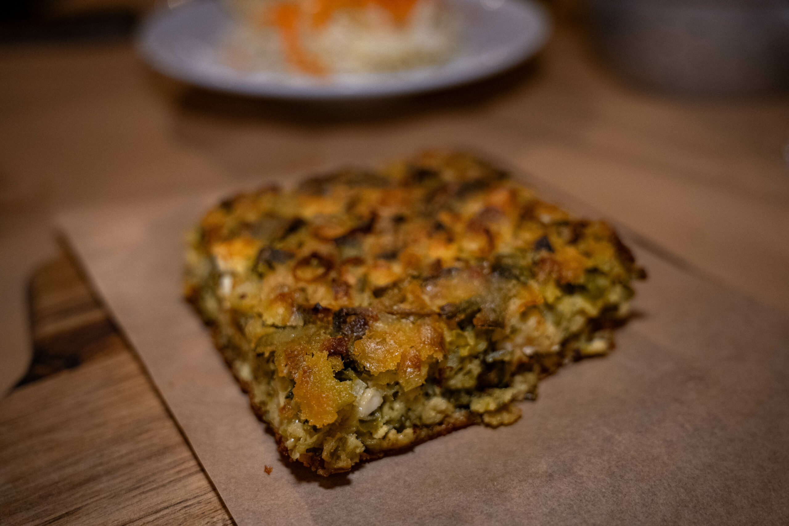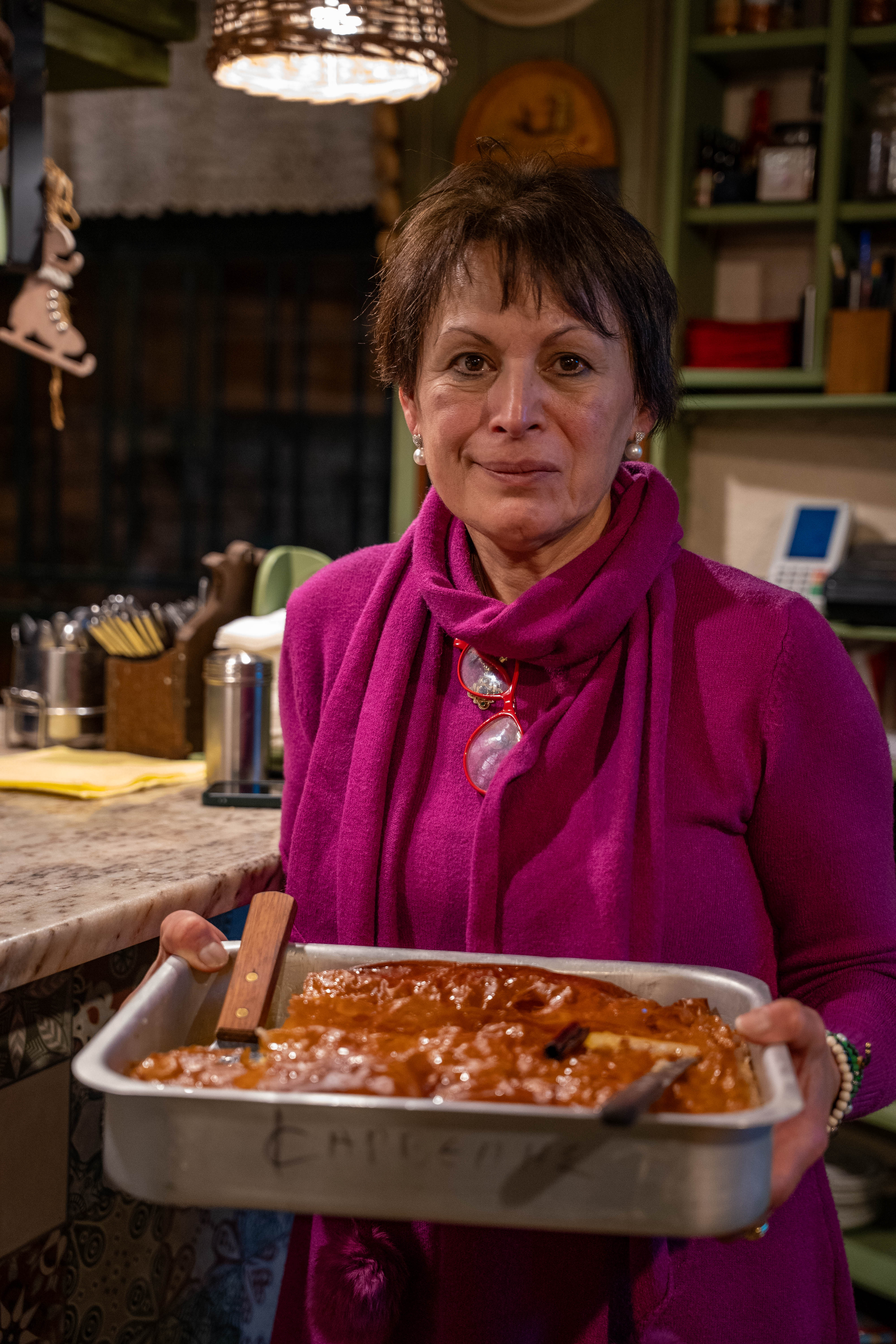 Στο καφενείο του Καρβέλη, δοκιμάσαμε το περίφημο γαλακτομπούρεκο που έχει γίνει σημείο αναφοράς. Η κυρία Γιάννα το φτιάχνει από τη δεκαετία του ’80 με την ίδια συνταγή: πρόβειο και γίδινο γάλα από ζώα που βόσκουν στις πλαγιές της Καλιακούδας, βελούδινη κρέμα, πιο χοντρό φύλλο από το συνηθισμένο και σιρόπι που μπαίνει καυτό σε καυτό. Δίπλα, ο γιος τους Θανάσης συνεχίζει στο «Ρακόμελο» πιο σύγχρονος χώρος, ίδια λογική.