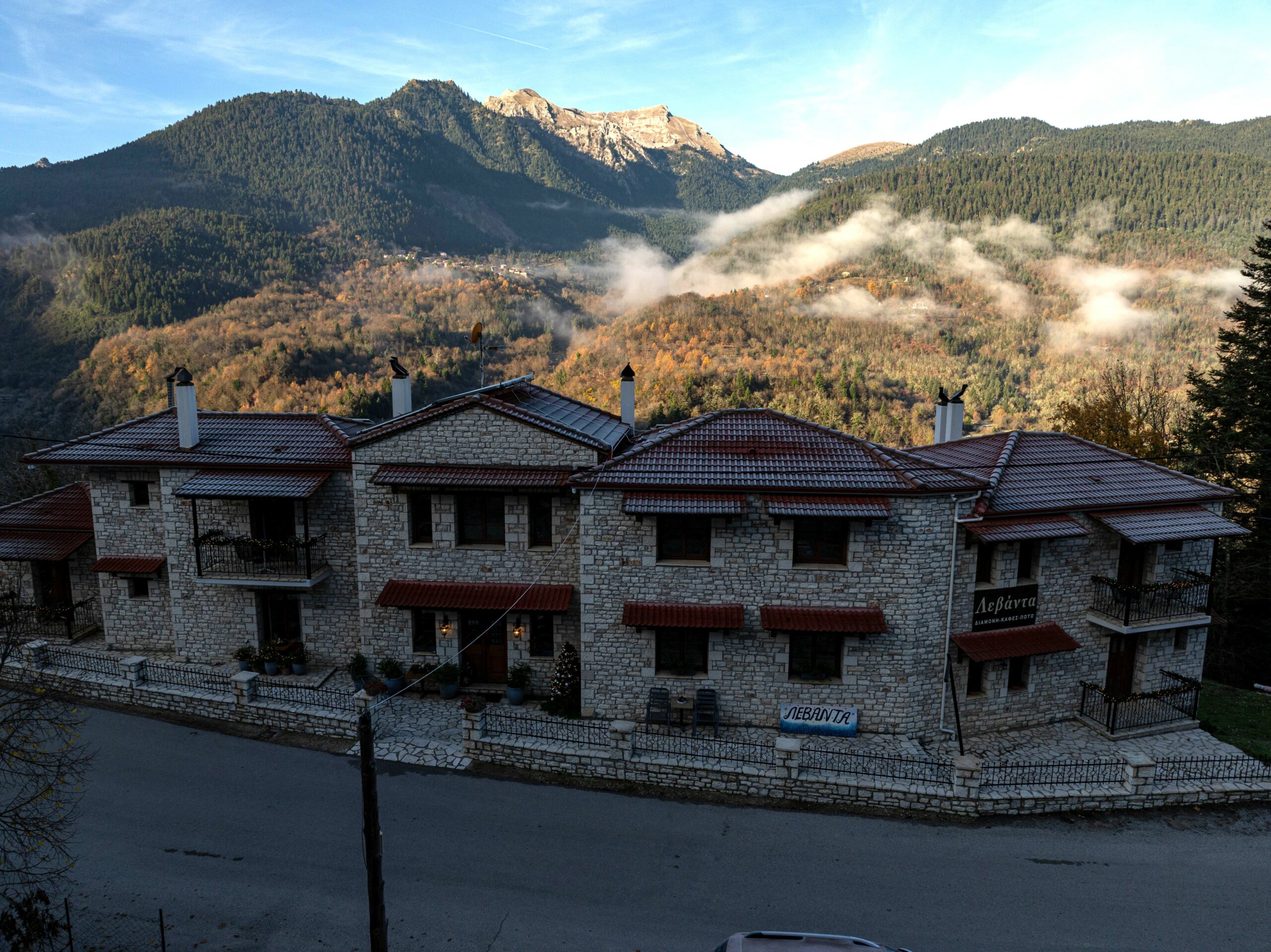 Στην είσοδο του Μεγάλου Χωριού, η «Λεβάντα» λειτουργεί από το 2011. Δέκα δωμάτια και δύο σουίτες, πέτρα και ξύλο, επτά με τζάκι, θέα είτε στις κορυφές της Χελιδόνας είτε προς το Παλαιό Μικρό Χωριό. Το πρωινό σερβίρεται μπροστά στο τζάκι ή στη βεράντα: σπιτικό κέικ, μαρμελάδες, μέλι, τυριά και αλλαντικά. Στο βάθος ακούγεται ο Καρπενησιώτης ποταμός.