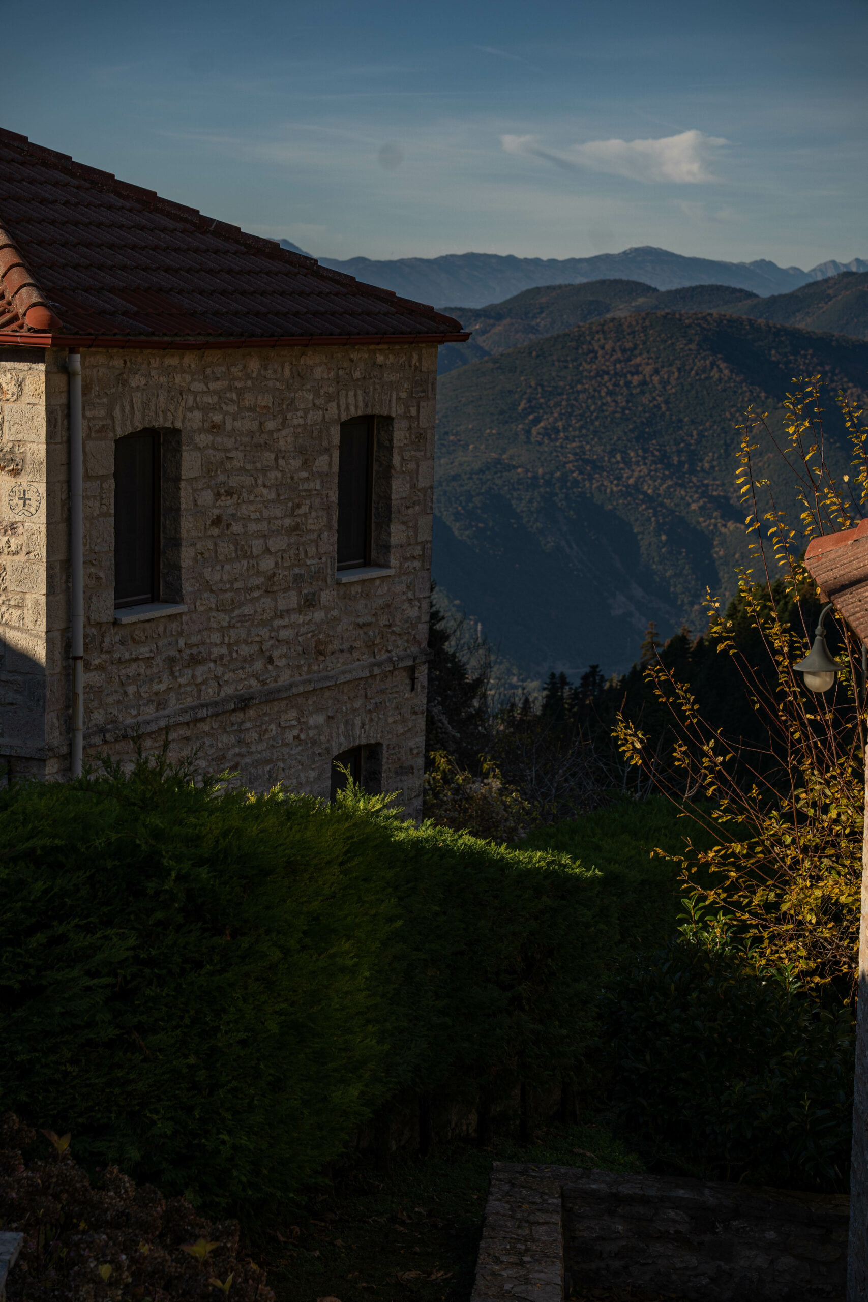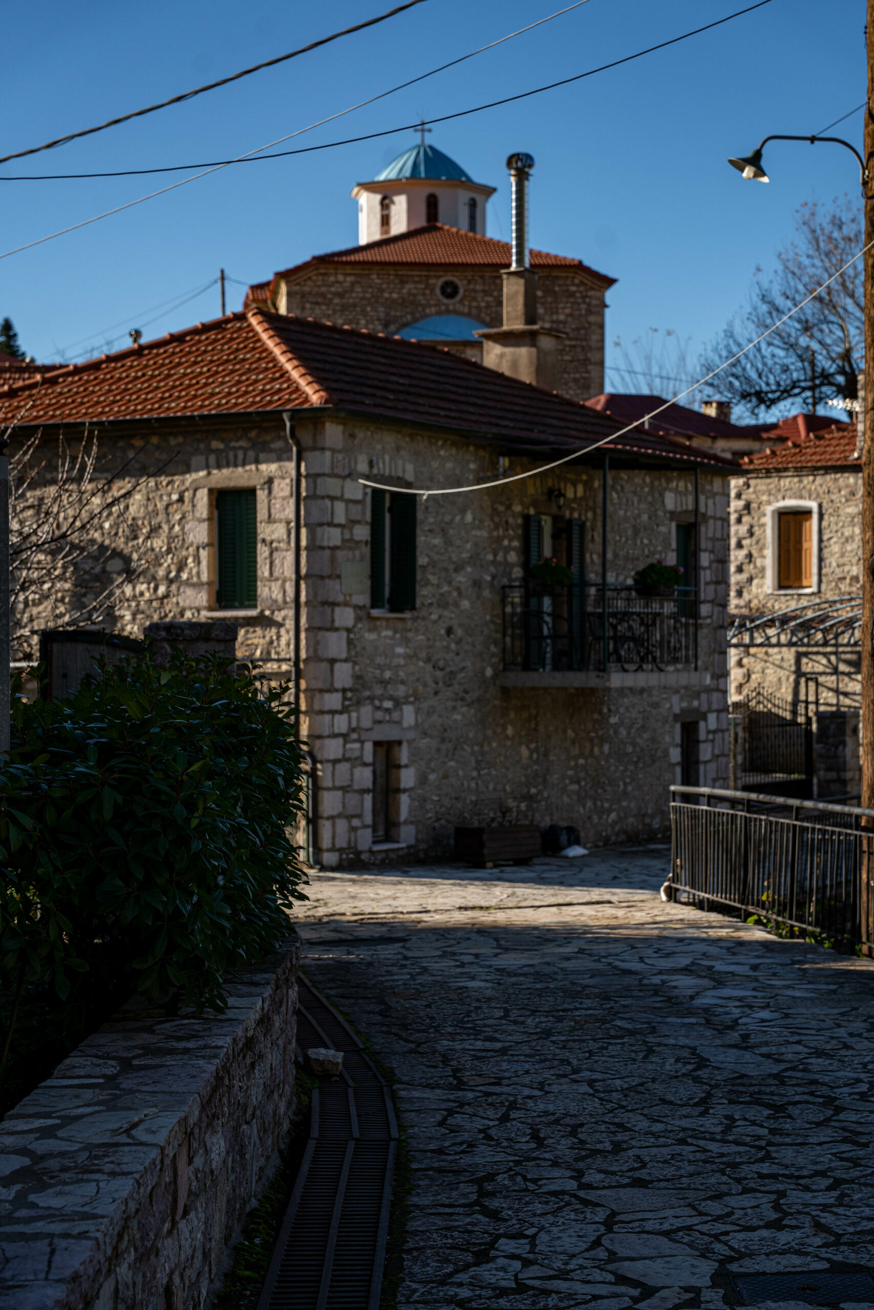 Το χωριό δεν έχει μεγάλους δρόμους. Δεν θέλει. Τα σπίτια του στέκονται λες και είναι ακουμπισμένα ώμο με ώμο, χτισμένα από την τοπική γκρίζα πέτρα που εξορύσσεται από τα σπλάχνα του βουνού. Οι στέγες με τα παλιά κεραμίδια πήλινου χρώματος σχηματίζουν ένα οριζόντιο κύμα που ακολουθεί την κλίση του εδάφους. Ξύλινα μπαλκόνια προβάλλουν προς την απέναντι κοιλάδα, προσφέροντας σημεία θέασης σε έναν κόσμο που ξεδιπλώνεται κάτω σε αποχρώσεις πράσινου και γαλάζιου.