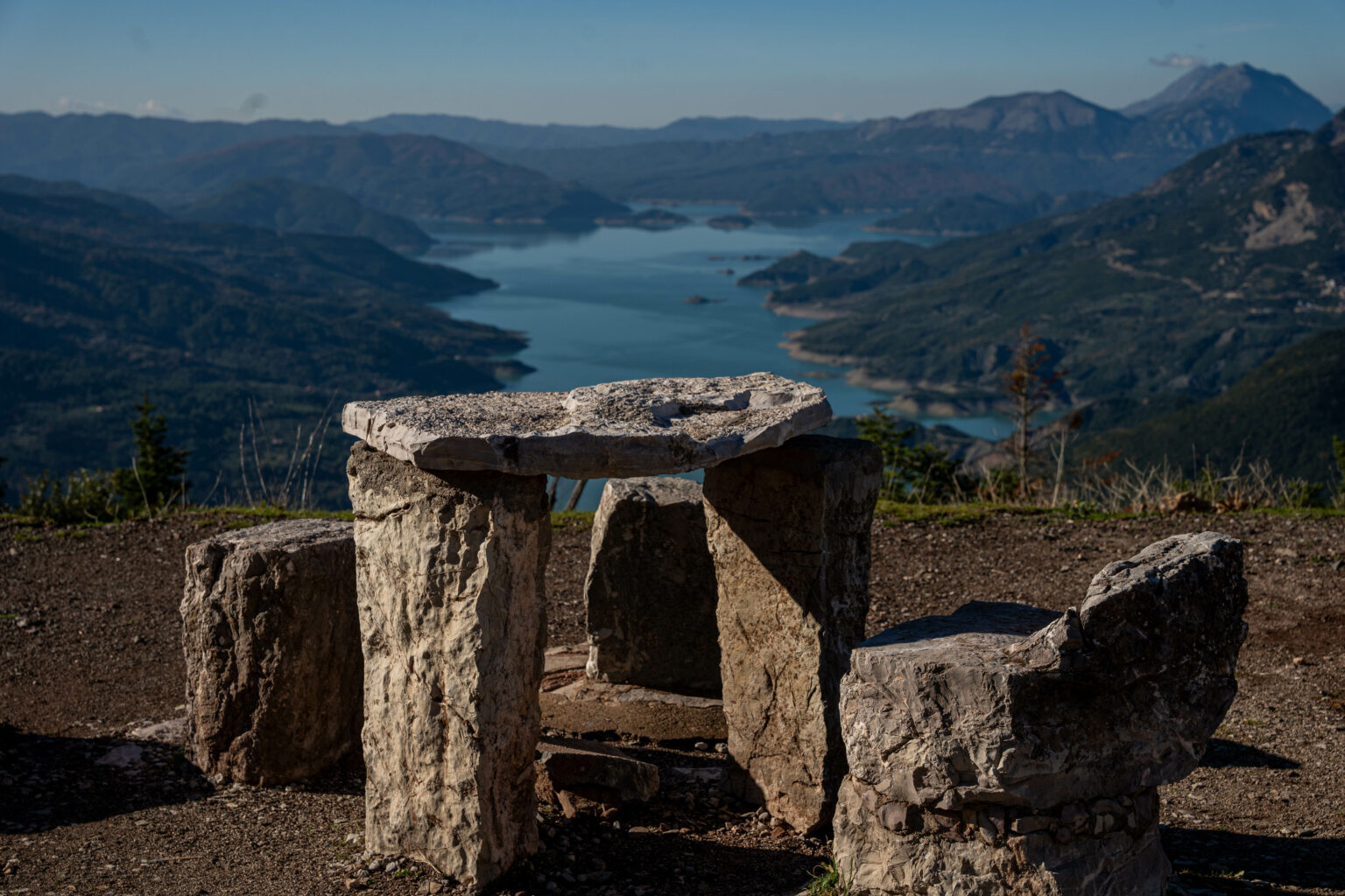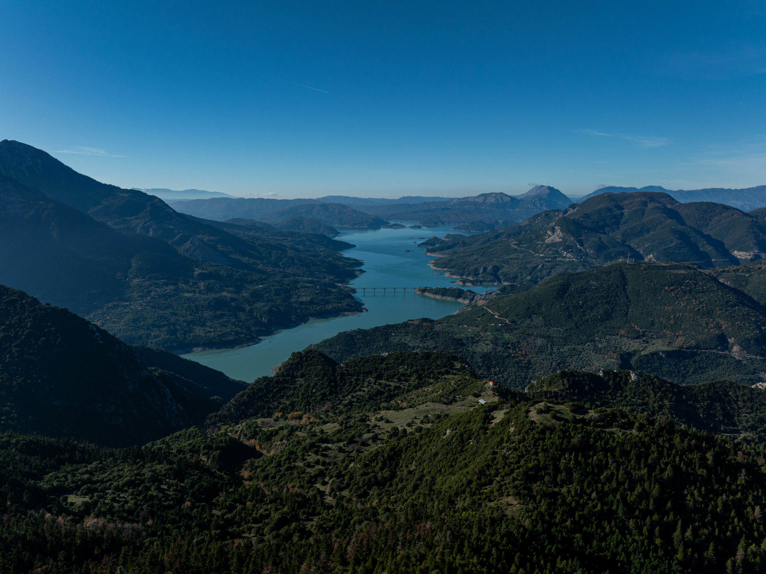 Από το ύψος του θεατή, η Γέφυρα της Επισκοπής, ένα σύγχρονο τεχνικό επίτευγμα που ενώνει την Ευρυτανία με την Αιτωλοακαρνανία, φαίνεται σαν ένα λεπτό σχοινί τεντωμένο πάνω από το νερό. Είναι η στιγμή που αντιλαμβάνεσαι την κλίμακα: οι άνθρωποι χτίζουν μικρά θαύματα, αλλά η φύση χτίζει σύμπαντα.