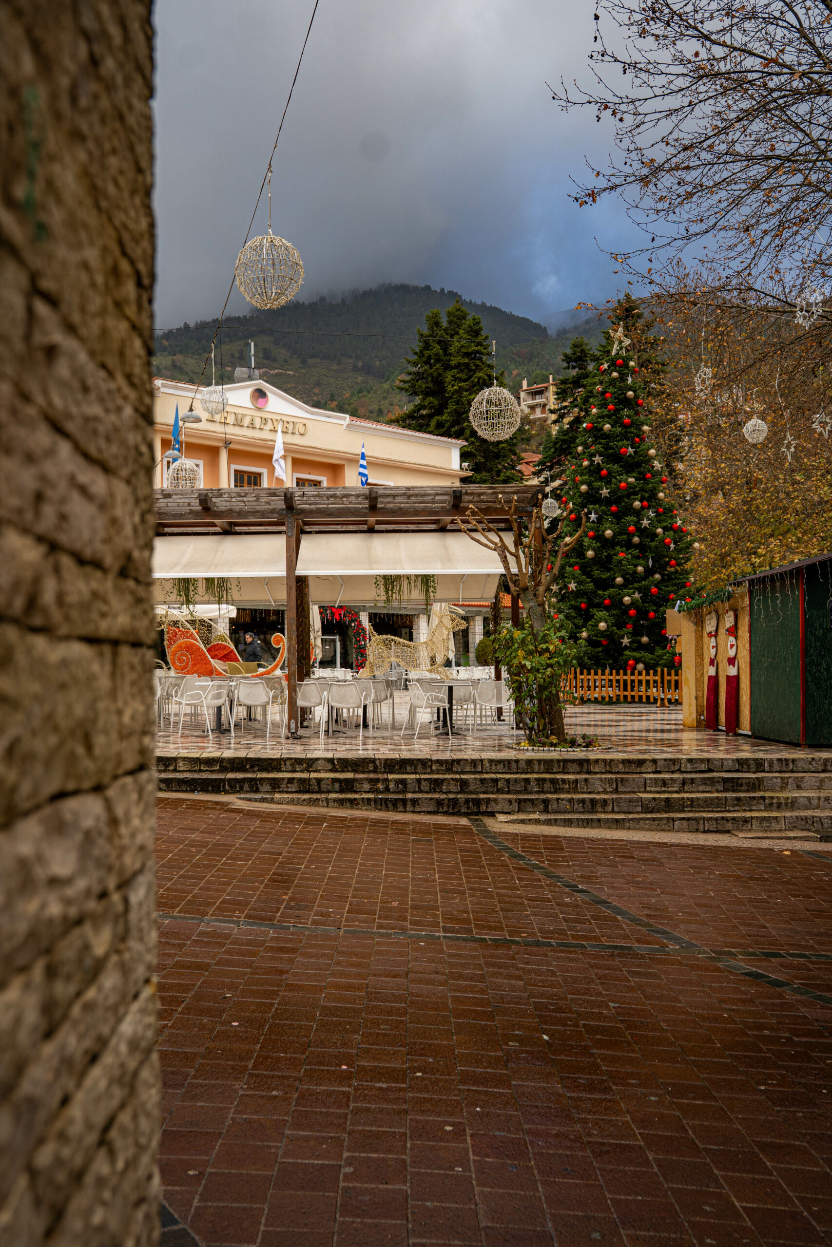 Αποχαιρέτησα τους δύο φίλους και κατέβηκα στην κεντρική πλατεία. Το πέτρινο δάπεδο ήταν υγρό και αντανακλούσε τα φώτα που είχαν κρεμαστεί πάνω από τα παλιά πλατάνια. Ακόμη και χωρίς φύλλα, τα δέντρα κυριαρχούσαν στον χώρο, με τους μεγάλους κορμούς τους να θυμίζουν πόσα χρόνια ζωής έχουν περάσει από εδώ. Η πλατεία λειτουργεί ως βασικός χώρος συνάντησης για κατοίκους και επισκέπτες. Στα παραδοσιακά καφενεία με θαμπά τζάμια κάθονταν ηλικιωμένοι άντρες, παρατηρώντας την κίνηση της πλατείας.