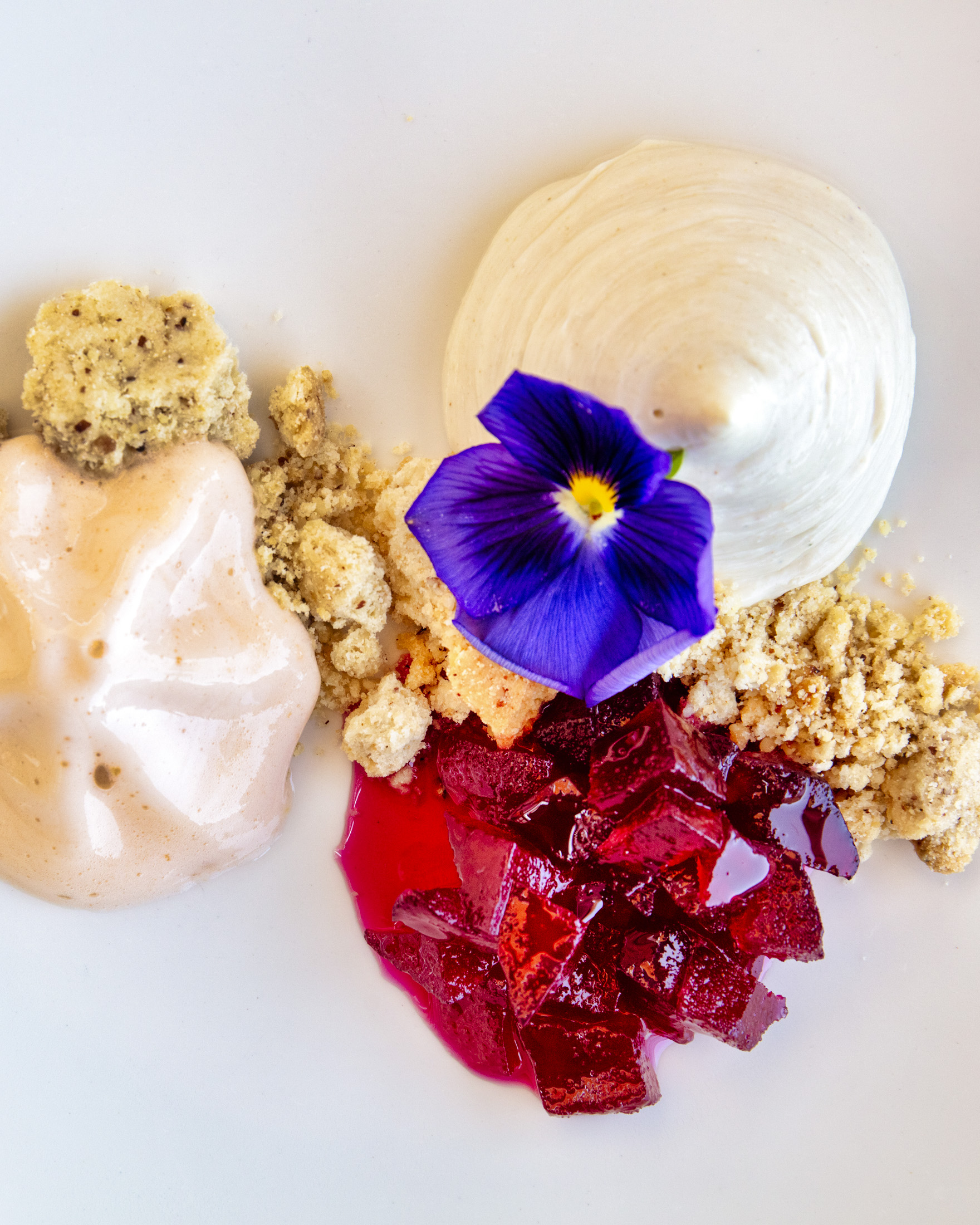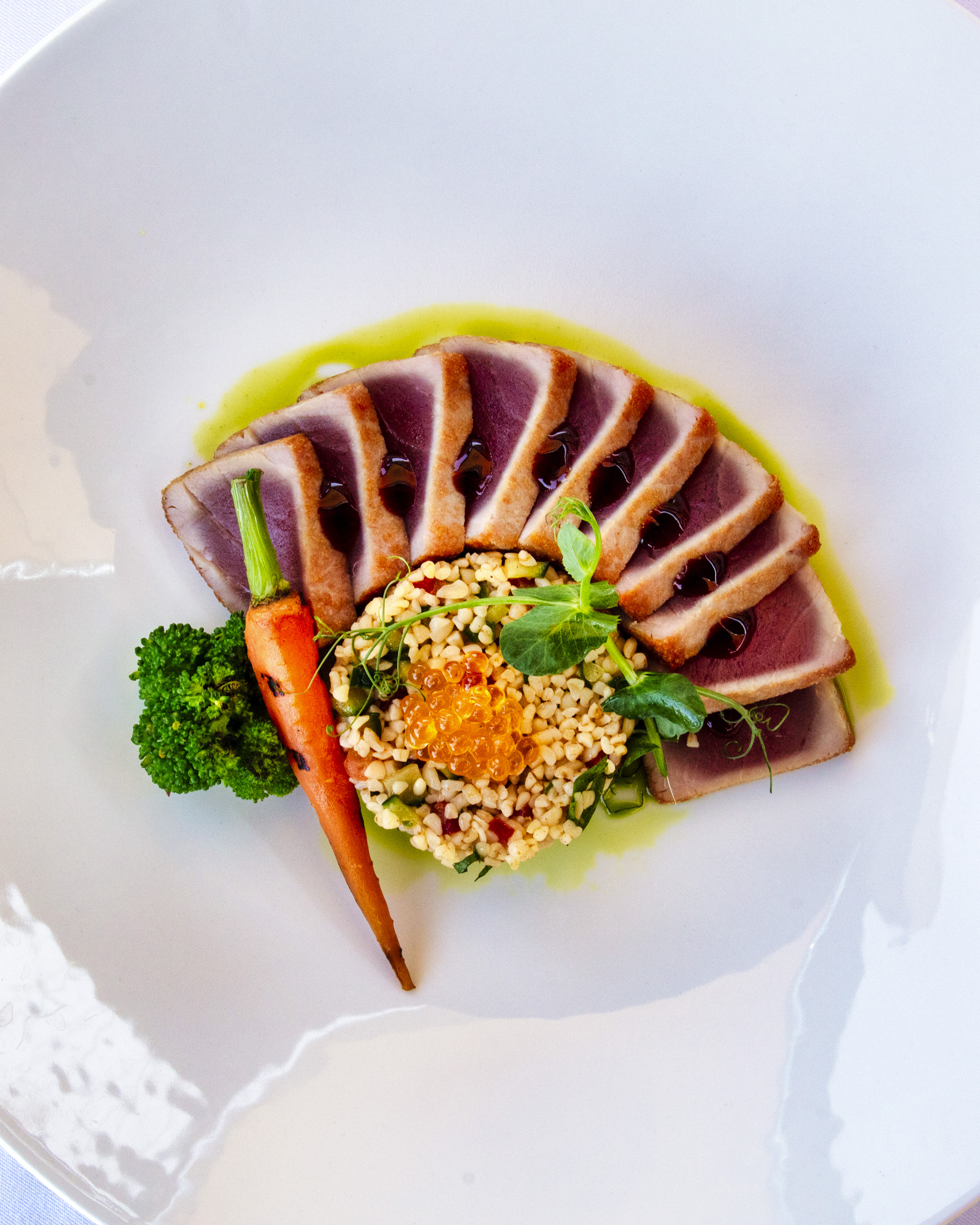Δοκιμάσαμε panna cotta παντζάρι με κρέμα τυριού και κινόα, μοσχαρίσιο carpaccio με γλυκές πιπεριές δάκρυ, καπαρόμηλα, φλούδες γραβιέρας, κάσιους και βινεγκρέτ μουστάρδας, ταλιάτα τόνου με αρωματικό ταμπουλέ και κρέμα βαλσάμικο και σιγοψημένο χοιρινό φιλέτο με πατατόπιτα, γαρνιτούρα λαχανικών και σάλτσα πράσου με λιαστή ντομάτα. Εξαιρετικό και το επιδόρπιο, όμως –με μους χαλβά πάνω σε τραγανό κουραμπιέ με γλυκό κουταλιού παντζάρι και αφρό από μανταρίνι.