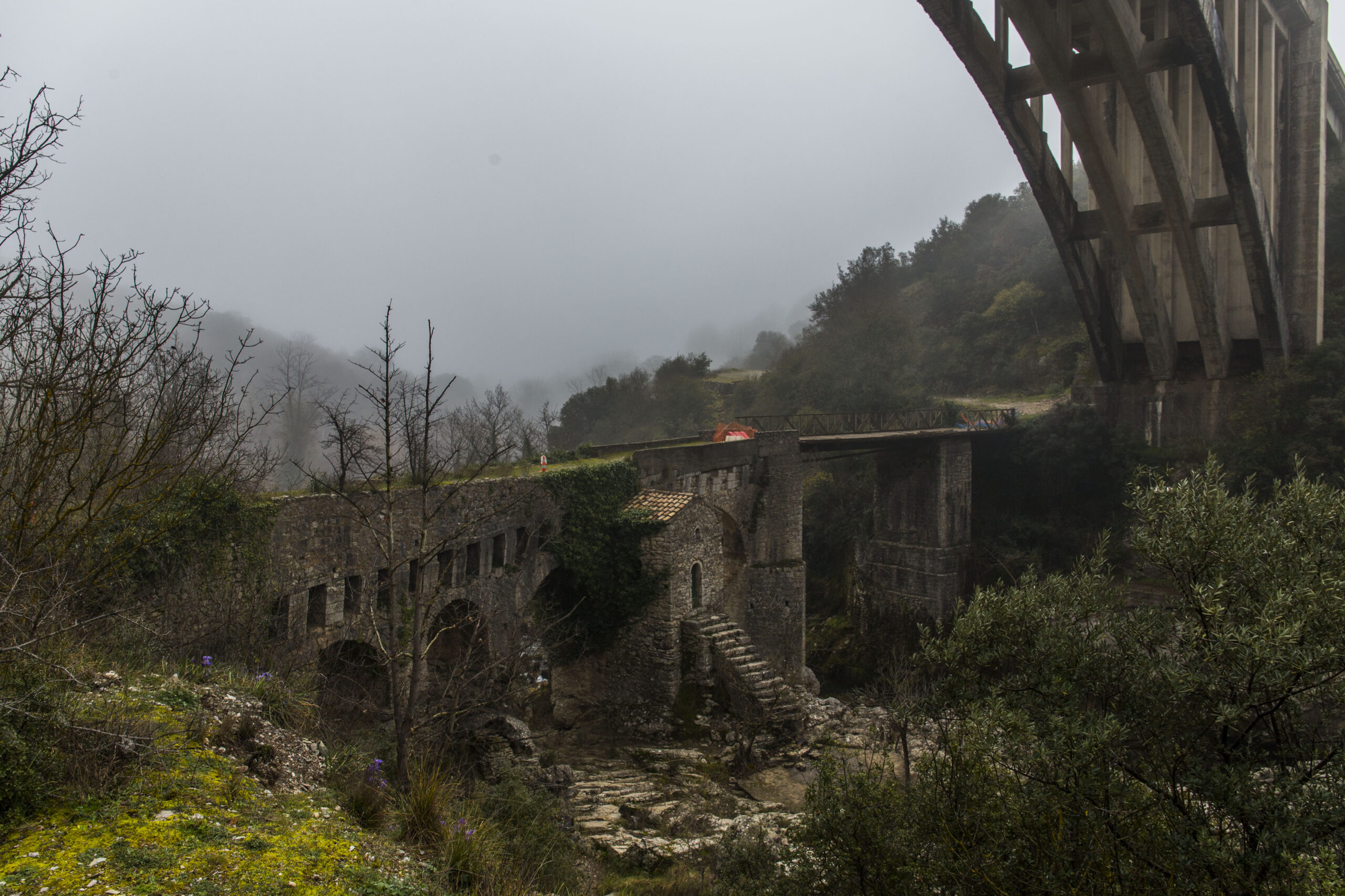 Κοιτώντας πάνω από την ψηλή γέφυρα ψάχνουμε τρόπο να κατέβουμε και διαπιστώνουμε ότι υπάρχει ένας χωματόδρομος από κάθε πλευρά. Ο πρώτος καταλήγει ακριβώς στο γεφύρι, ωστόσο οι αρμόδιοι έχουν βάλει απαγορευτική σήμανση και έτσι το περπάτημα πάνω στις σάπιες σανίδες της γέφυρας είναι αδύνατο. Ο δεύτερος χωματόδρομος θα μας φέρει από την άλλη μεριά, εκεί όπου στη βάση μιας καμάρας φωλιάζει το εκκλησάκι της Παναγίας. Είχε συγκεκριμένο λόγο ύπαρξης, αφού οι βυζαντινοί συνήθιζαν να τα φτιάχνουν για να «φυλάνε» τα γεφύρια.