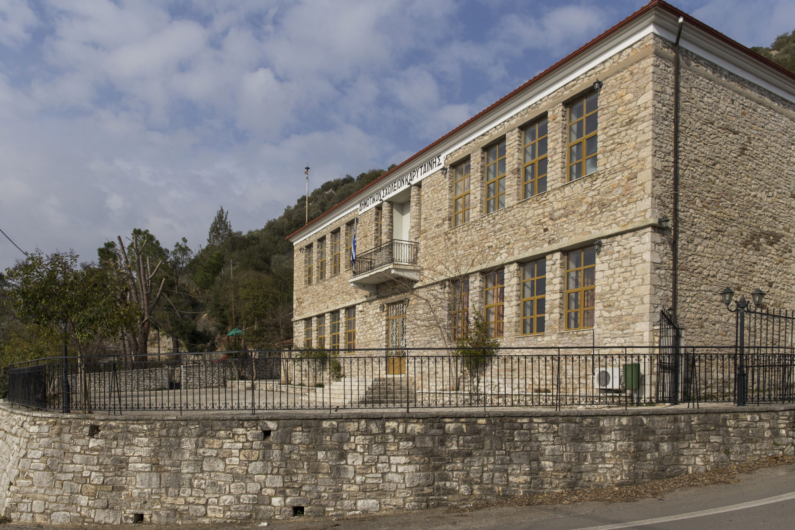 Ξεκινάμε τη βόλτα από την είσοδο του χωριού με τη χαρακτηριστική κρήνη του Σπολάτη για να δούμε στη συνέχεια το μεγάλο πέτρινο κτίριο του δημοτικού σχολείου. Το διδακτήριο χρονολογείται από την εποχή της ίδρυσης του ελληνικού κράτους, μόρφωσε πολλές γενιές Καρυτινών, όμως σήμερα οι μαθητές μετριούνται στα δάχτυλα. Απέναντι βρίσκεται η εκκλησία του Αγίου Αθανασίου.