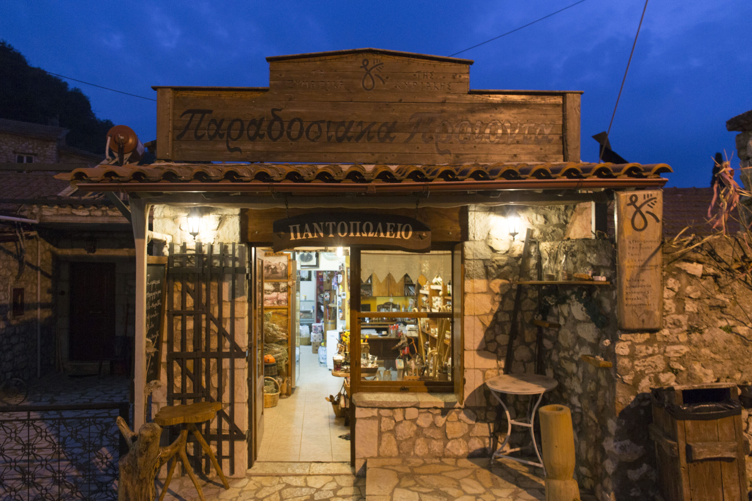 Στο κεντρικό πετρόκτιστο σοκάκι θα μπούμε για τις απαραίτητες προμήθειες στο καλοφτιαγμένο «παντοπωλείο» της Κυριακής, με τα παραδοσιακά προϊόντα -κάποια από τα οποία φτιάχνει η ίδια (τηλ. 697 4754084, www.tazymarikatiskyriakis.gr).