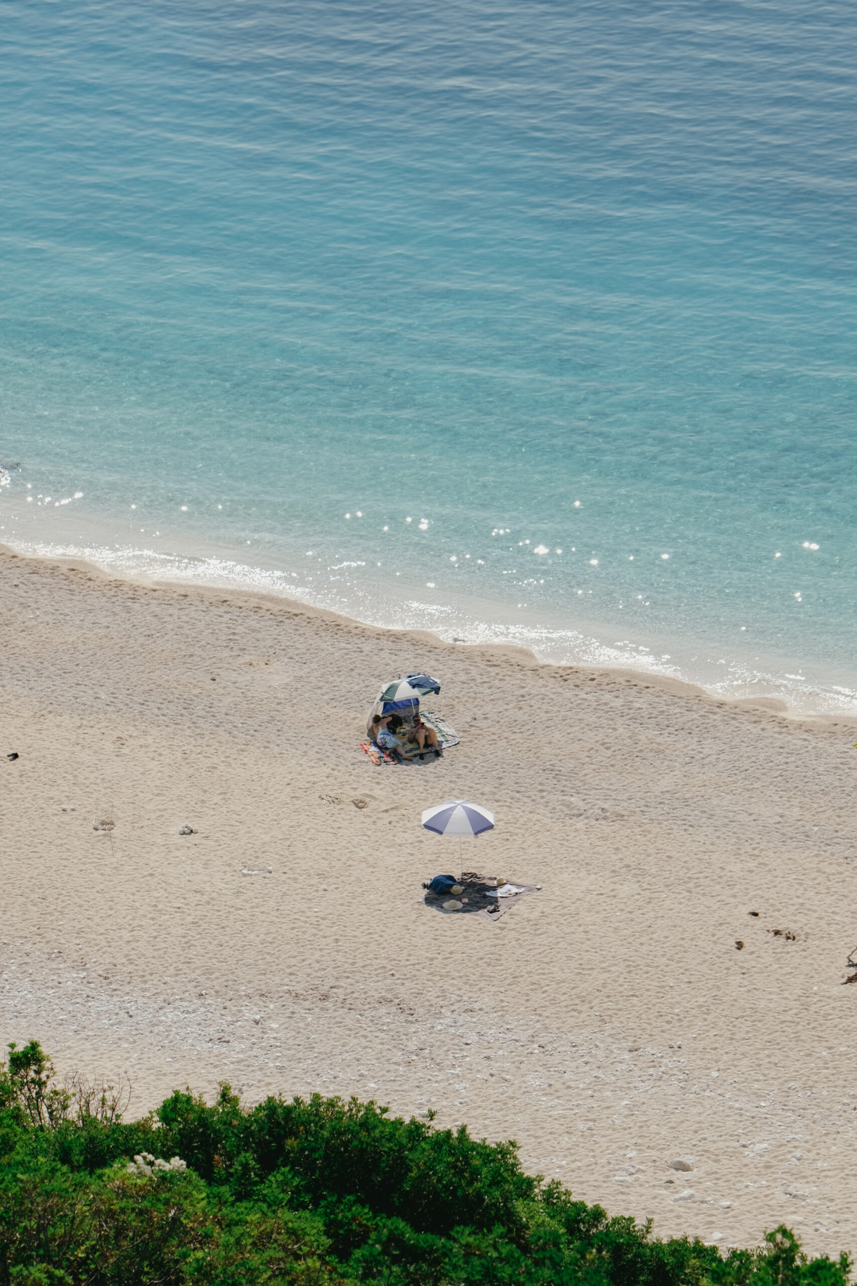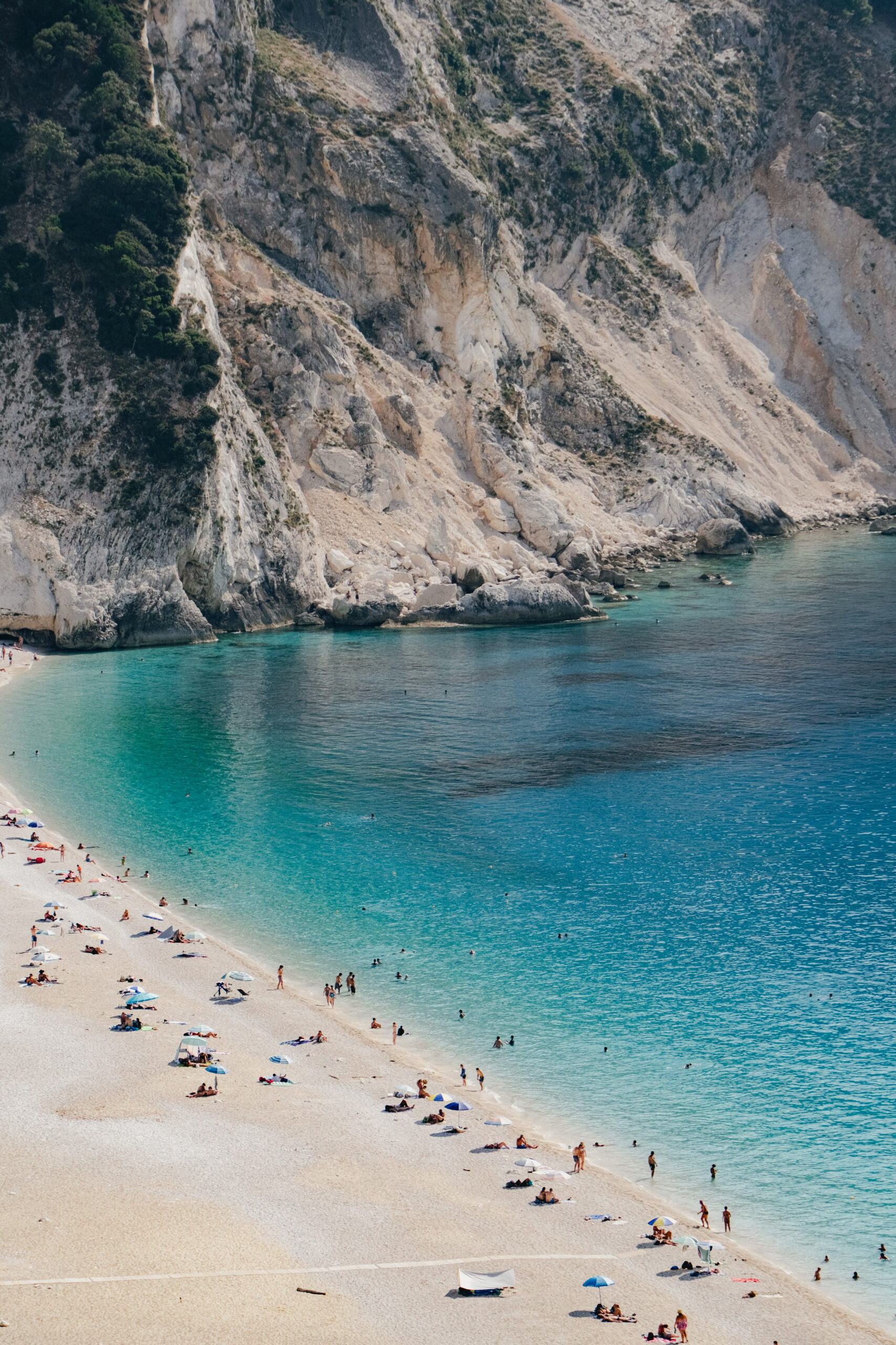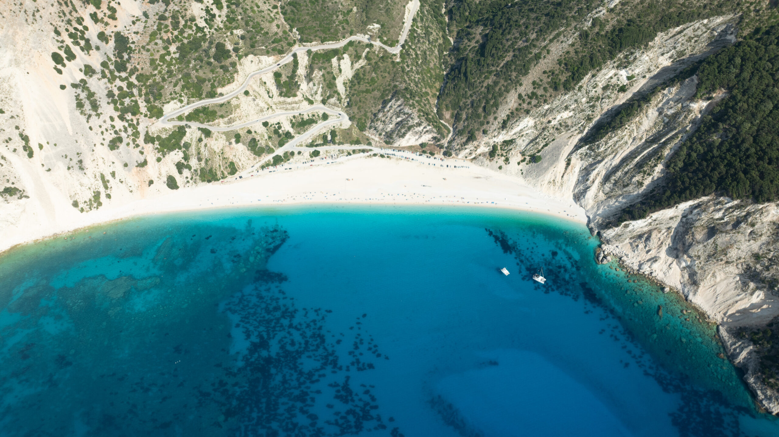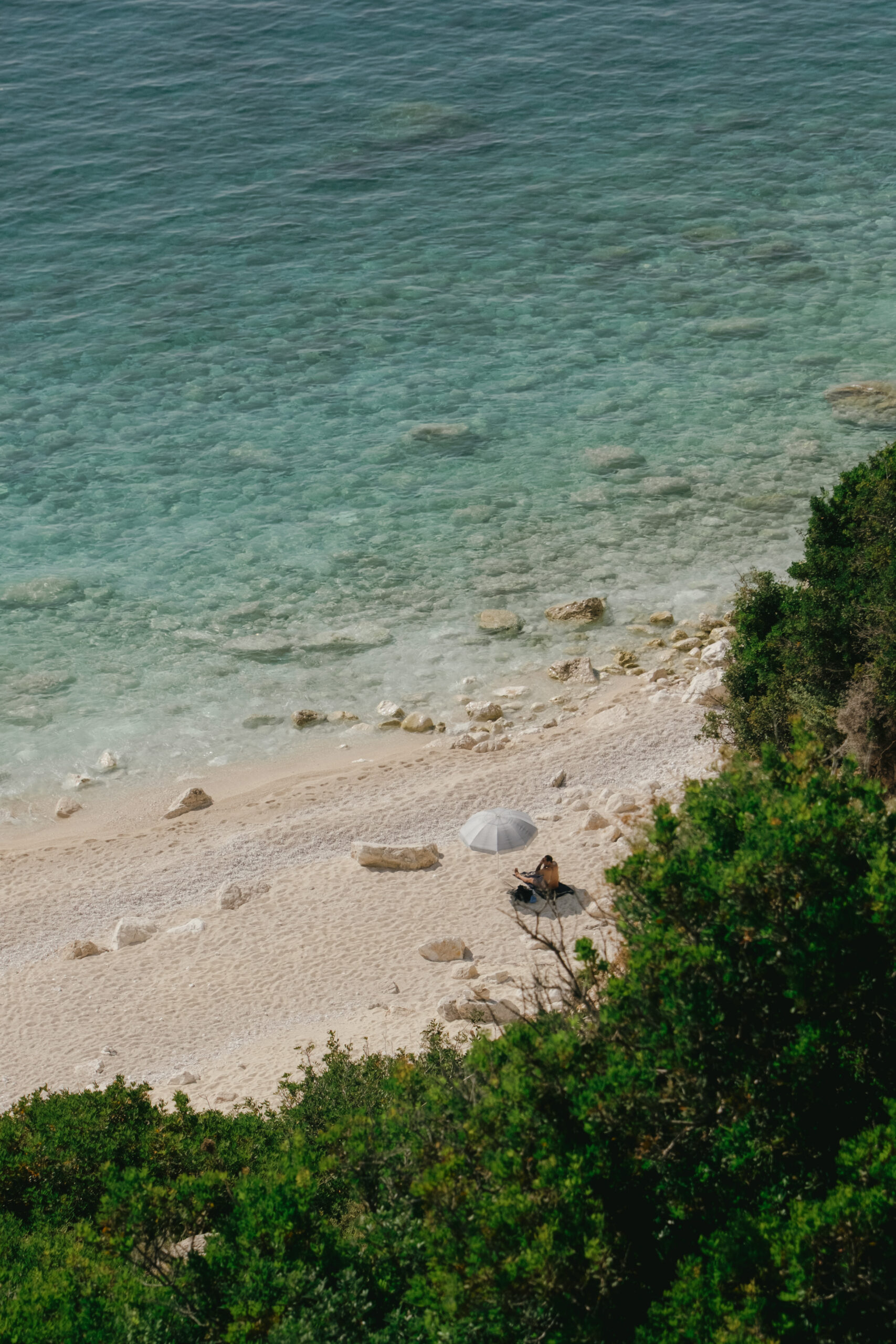 Με κάθε στροφή, το τοπίο αποκαλύπτεται σταδιακά, σαν σκηνές από ένα επικό έργο τέχνης που ξετυλίγεται μπροστά στα μάτια σας. Όταν τελικά φτάνετε στο «μπαλκόνι» της παραλίας, η θέα που ανοίγεται μπροστά σας είναι συγκλονιστική: μια μακριά λωρίδα λευκής άμμου και βοτσάλων που αγκαλιάζεται από νερά τόσο καθαρά και τιρκουάζ, που μοιάζουν με υγρό κρύσταλλο.