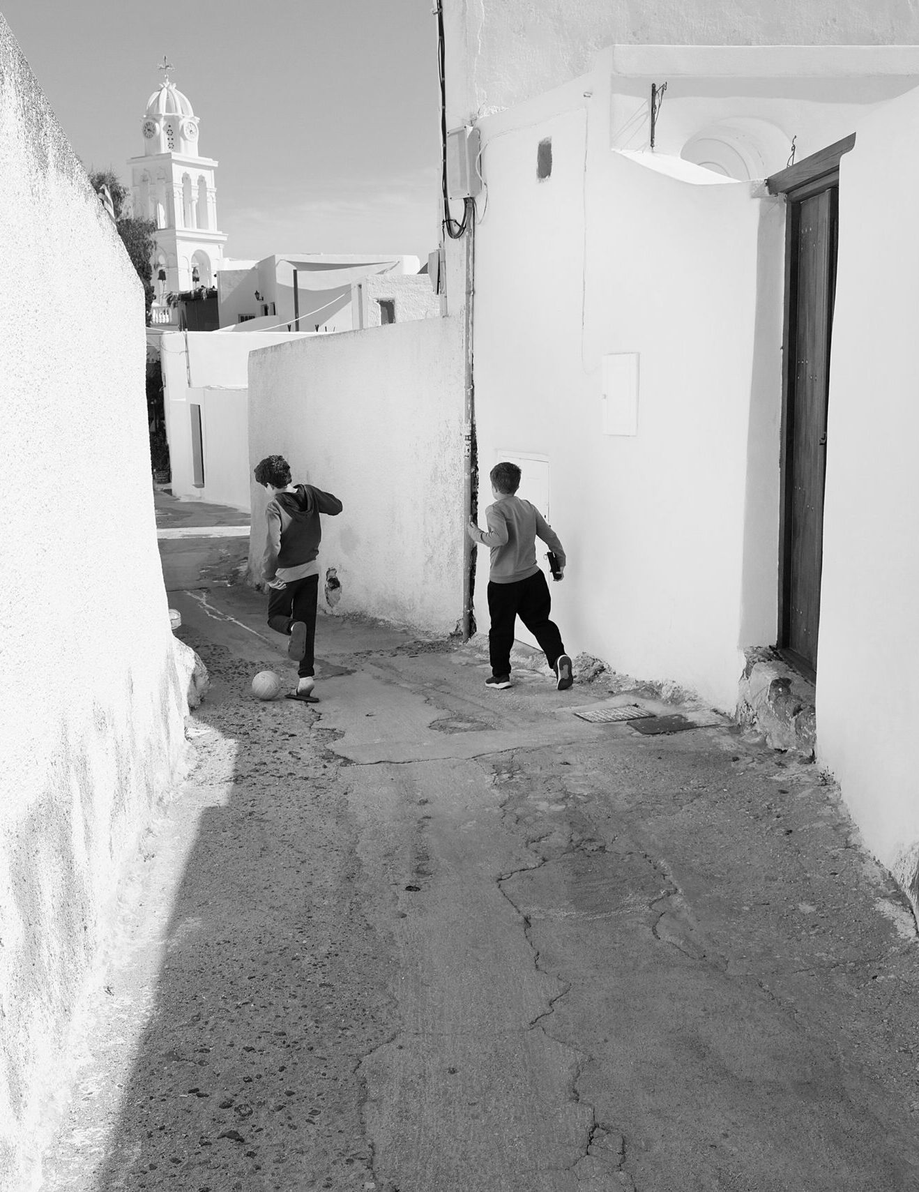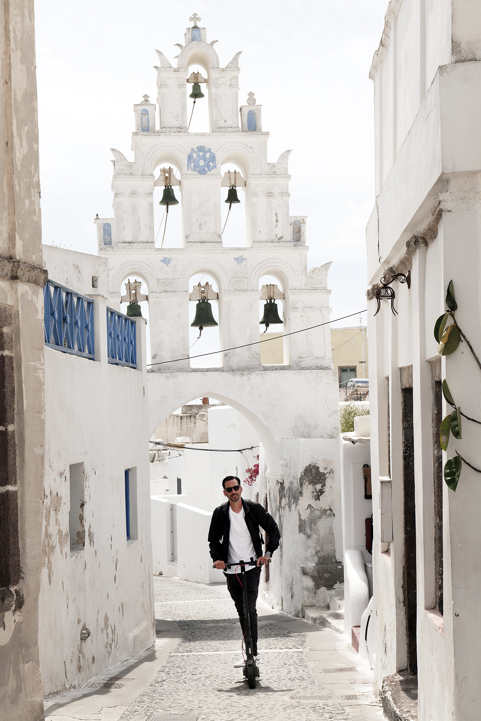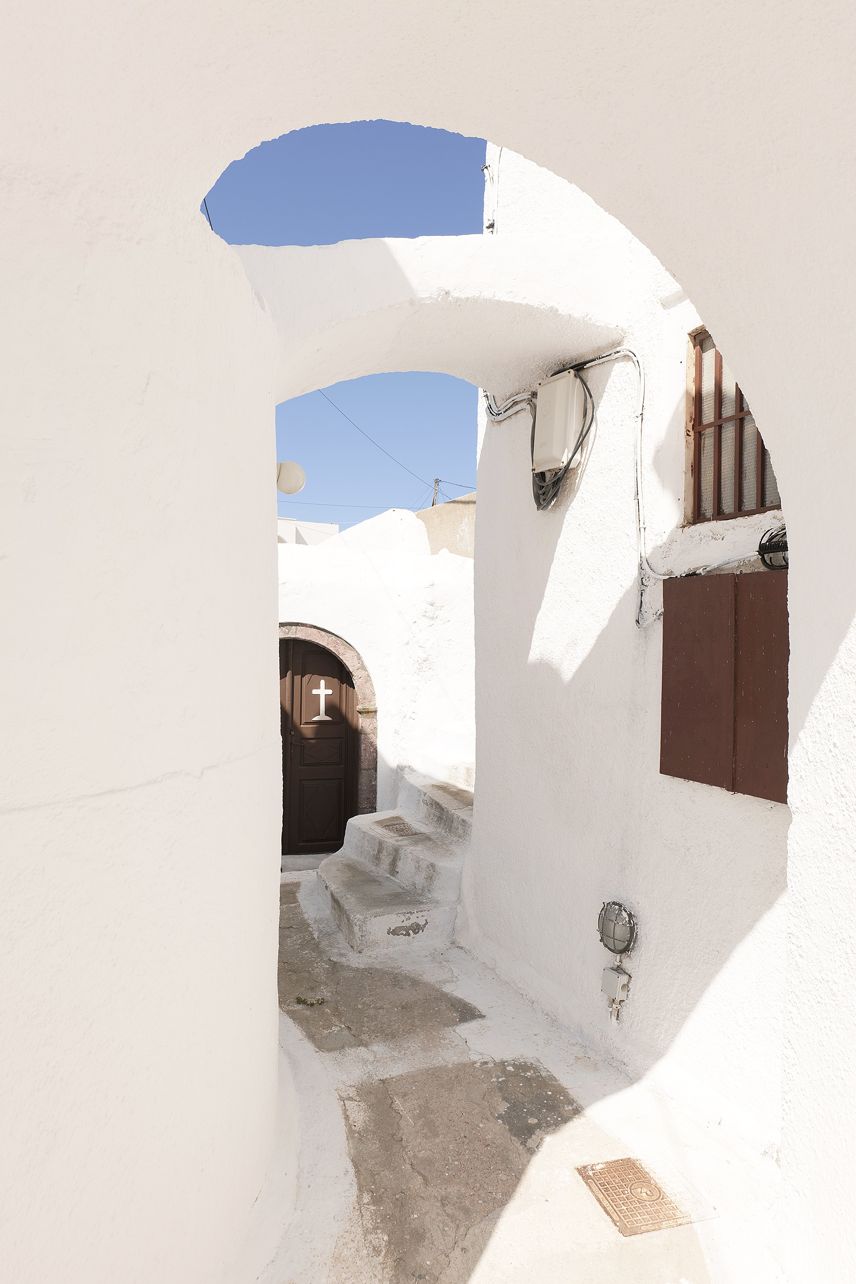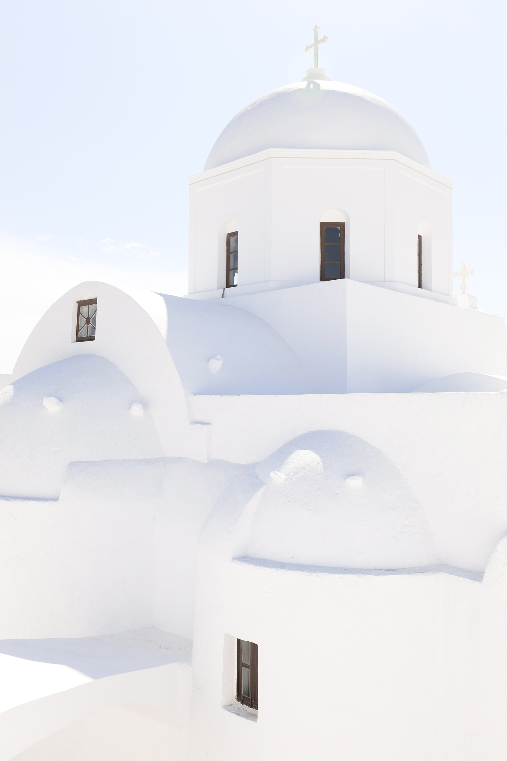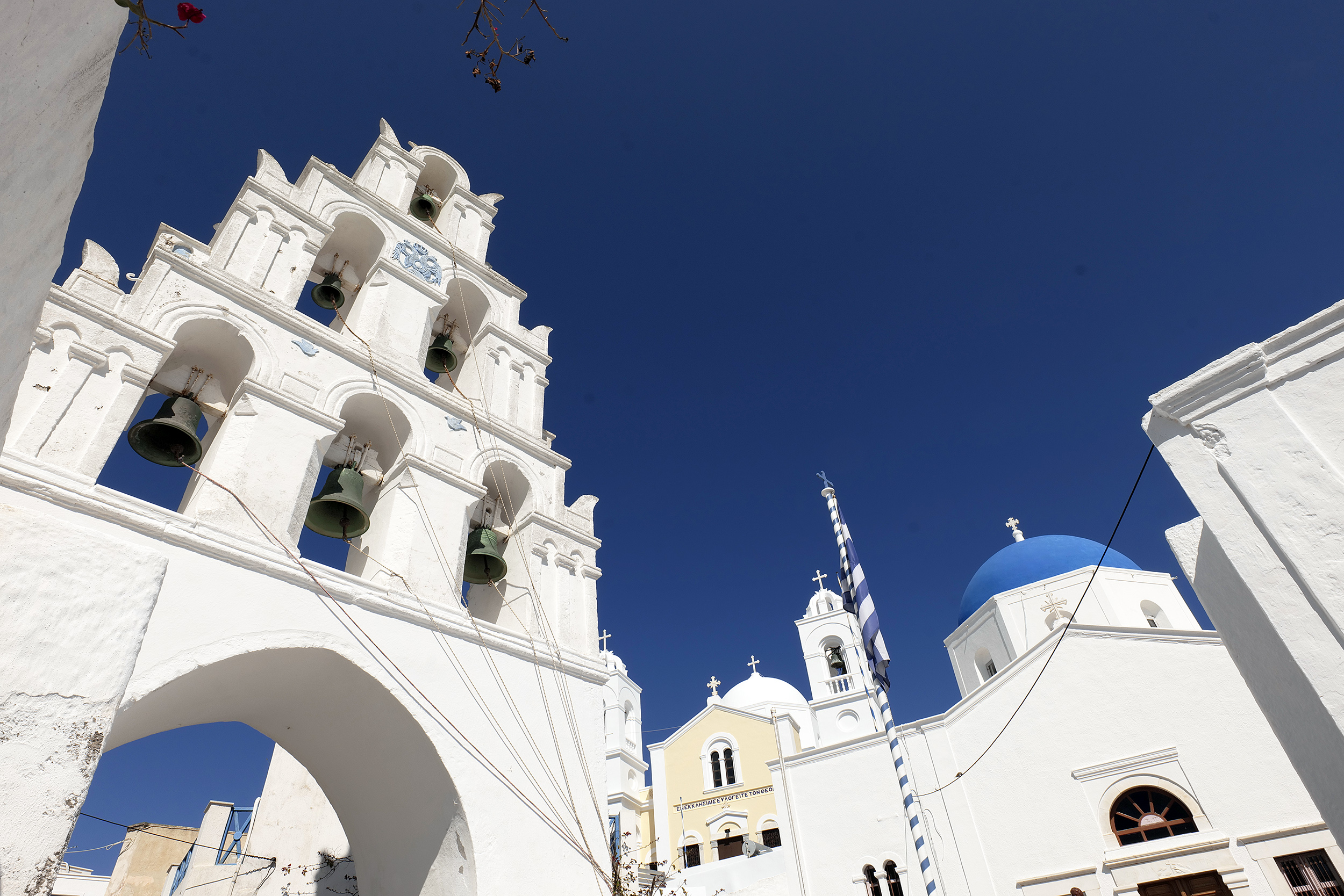 Ανηφορίζοντας χωρίς προσανατολισμό, σε σοκάκια στρωμένα με πέτρα και σκαλιά που τυφλώνουν από την αντανάκλαση του ήλιου στο λευκό, φτάνεις σε ζωηρόχρωμους μπλε ή κάτασπρους τρούλους, αλλά και στο μεγαλοπρεπή ναό των Αγίων Αναργύρων, τα ονόματα των οποίων είναι γραμμένα σε καθένα από τα δίδυμα κωδωνοστάσια που επιβλέπουν όλο το χωριό και που θα θαυμάσετε από την αυλή του παραδοσιακού καφενείου. Εικόνες σαν αυτές, μαζί με μία ακόμη περίτεχνη πύλη-καμπαναριό -αυτή των Εισοδίων της Θεοτόκου ή Παναγίας της Τρανής με το εξαιρετικό ξυλόγλυπτο τέμπλο, τις παλιές ρωσικές εικόνες από τον Οδησσό και το μεταβυζαντινό καλεντάρι με τις 365 μινιατούρες αγίων – μία για κάθε ημέρα του χρόνου, του σκαρφαλωμένου ψηλά Αγίου Αντωνίου ή του παρεκκλησίου του Αγίου Νικολάου που στέκει αγέρωχο στο μονοπάτι που οδηγεί στην παραλία της Πλάκας και ατενίζει την Καλντέρα, συνθέτουν την εικόνα ενός χωριού εκπληκτικής αρχιτεκτονικής.