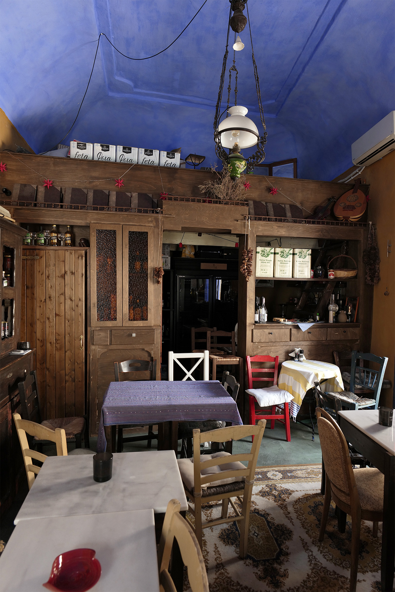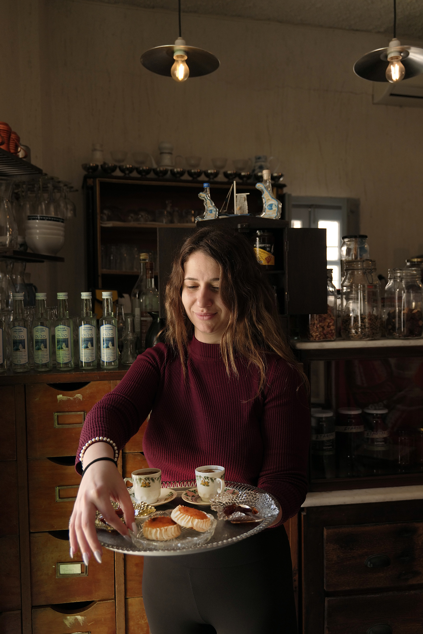 Οι νόστιμοι μεζέδες πηγαινοέρχονται ασταμάτητα από την κουζίνα στα τραπέζια, μαζί με μπίρες από τις μικροζυθοποιίες της Σαντορίνης και ούζο που αποστάζεται στο νησί. Στον μαρμάρινο πάγκο που σκεπάζει ένα ακόμη ξύλινο μπουφέ από τη Βέροια, δίσκοι γεμίζουν με ντοματοκεφτέδες, φάβα και τηγανητά κεφτεδάκια, αχνιστή μανιταρόσουπα, σιγομαγειρεμένη τηγανιά που κάνει όλο το καφενείο να μοσχοβαλά και βουτυράτο ξινόχοντρο που έρχεται απ΄ευθείας από την Κρήτη. Όλα από τα χέρια της φιλόξενης Μάγδας -με δύο ακόμη κοπέλες να βοηθούν το καλοκαίρι-, που άνετα θα μοιραστεί το τραπέζι μαζί σας αλλά και θα σας συμβουλεύσει να αφήσετε χώρο για το καταπληκτικό γλυκό του κουταλιού σταφύλι και τα παραδοσιακά μελιτίνια της κυρίας Μαργαρίτας από το γειτονικό χωριό.