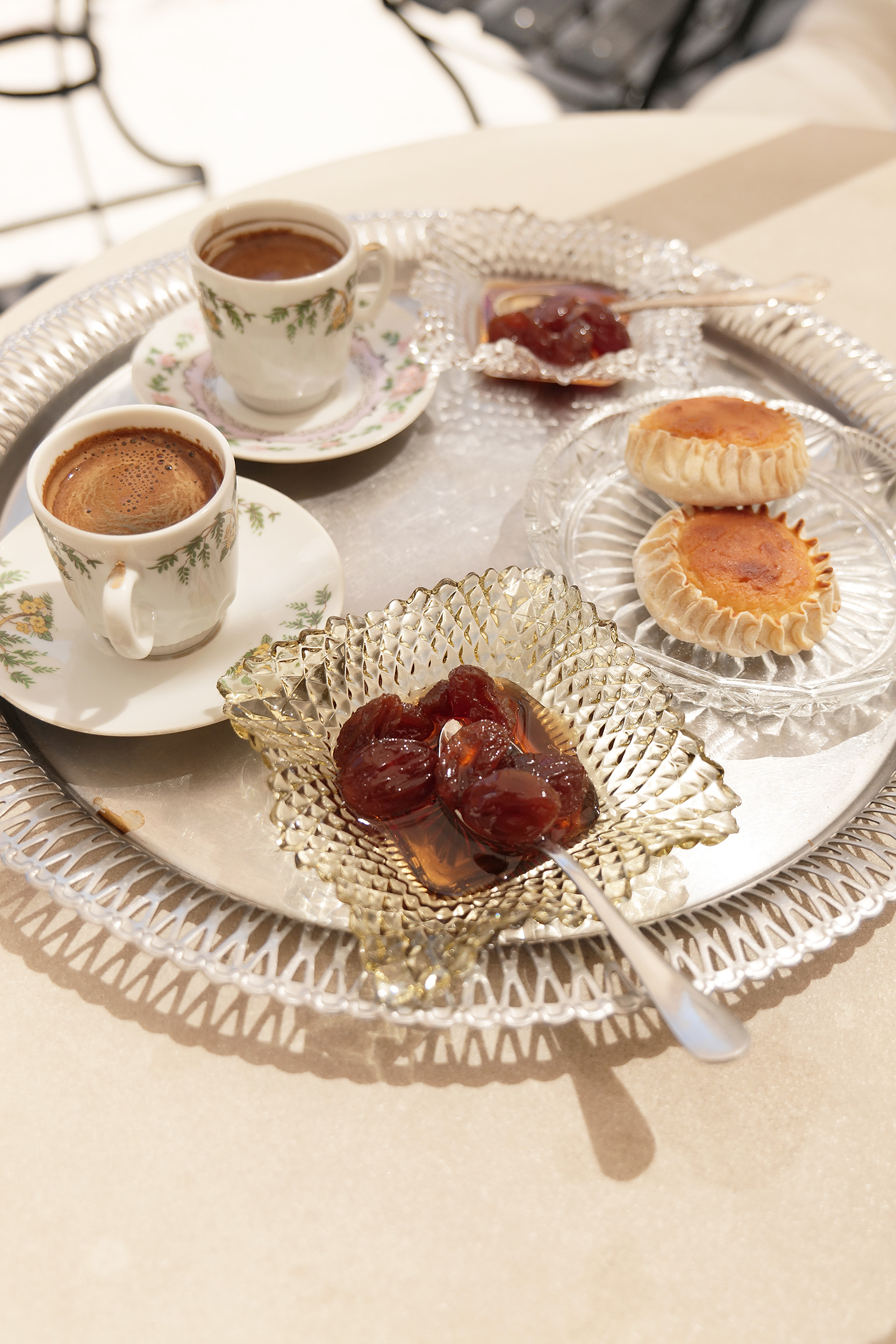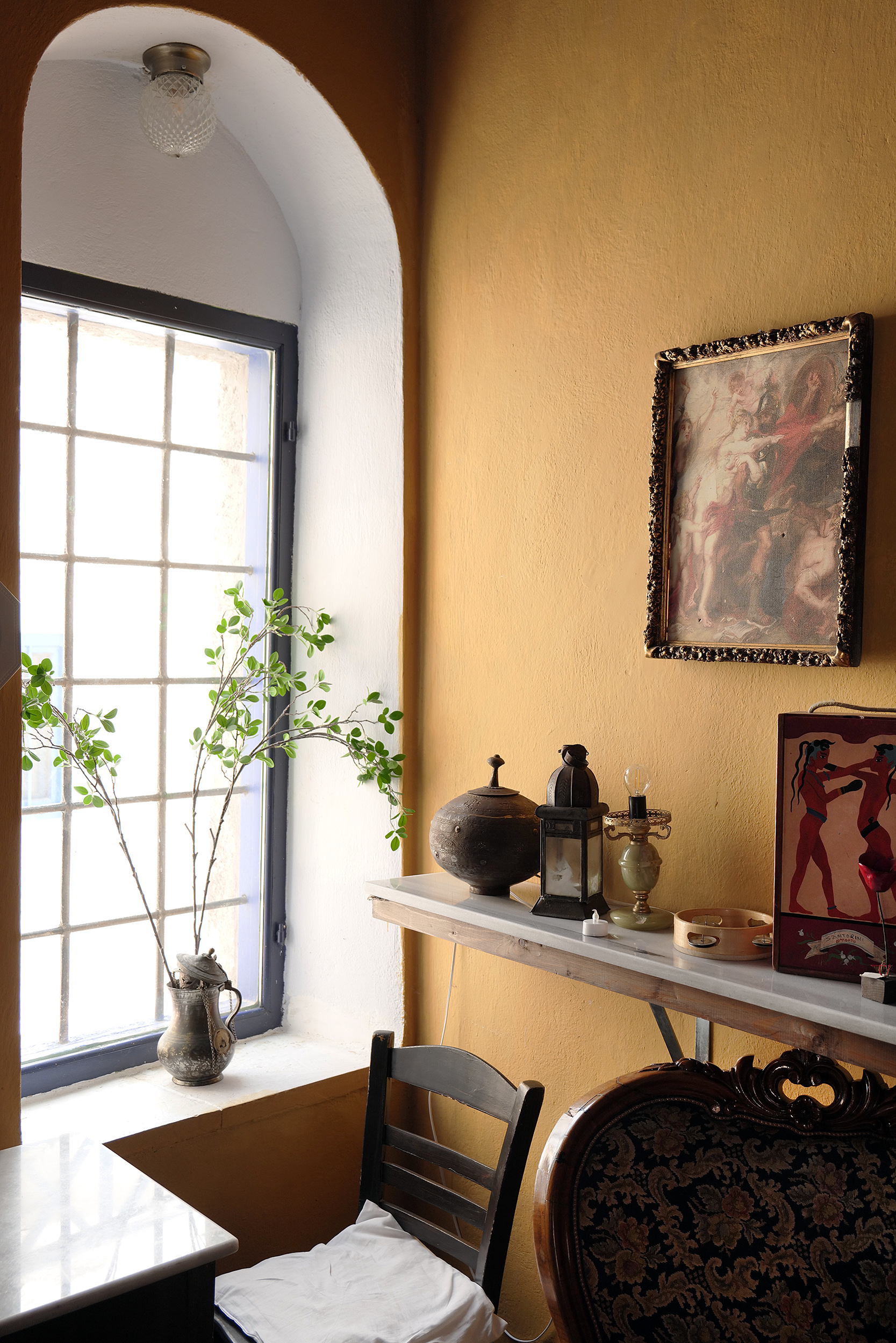 Στο δικό μας ανοιξιάτικο ταξίδι στη Σαντορίνη, αυτή ήταν και η πρώτη στάση, το «Παραδοσιακό Καφενείο Μεγαλοχώρι», με τη βοτσαλωτή αυλή, τα ανομοιόμορφα τραπέζια και τα πολύχρωμα μαξιλάρια, την έξω καρδιά ιδιοκτήτρια Μάγδα στην υποδοχή και δίπλα της τον πιστό της σκύλο Σα και τον λευκό γάτο Μπετόβεν, να πιστοποιούν αμέσως ότι βρισκόμαστε σε ένα χωριό φιλόξενο, απροσποίητο, σχεδόν ανέγγιχτο από το χρόνο. Παρότι το καφενείο-επίκεντρο της κοινωνικής ζωής του Μεγαλοχωρίου δεν λειτουργεί παρά λίγα μόνο χρόνια, φαίνεται να έχει να αφηγηθεί πολλές ιστορίες από τα παλιά. Ίσως είναι τα έπιπλα-οικογενειακά κειμήλια από τη Βέροια που γεμίζουν το εσωτερικό και που έφερε μαζί της η χαμογελαστή Μάγδα, ίσως κι εκείνα που της προσέφεραν οι ίδιοι οι κάτοικοι του χωριού όταν το κατάστημα γυναικείων αξεσουάρ που σκόπευε να ανοίξει στο σημείο αυτό, αποφάσισε να κάνει τελικά καφενείο.