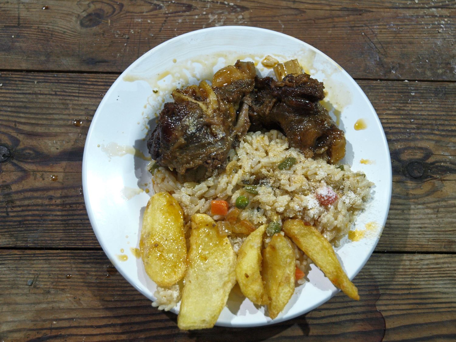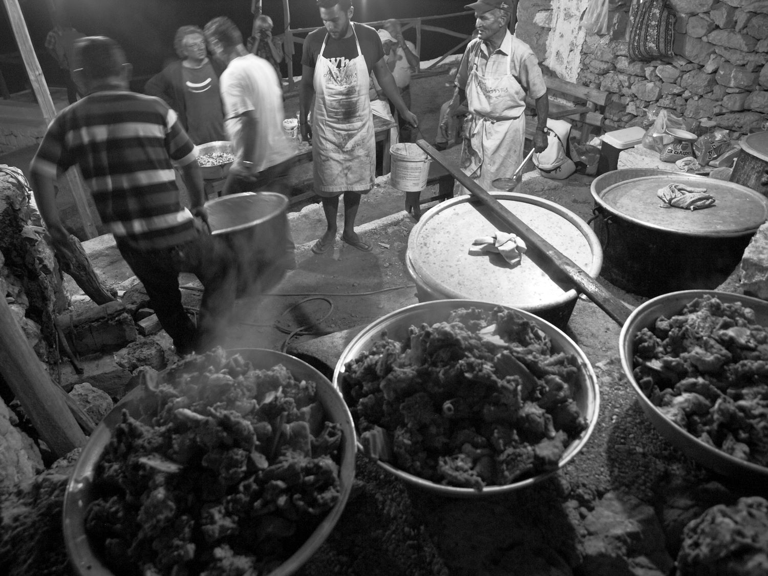 Τι είχαν, όμως, μέσα τα άδεια πιάτα που χτυπούν με τα πιρούνια τους οι γλεντιστές; Φρόντισε γι’ αυτό ο Ηλίας Λιορεΐσης και οι βοηθοί του παραμάγειρες. Από το πρωί της παραμονής μέχρι την απόλυση του εσπερινού, πολεμούσαν αργαδιά πάνω στα μεγάλα καζάνια για να ετοιμάσουν το φαγητό του γλεντιού. Από νωρίς τσιγάρισε τις μερίδες από κατσίκια και τις έβρασε σε νερό και κρασί μαυροδάφνη για να βγάλει ζωμό για το πιλάφι. Παλιά δεν έκαναν πιλάφι, αλλά μακαρόνια που φυσικά έπλαθαν οι γυναίκες της Ολύμπου, χειροποίηση που συνεχίζουν ακόμη. Ανάμνηση εκείνης της συνήθειας αποτελεί ίσως το κριθαράκι που τσιγαρίζεται στην αρχή στον πάτο του καζανιού σε φυτικό βούτυρο και μετά σμίγει με μια ποικιλία χορταρικών και μυρωδικών (ψιλοκομμένη πράσινη πιπεριά, ντομάτα φρέσκια, παλιό κρεμμύδι, μαϊντανό, σκόρδο) πελτέ αραιωμένο με ζωμό κρέατος, αλάτι θαλασσινό χοντρό του βράχου και πιπέρι. Στο μεταξύ ο μάγειρας έχει μετρήσει το ζωμό των κρεάτων με τον μαστραπά και το προσθέτει ύστερα από το ρύζι. Το ιδιαίτερο εδώ είναι ότι βάζουν στο πιλάφι μια ακόμα ποικιλία λαχανικών, μπιζέλια, φασολάκια και καρότα ψιλοκομμένα όλα. Το πιλάφι, μαζί με το κατσίκι και τις πατάτες τηγανιτές είναι το φαγητό που κρατά τους γλεντιστές δυνατούς στο γλέντι, μέχρι την ώρα που ο παπά-Γιάννης θα σημάνει την καμπάνα για τη λειτουργία, αλλάζοντας ρόλο. Αλλά, καμιά φορά, όταν το κέφι διατηρείται αμείωτο, η θρησκευτική λειτουργία μπλέκεται με τη μουσική του γλεντιού, που, ούτως ή άλλως, στην Όλυμπο, είναι ομοούσιες και αχώριστες.