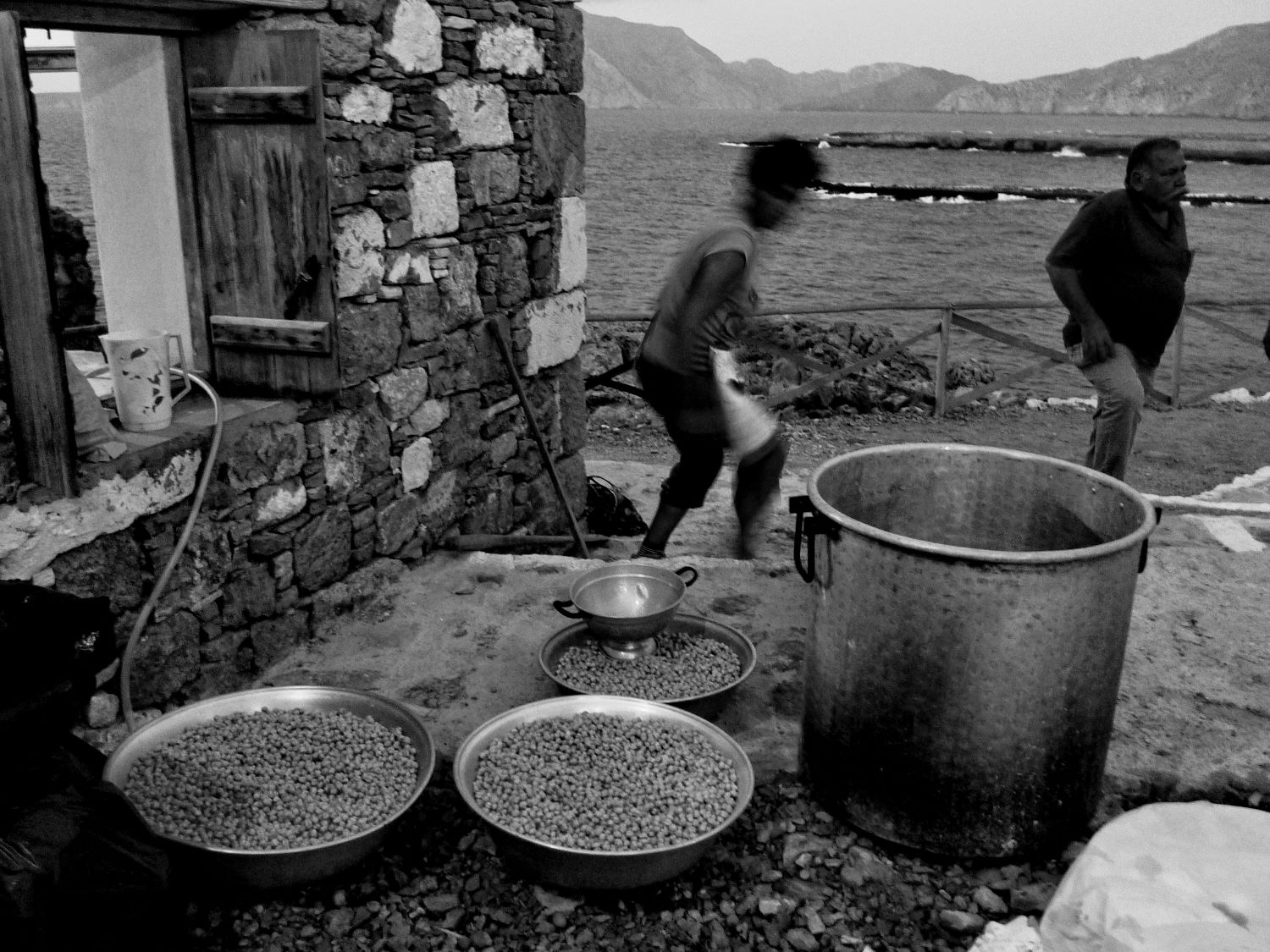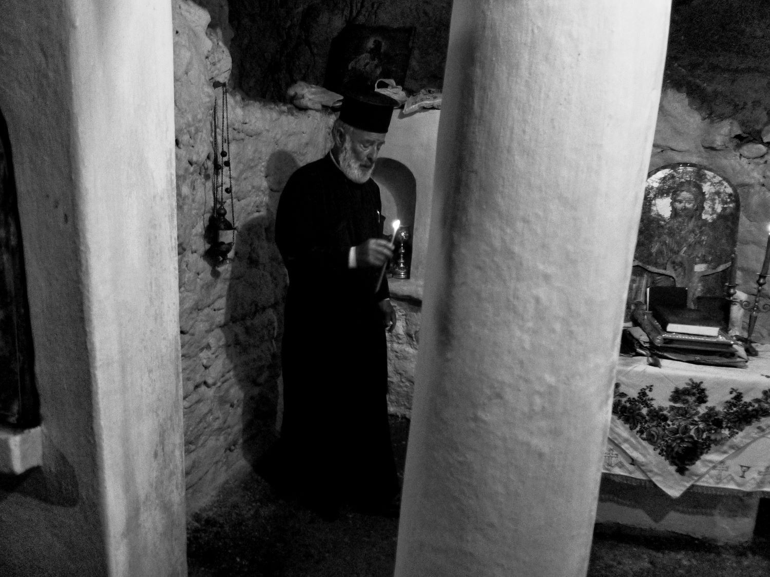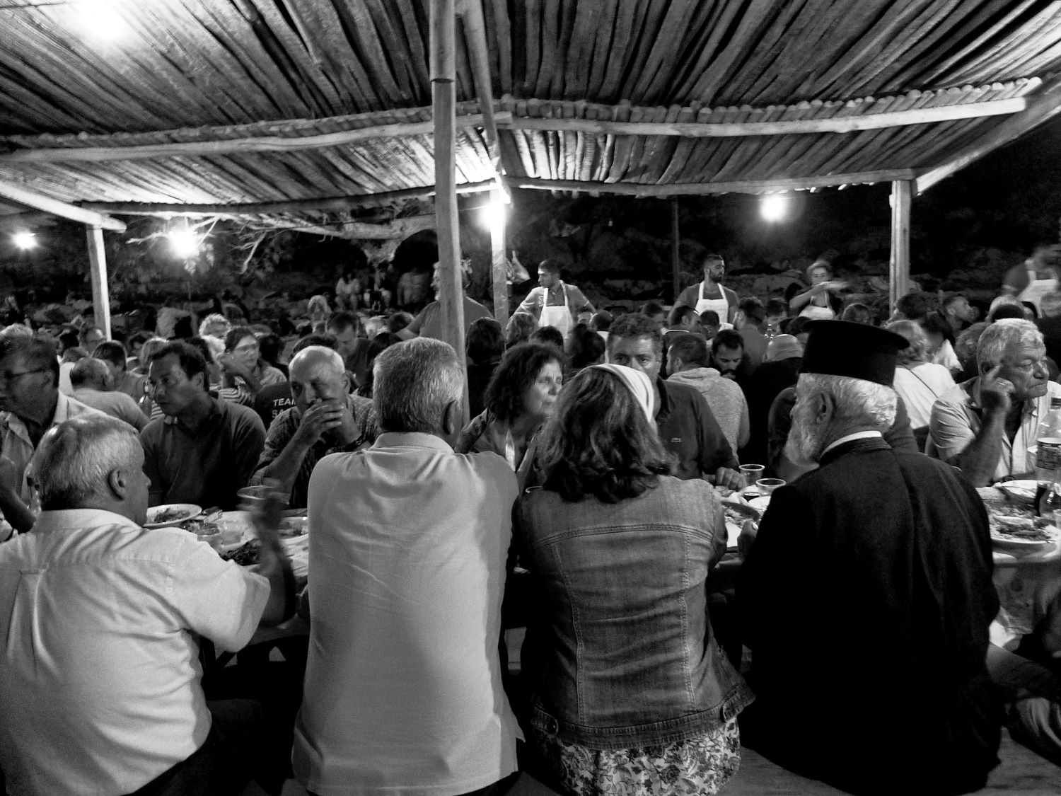 Πριν αρχίσει το γλέντι, ο παπα-Γιάννης στο απυρόβλητο του πορφυρού ηλιοβασιλέματος του Καρπάθιου πελάγους, μέσα στο υπόγειο σπήλαιο του Αϊ Γιάννη, βάζει το δοξαστικό εσπερινό, ρίχνοντας μπόλικο λιβάνι στο θυμιατό. Το αγίασμα σταλάζει στην πέτρινη κρήνη στο κέντρο του σπηλαίου και το λιγοστό φως που εισβάλει από το έμπα, σε αρμονία με τη φλόγα των κεριών, κάνει τα πρόσωπα γύρω να μοιάζουν με έναν μεταφυσικό χορό. Εδώ, όλα κινούνται πέρα από τα όρια των γνωστών και συνηθισμένων. Ακόμα και οι φουρνισμένοι και αυτοί στα ευωδιαστά «φρούανα» άρτοι, έτσι όπως τους κρατούν πάνω στο κεφάλι τους (τυλιγμένους σε κεντημένους μποξιάδες, μέσα σε μυρτιές και γεράνια) οι γυναίκες με τις παραδοσιακές στολές τους, καθώς κατεβαίνουν τη σκάλα που κρέμεται πάνω από την βραχώδη ακτή.
