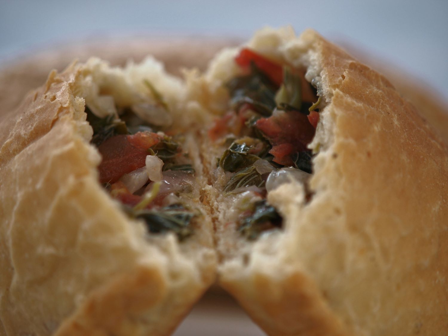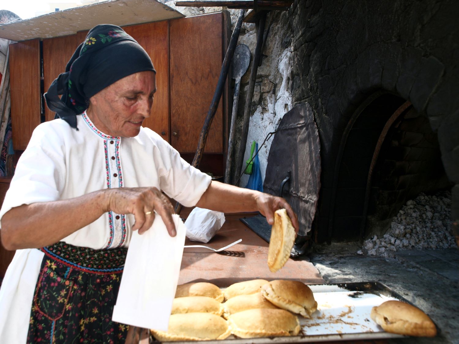 Δεν είναι μόνο οι πολύχρωμες ολυμπίτικες στολές που φορούν σχεδόν όλες οι γυναίκες (το «ερανί», βαθύ μπλε, καβάι οι νυμφευμένες και το σακοφούστανο οι ελεύθερες), αλλά και τα υφαντά στρωσίδια και τα δισάκια που είναι φορτωμένα στα γαϊδούρια και στα μουλάρια, που κάνουν αυτό το αστραφτερό ρυάκι γοητευτικό, καθώς κατηφορίζει από την Αυλώνα προς τη Βρουκούντα, από μια από τις θεαματικότερες διαδρομές που μπορεί να σου τύχει να περπατήσεις. Και βέβαια γι’ αυτά τα αρχαία μονοπάτια (όπως και στα διαστήματα μεταξύ των κοινών συμποσίων, το δείπνο μετά τον Εσπερινό και το γεύμα ανήμερα της γιορτής) υπάρχει το κατάλληλο προσφάι. Το λαχανοπίτι – οι ζυμαρένιες πίτες γεμιστές με χόρτα, ντομάτα, κρεμμύδι και ρύζι – κατοικοεδρεύουν στη συλλογική ανάμνηση και νοσταλγία. Το ζέστινο λαχανοπίτι που έβγαινε από τον παραδοσιακό φούρνο με τα ξύλα (τέτοιοι είναι ακόμη οι φούρνοι στην Όλυμπο, οικογενειακοί και δεν έχει ανοίξει ποτέ δημόσιος) το Σάββατο, όταν φούρνιζαν τα οικογενειακά ψωμιά ολόκληρης της εβδομάδας.