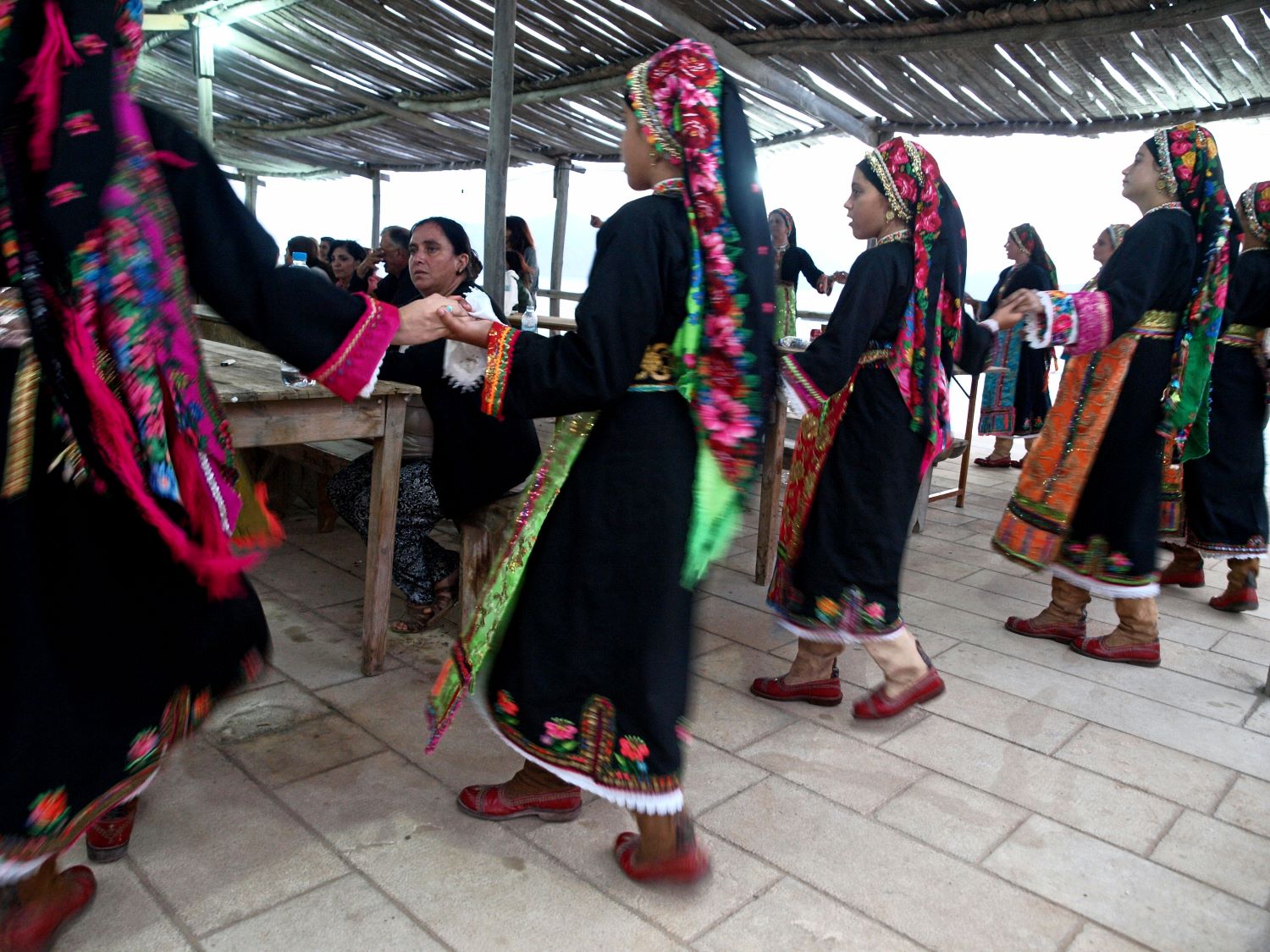 Αυτή η εικόνα μοιάζει αιώνια. Πολύχρωμες οι δίπλες του χορού και πολύχρωμες κι οι κοιμητέες δίπλα. Προσπαθείς να αρπάξει λίγο ο ύπνος έχοντας ακουμπισμένο το αυτί σου στο χώμα και ακούς και αισθάνεσαι το ποδοβολητό στο ρυθμό και τα βήματα του πάνω χορού. Κι όταν με το χάραμα σηκωθείς, πάλι βλέπεις την ίδια εικόνα που άφησες όταν πήγες να ξαπλώσεις κατάχαμα. Τα όργανα (η λύρα, η τσαμπούνα και το λαούτο) παίζουν στο κέντρο της ομήγυρης ανεβασμένα πάνω στις τάβλες του φαγητού. Γύρω τους κάθονται οι γλεντιστές και όλους μαζί τους περιτριγυρίζει ο κύκλος του χορού που δεν σταματά ποτέ. Όταν κάποιο από τα όργανα πρέπει να ξεκουραστεί, ο αντικαταστάτης του καθίζει δίπλα του και αρχίζει να παίζει και μόνο τότε σταματά εκείνος. Σχεδόν όλες οι κοπέλες φορούν με καμάρι την παραδοσιακή στολή που έχουν ράψει και κεντήσει η μητέρα ή η γιαγιά. Από τις πιο γλυκείς εικόνες στην Όλυμπο είναι όταν μια μεγαλύτερη «σκουφώνει» μια νεότερη, της φορά το μαντήλι, λευκό ή μαύρο, με τα μεγάλα ρόδα. Η κάθε, συγγενική συνήθως, ομάδα κοριτσιών, έχει επικεφαλής έναν άνδρα χορευτή, και περιμένει τη σειρά της να πιάσει μπροστά και να χορέψει στον κάβο του χορού. Όταν ολοκληρώσει τον κύκλο της, συνεχίζει να χορεύει στην πίσω άκρη του χορού.