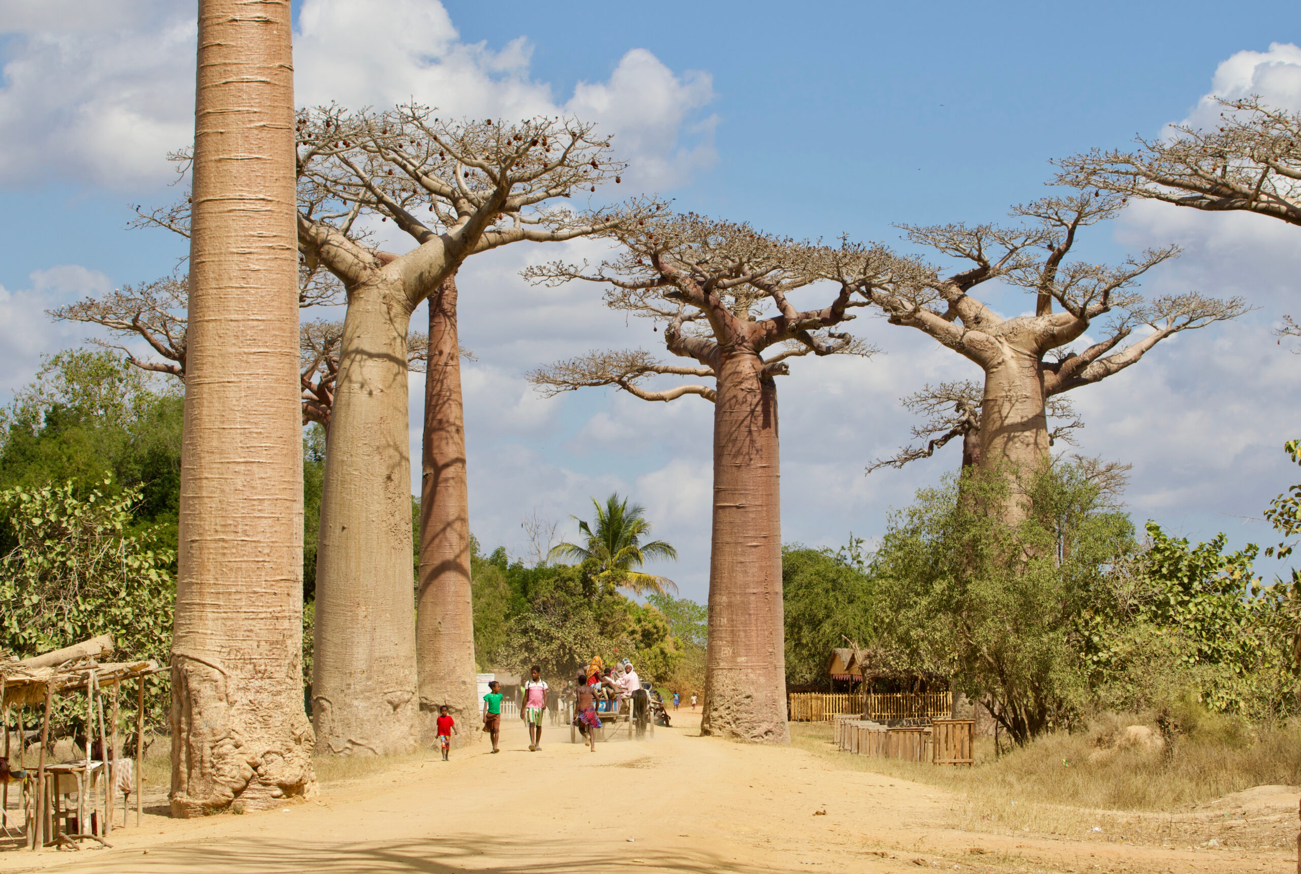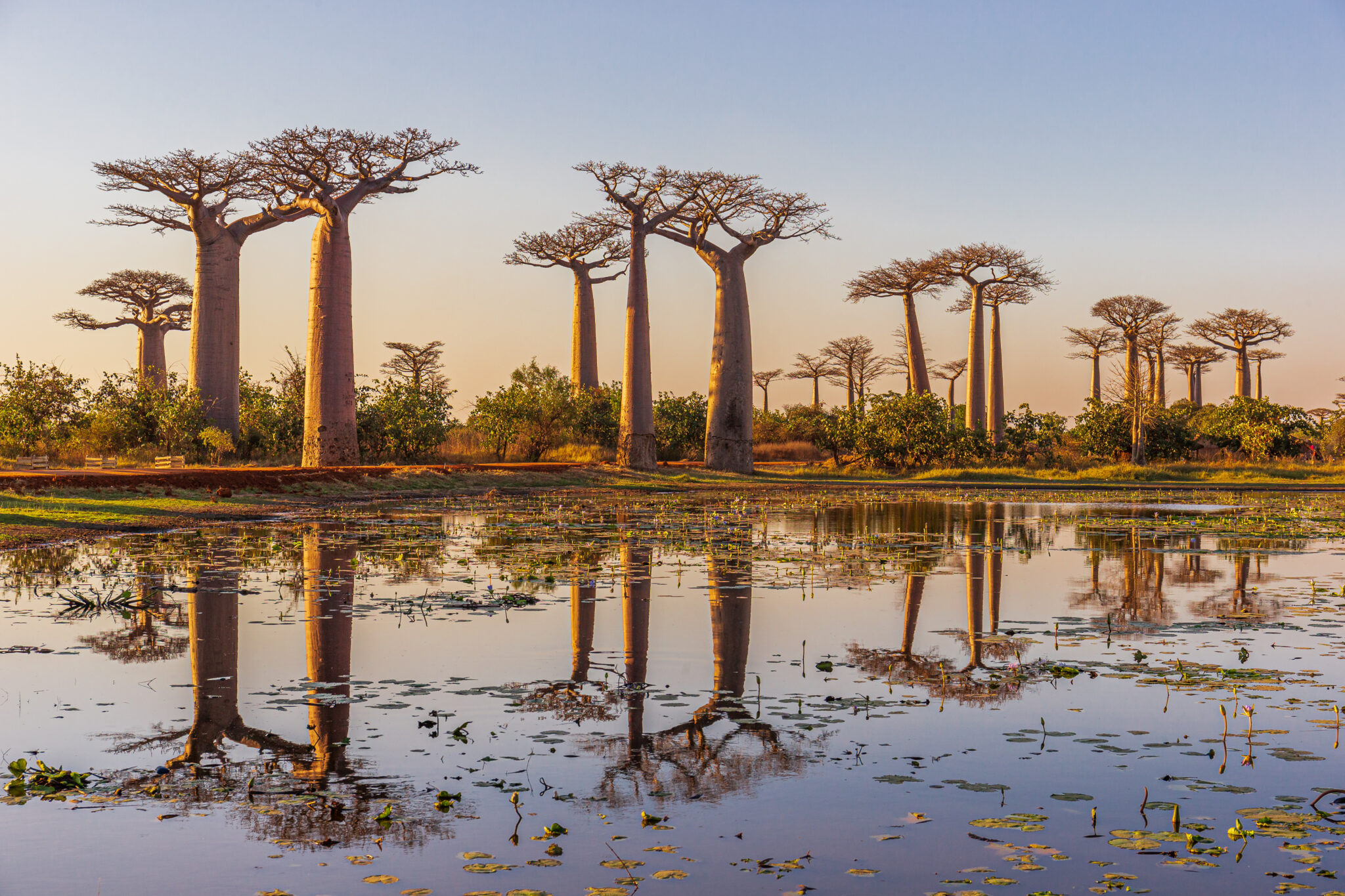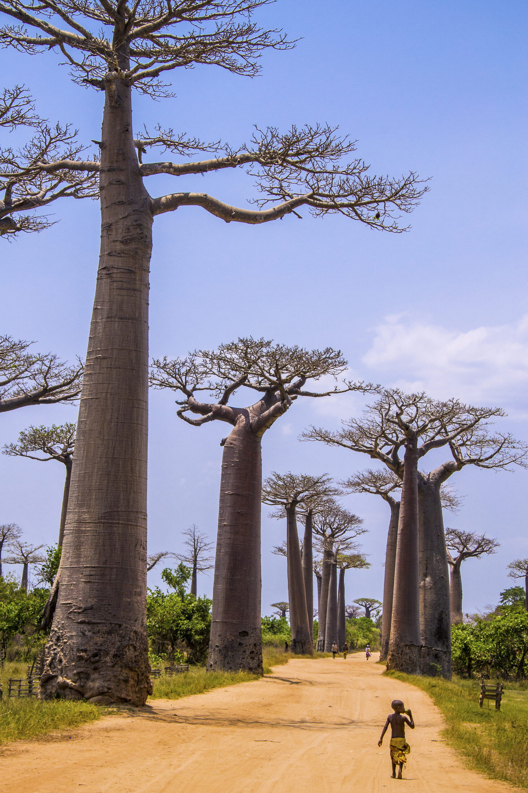Τα πελώρια δέντρα με ύψος που αγγίζει τα 30 μέτρα, ανήκουν στο είδος Adansonia grandidieri και γεμίζουν πληθωρικά με τους χοντρούς κορμούς τους τις δύο πλευρές του χωματόδρομου που ενώνει την Morondava και την Belon’i Tsiribihina. Στη μέση ενός γνήσιου αφρικανικού τοπίου με θαμνώδεις εκτάσεις και μαγευτικά πορτοκάλι ηλιοβασιλέματα που κόβουν την ανάσα, τα Baobab -τα δέντρα με το ίσως πιο περίεργο όνομα στον κόσμο- είναι το μοναδικό κατάλοιπο ενός εξαφανισμένου τροπικού δάσους σήμερα, που κάποτε ήταν γεμάτο λεμούριους και αλλόκοτα είδη βλάστησης. Χοντροί κυλινδρικοί λείοι κορμοί με λεπτά κλαδιά που απλώνονται στην κορυφή με κάποια λίγα φύλλα είναι η εικόνα των τόσο χαρακτηριστικών δέντρων, τα οποία παρά την κοινή πεποίθηση, ευδοκιμούν σε μικρότερους αριθμούς σε πολλές περιοχές της Μαδαγασκάρης και όχι μόνο στην ειδικά αφιερωμένη για αυτά οδό.