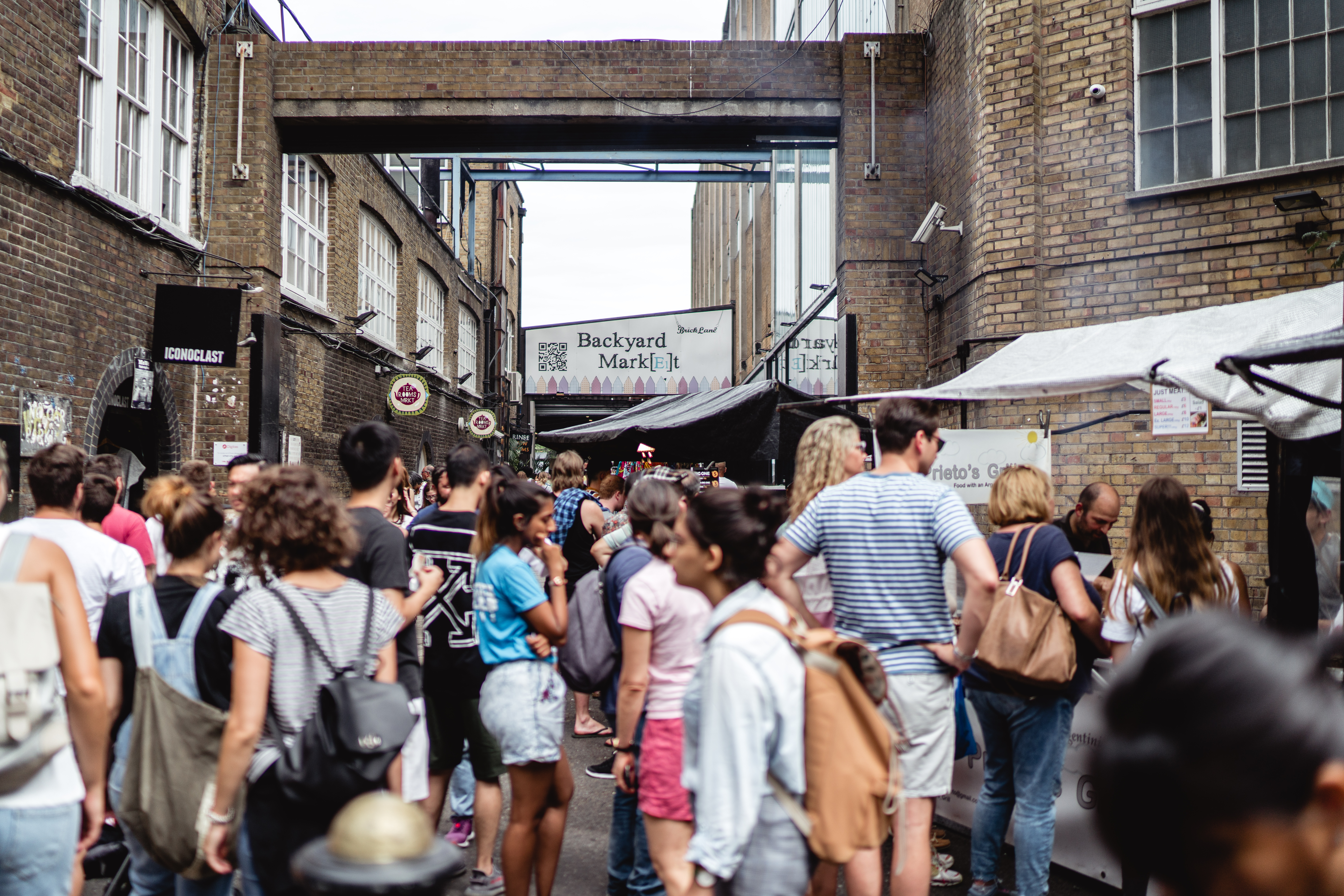 Ήρθε η ώρα για μια γενναία δόση shopping κι έχετε στη διάθεσή σας πέντε ολόκληρους χώρους να εξερευνήσετε. Εκείνοι της πρώην ζυθοποιίας Truman Brewery με την ψηλή καμινάδα από τούβλα να ξεχωρίζει, έχουν ανακαινιστεί και μετατραπεί σε σκεπαστές αγορές που φιλοξενούν από πάγκους φαγητού έως αντικείμενα και ρούχα πρωτοποριακού σχεδιασμού. Η Old Truman Brewery Market αποτελείται πλέον από τις Upmarket, Backyard Market, Vintage Market, The Tea Rooms και Boiler House Food Hall, που η καθεμιά προσφέρει μια απολαυστική εμπειρία shopping. Η Upmarket με τους 200 πάγκους σας δίνει την ευκαιρία να αγοράσετε μερικά από τα καλύτερα χειροποίητα ρούχα, αξεσουάρ, κοσμήματα, έργα τέχνης, είδη σπιτιού και κεραμικά που παρουσιάζονται και πωλούνται απευθείας από τους ίδιους τους δημιουργούς. Μαζί με όλα αυτά τα μοναδικά αντικείμενα θα βρείτε και μια τεράστια επιλογή από λαχταριστά ethnic φαγητά, που μαγειρεύονται επί τόπου και εκπροσωπούν όποια κουζίνα τραβάει η όρεξή σας: από τη Γιαπωνέζικη ως τη Μεξικάνικη, από την Αιθιοπική ως την Κορεάτικη και από την Ιταλική ως την Ινδική. Οι εξωτικές μυρωδιές και τα αρώματα των μπαχαρικών από τα τεράστια τηγάνια αναμειγνύονται και μαζί με τις δελεαστικές γλυκές δημιουργίες και εγγυόνται ότι θα ικανοποιήσουν και τους πιο εκλεκτικούς foodies. Μη φύγετε χωρίς να δοκιμάσετε τουλάχιστον ένα από τα ethnic πιάτα.