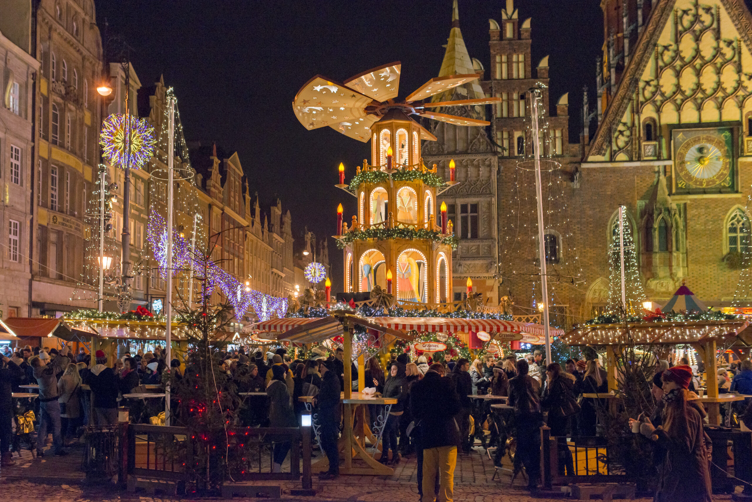 Το Βρότσλαβ βρίσκεται βορειοδυτικά της Κρακοβίας και είναι μια πιο ήσυχη, αλλά εξίσου όμορφη πόλη. Τις γιορτές το ιστορικό του κέντρο στολίζεται από άκρη σε άκρη, όμως η μεγάλη ατραξιόν είναι η χριστουγεννιάτικη αγορά, μία από τις πιο γνωστές της Πολωνίας. Φιλοξενείται στην πλατεία της Αγοράς, τη Rynek we Wrocławiu, στην Παλιά Πόλη (21 Νοεμβρίου 2025 έως 7 Ιανουαρίου), η οποία περιβάλλεται από εντυπωσιακά πολύχρωμα κτίρια που χαρίζουν επιπλέον γοητεία στην ατμόσφαιρα. Η αγορά έχει έντονο διεθνή χαρακτήρα και, πέρα από πολωνικά εδέσματα, θα βρείτε ουγγρικά langos, ολλανδικές βάφλες, chimney cake από την Τρανσιλβανία, καθώς και ισπανικά πιάτα τύπου παέγια.