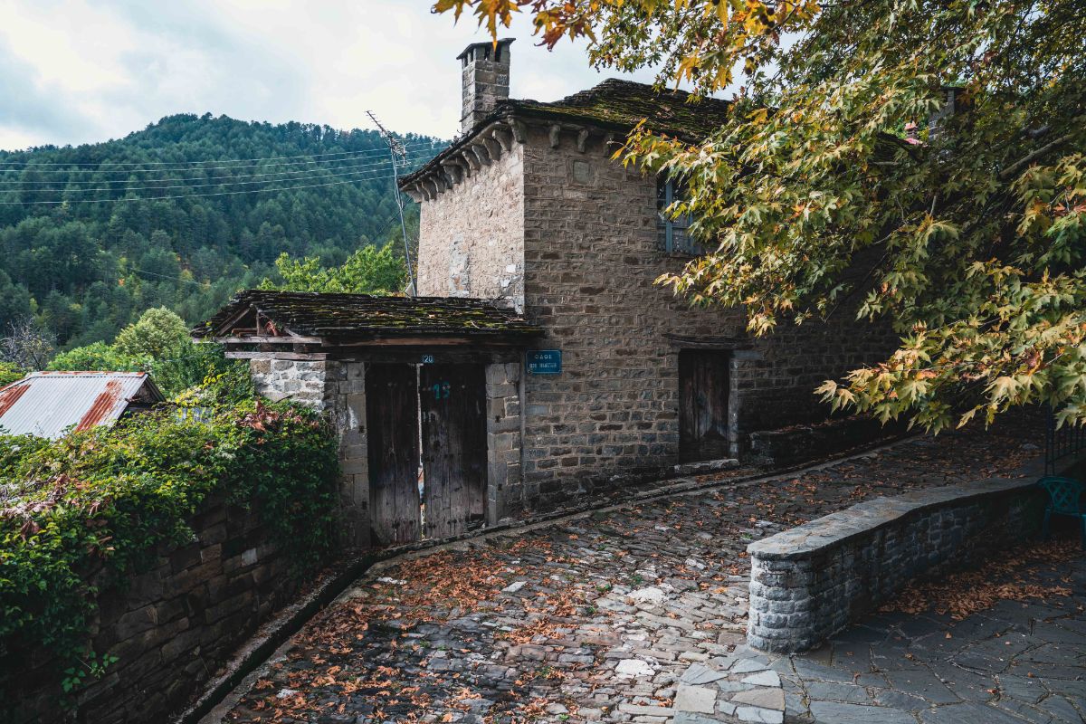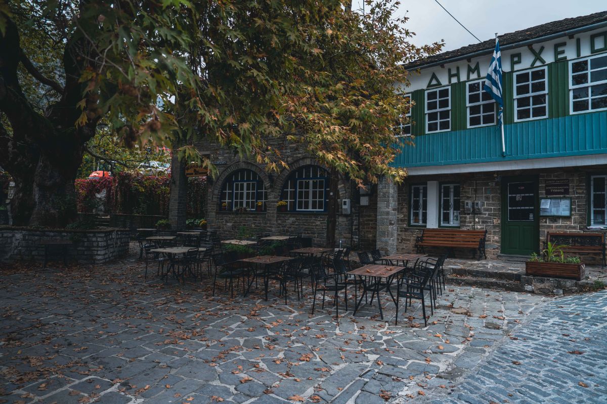 Όσο κι αν θέλουμε να ξαποστάσουμε στην κεντρική πλατεία λίγα μέτρα πιο πάνω, εκεί όπου στέκουν το Δημαρχείο και τα καφέ, να χαζέψουμε τα καλοδιατηρημένα αρχοντικά και τον χιλιόχρονο πλάτανο που τα «στεγάζει», ο χρόνος μας κυνηγά. Κι όμως, σαν να το κάνουμε επίτηδες. Πιάνουμε κουβέντα με ζευγάρι Γερμανών τουριστών που έχει παρκάρει το τροχόσπιτο δίπλα στο αμάξι μας και ρεμβάζει σε πτυσσόμενες καρέκλες. Γυρίζουν μέρες οι άνθρωποι και όπου τους βγάλει το Ζαγόρι. Εκστασιασμένοι.