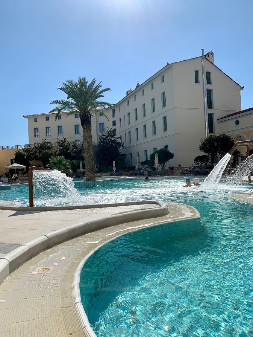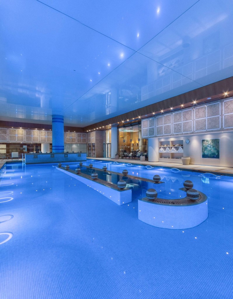 Οι εγκαταστάσεις εντυπωσιάζουν, αφού δεν λείπει τίποτα από ό,τι μπορεί να επιθυμήσει η καρδιά και το σώμα σας. Η Aquaroyal πισίνα εκτείνεται σε 350 τ.μ., σε απίστευτους γαλάζιους τόνους, με τις τζαμαρίες να βλέπουν στο μπλε της θάλασσας, κάνοντάς σε να νιώθεις ότι βρίσκεσαι μέσα σε αυτήν. Τα νερά, εντωμεταξύ, τρέχουν από παντού, σε μια ποικιλία ευεργετικών μασάζ.