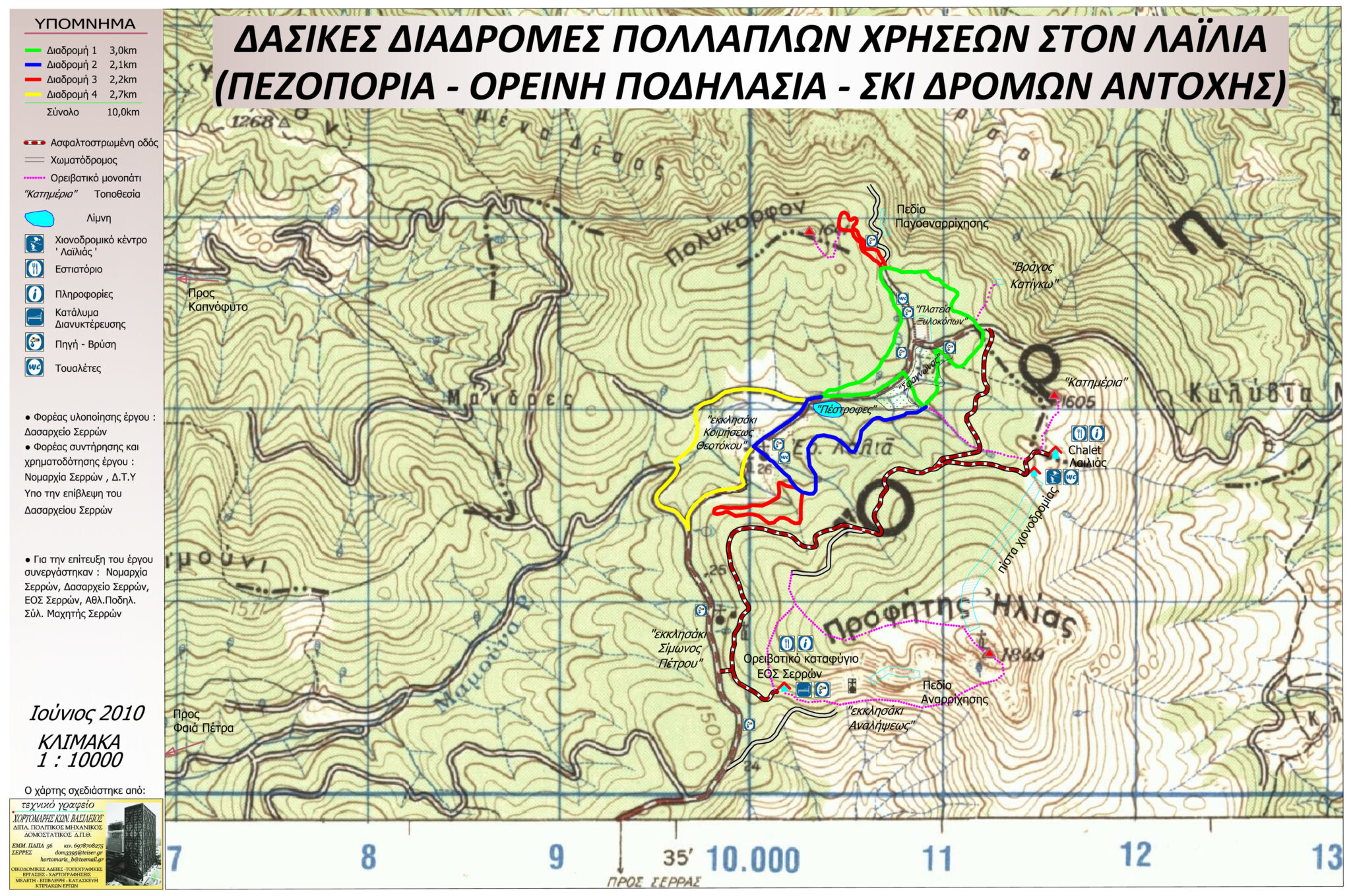 Υπάρχουν τέσσερις διαδρομές πολλαπλών χρήσεων στο δάσος του Λαϊλιά (πεζοπορία, ορεινή ποδηλασία, σκι δρόμων αντοχής), ενώ μέρος των Ευρωπαϊκών Μονοπατιών Ε4 και Ε6, διέρχονται μέσα από αυτό.