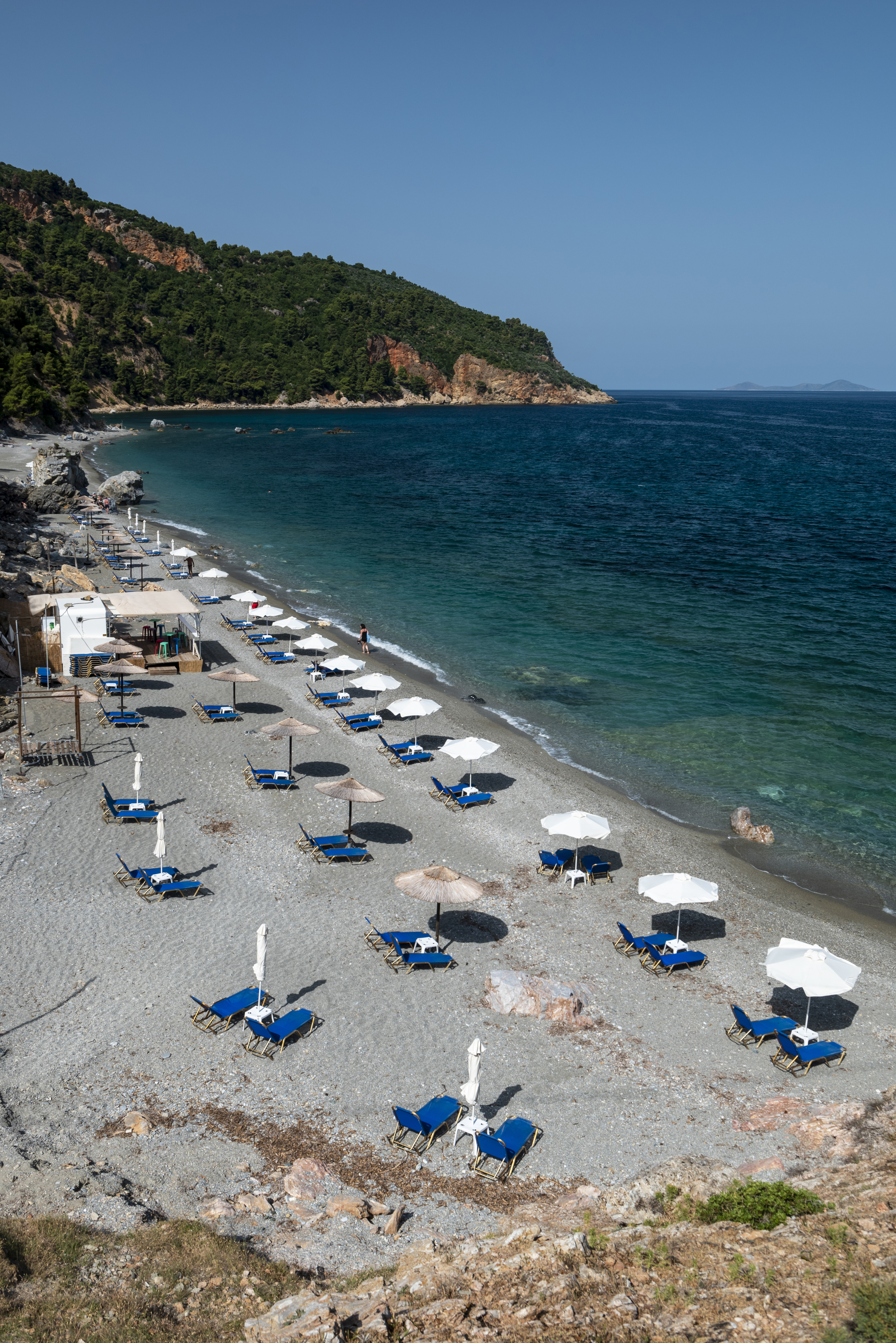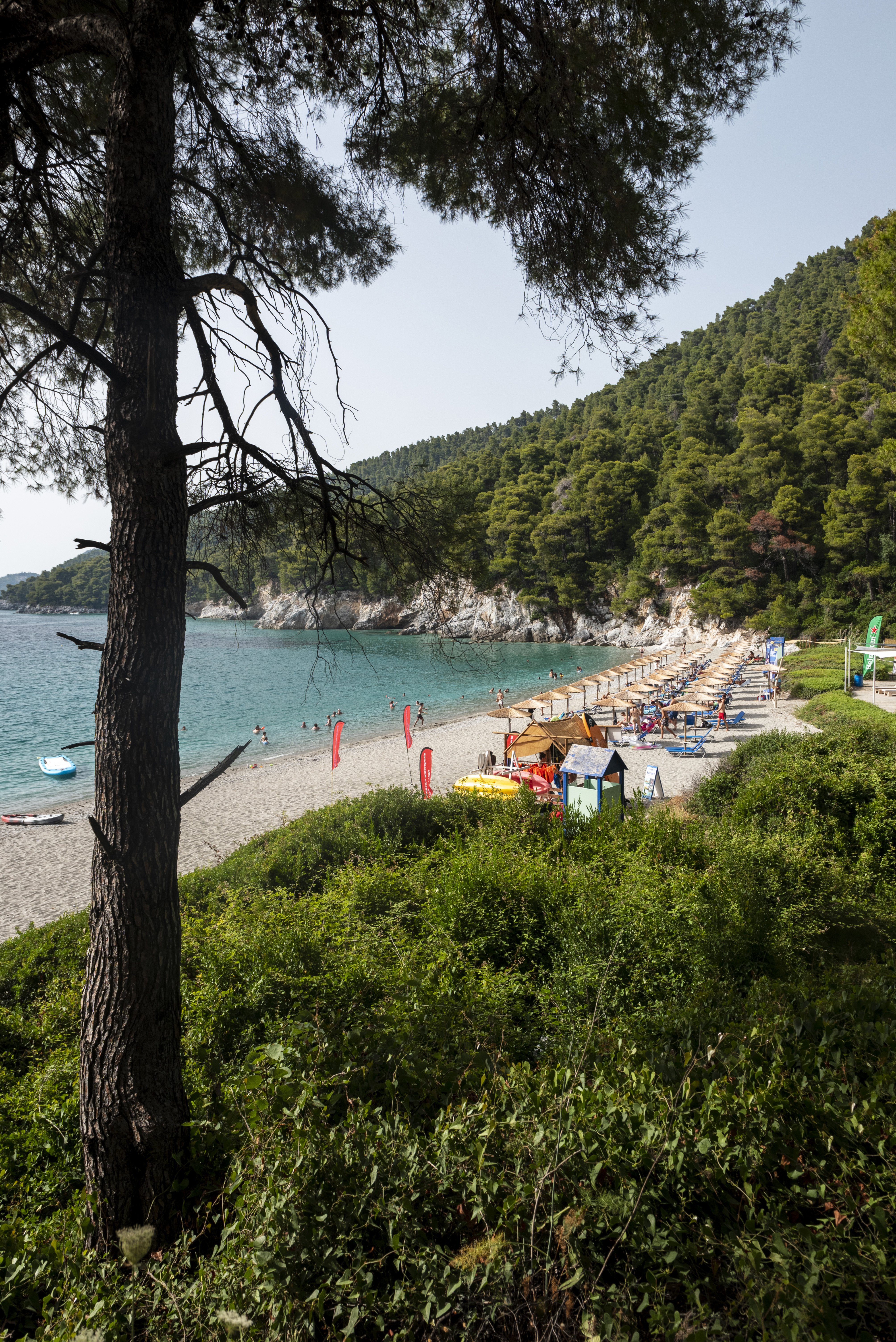 Το νησί έχει πραγματικά πάρα πολλές παραλίες, που κύριο χαρακτηριστικό τους είναι τα κρυστάλλινα νερά και το καταπράσινο φόντο. Σε κάποιες, μάλιστα, τα δέντρα σχεδόν ακουμπούν στη θάλασσα, άλλες έχουν βοτσαλάκι και μερικές έχουν όμορφη αμμουδιά. Από τις πιο αγαπημένες και διάσημες παραλίες είναι η Καστάνη στα δυτικά, εδώ όπου έγιναν τα γυρίσματα του Mamma Mia. Έχει πολύ ψιλό βοτσαλάκι ανάμεικτο με άμμο, διάφανα νερά και ένα πυκνό πευκοδάσος ακριβώς από πίσω. Είναι οργανωμένη, ενώ έχει χώρο και για να απλώσετε την ψάθα σας. Λίγο πιο βόρεια είναι η φανταστική παραλία Εκατοπενηντάρι, άλλη μία πευκόφυτη παραλία την οποία προσεγγίζετε με σκάφος. Δεν είναι οργανωμένη, επομένως θα χρειαστεί να φροντίσετε για όλα τα απαραίτητα. Ακριβώς από πάνω βρίσκεται η απίθανη παραλία Χόβολο, με τα επιβλητικά λευκά βράχια, όπου ακόμα και εκεί ξεπροβάλλουν τούφες από πεύκα και τα διάφανα νερά. Είναι ίσως από τις ομορφότερες παραλίες του νησιού. Θα χρειαστεί να περπατήσετε για να την προσεγγίσετε και δεν είναι οργανωμένη.