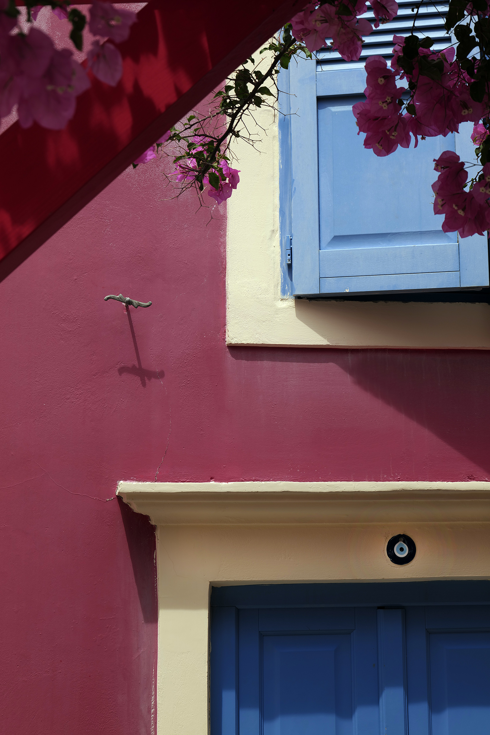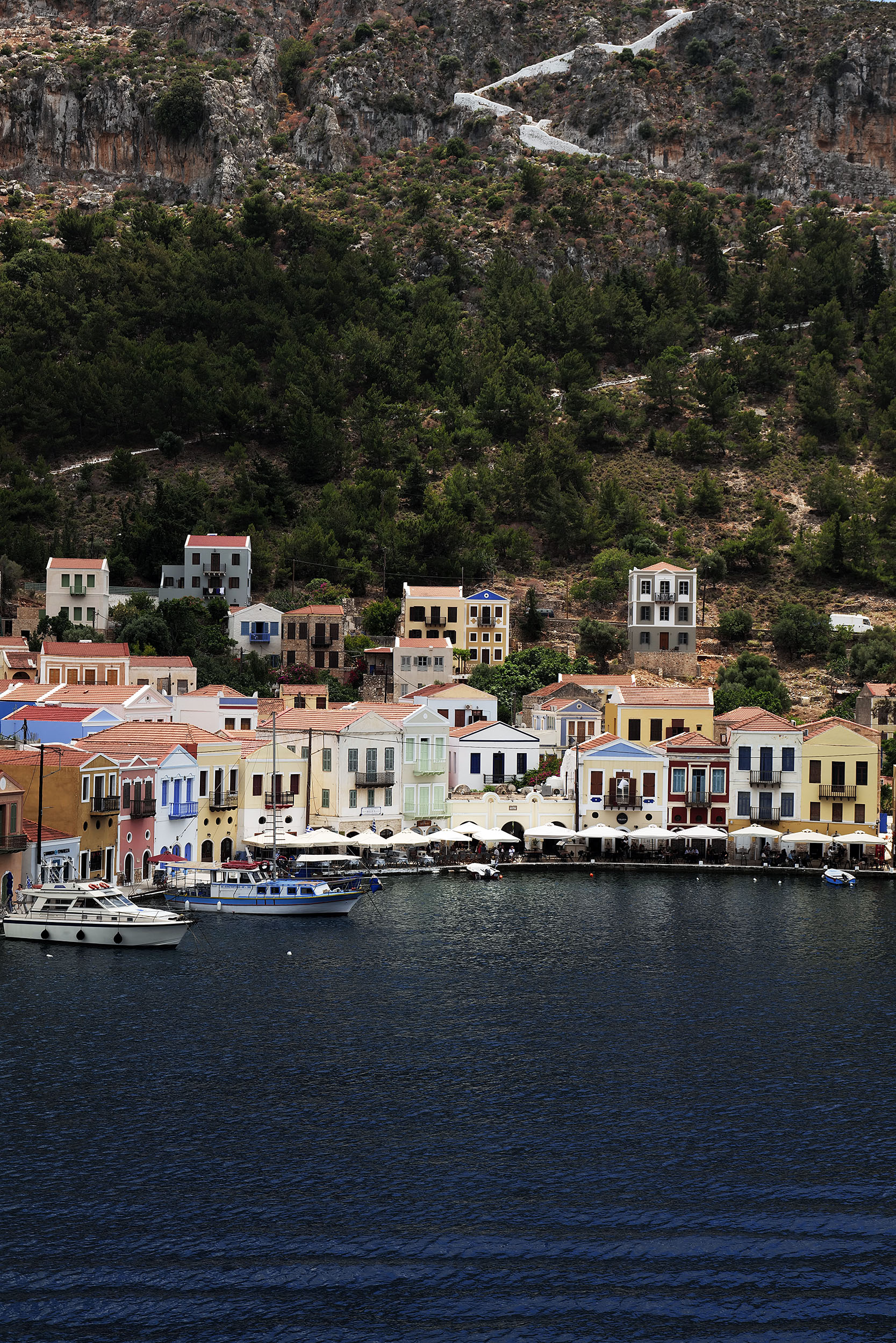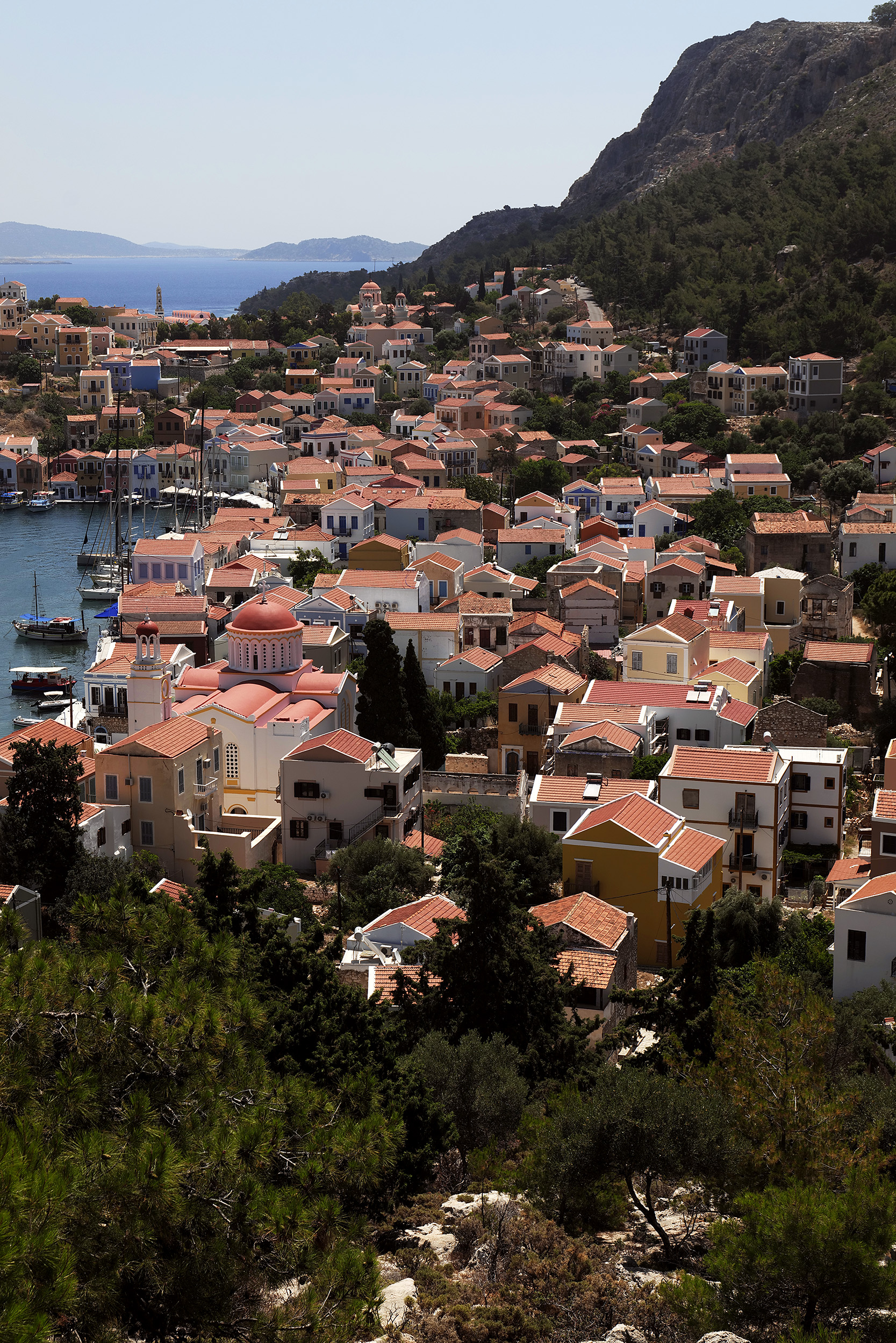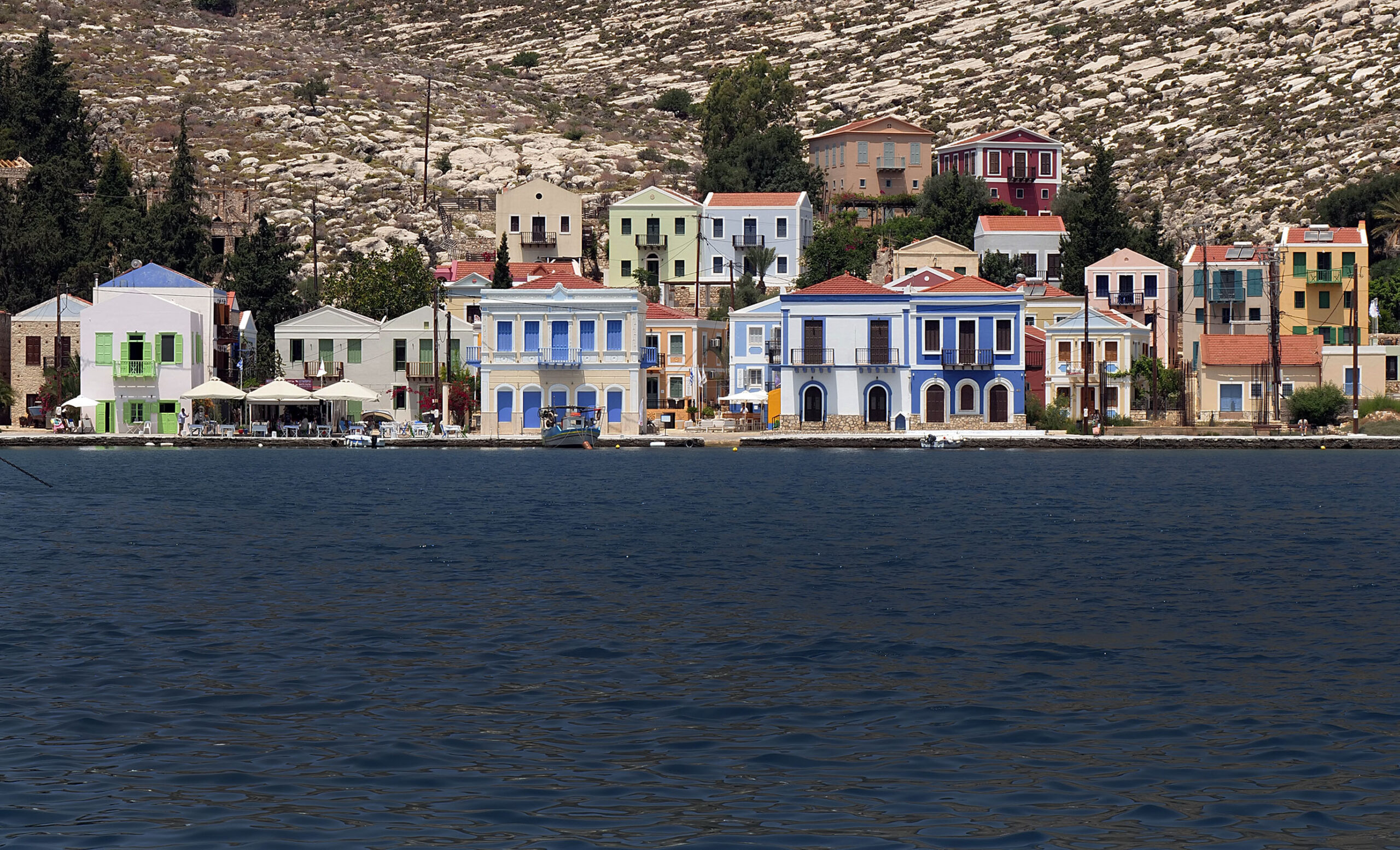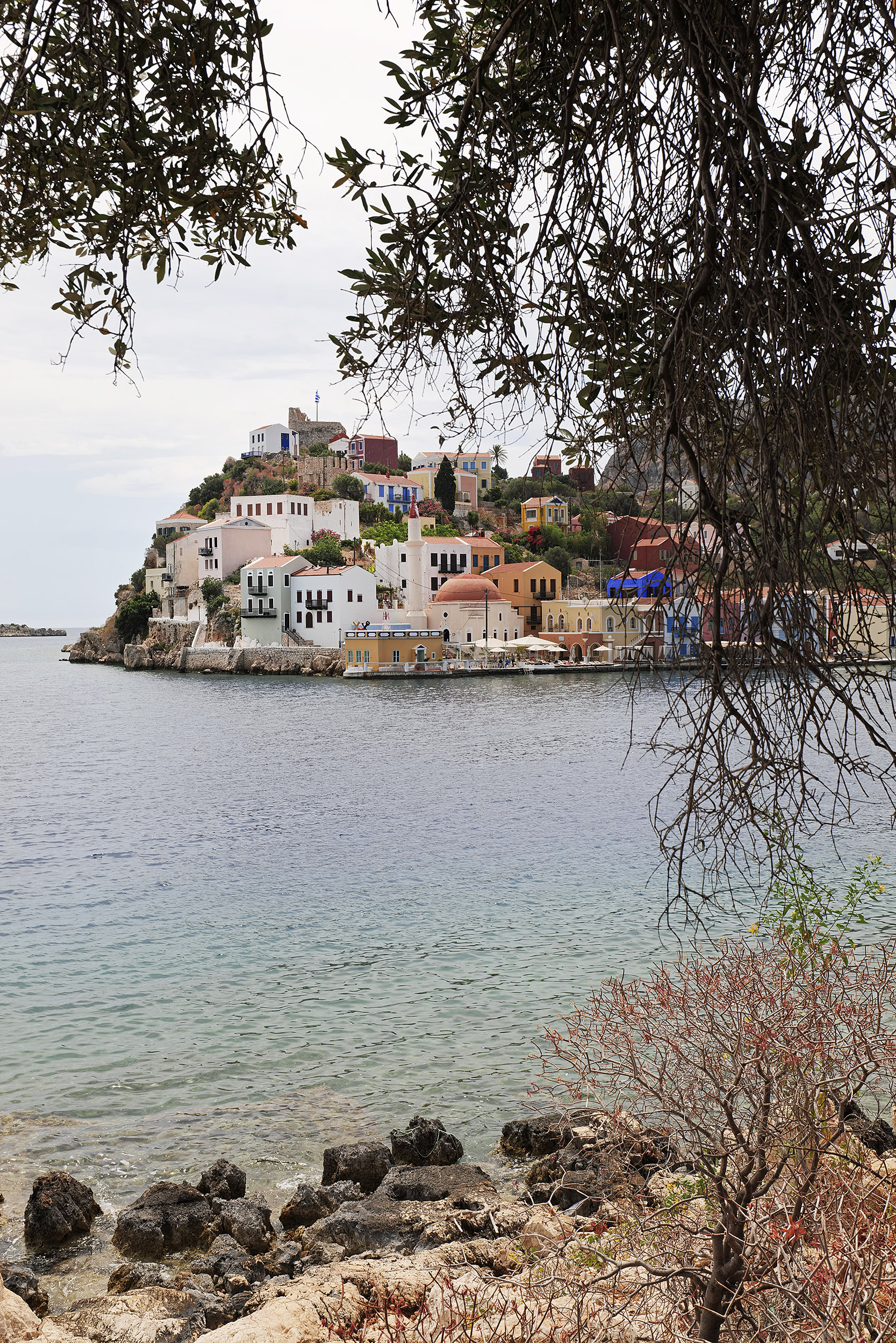 Ο μιναρές στα αριστερά, το κάστρο των Ιωαννιτών Ιπποτών από πάνω με την μεγάλη ελληνική σημαία να κυματίζει σε περίοπτη θέση, η ολόλευκη σκάλα στο μέσο του λιμανιού, τα τακτοποιημένα αγκυροβολημένα ιστιοφόρα, τα χαμηλά πολύχρωμα κτίσματα, το γαλαζοπράσινο των νερών και όλα αυτά στη σκιά του απότομου πέτρινου και χωμάτινου, κοκκινωπού υψώματος, συνθέτουν μια εικόνα ψεύτικη, ζωγραφιστή, σχεδόν κοροϊδευτική. Το Καστελόριζο είναι πολύ όμορφο και το ξέρει.