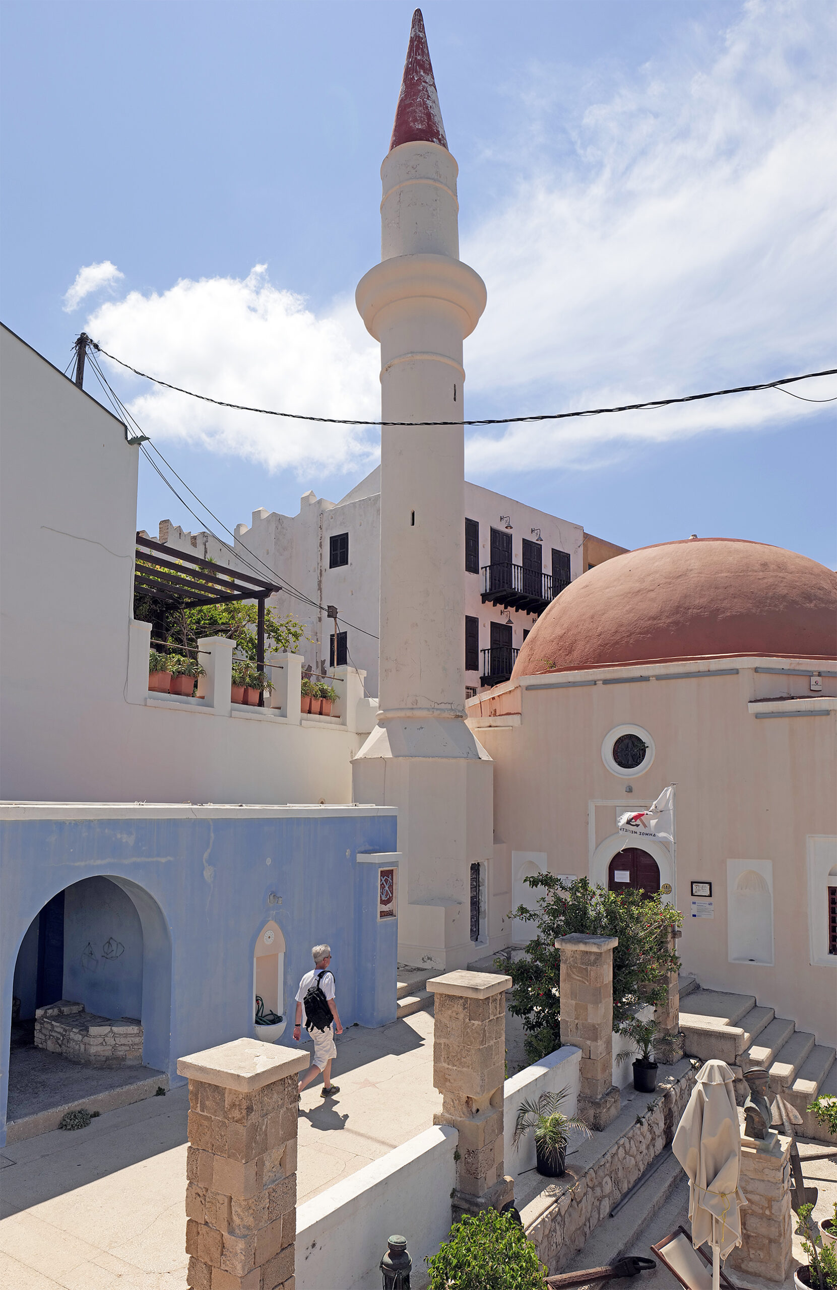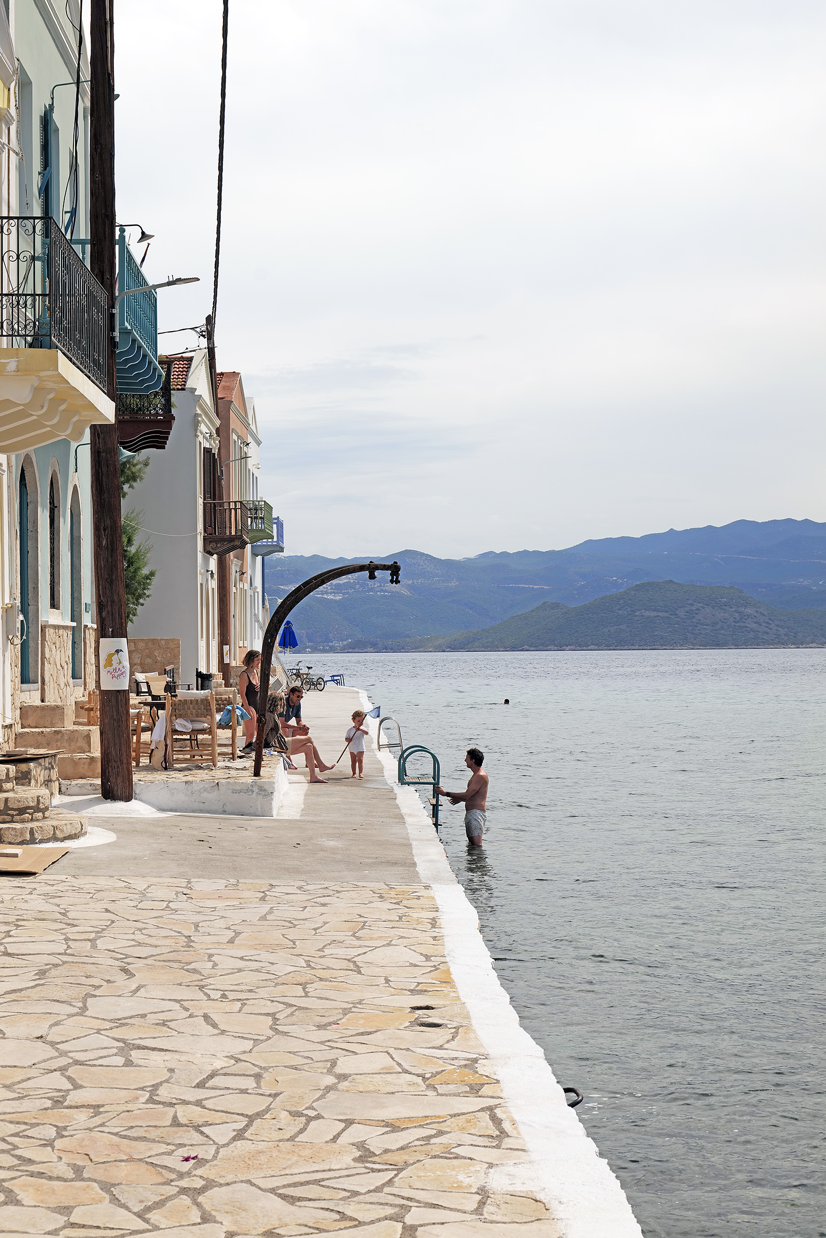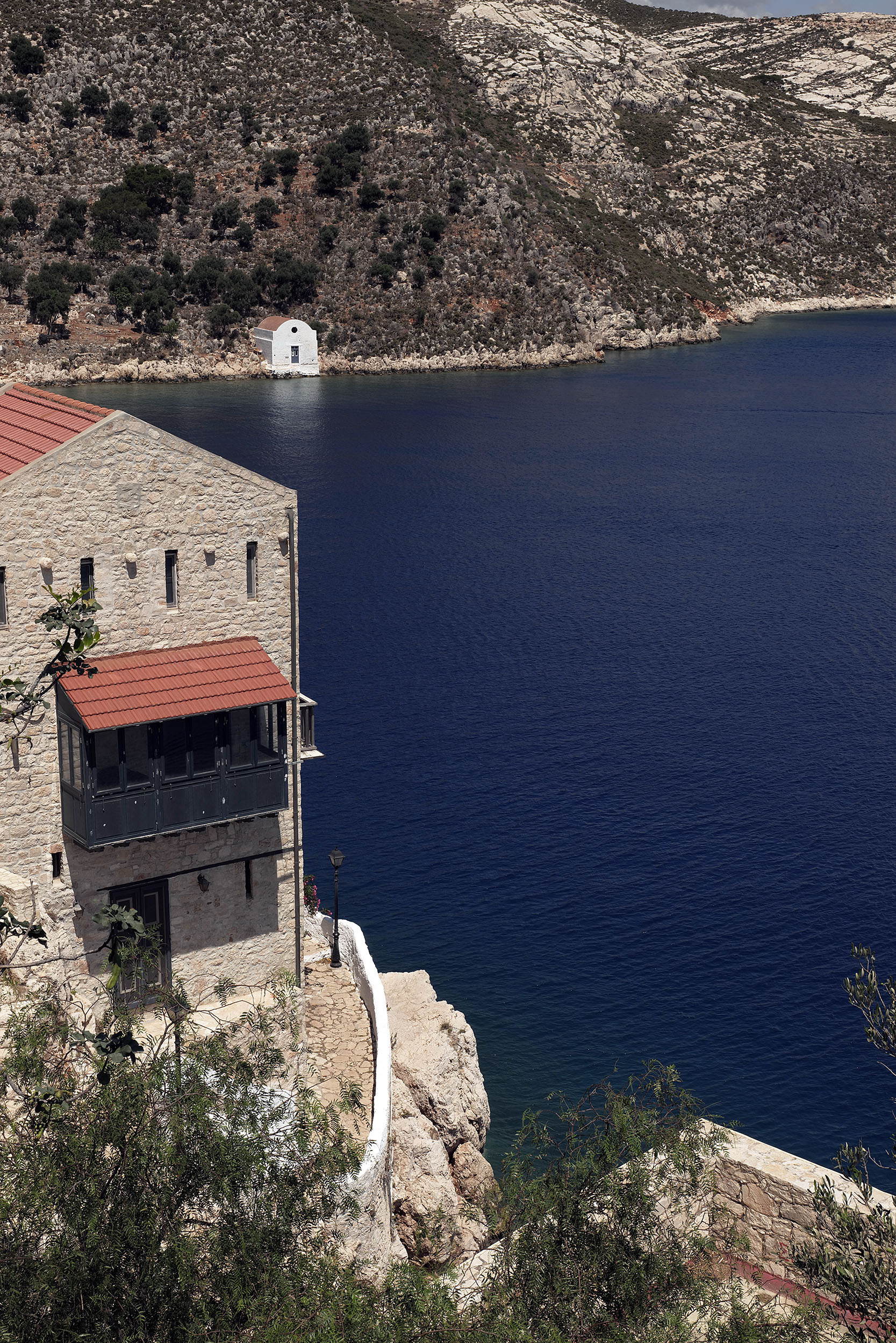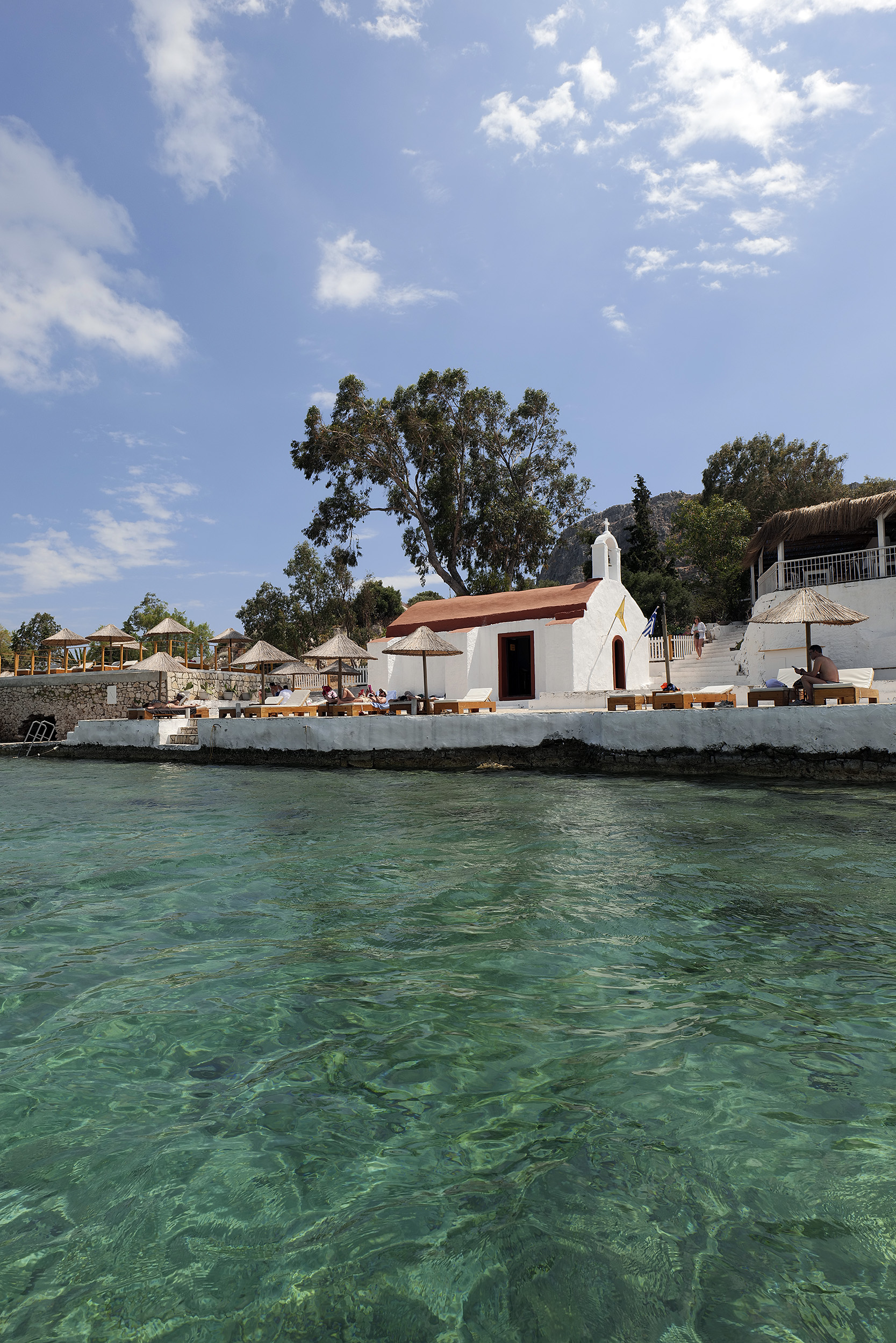 Απέναντι, η Τουρκία, υπερβολικά χτισμένη με τη δική της ερμηνεία της τουριστικής ανάπτυξης, οι δικές της βραχονησίδες και ανάμεσα στις δύο χώρες το σκάφος της διεθνούς συνοριοφυλακής το οποίο κινείται νωχελικά, ελέγχοντας το πέρασμα. Στο κατέβασμα συναντώ τους επόμενους «προσκυνητές» του μονοπατιού, ίσως όχι τόσο πιστούς, αν κρίνω από τις εκφράσεις των προσώπων τους. Στη βάση της σκάλας, στρίβω δεξιά με κατεύθυνση το Μανδράκι, πίσω από τη σκιά του Κάστρου των Ιωαννιτών. Πανέμορφες μονοκατοικίες βρίσκονται διάσπαρτες, κάποιες με κήπους περιποιημένους, άλλες όμως αφημένες στην τύχη τους και στη φθορά του χρόνου, αφού πολλοί ιδιοκτήτες δεν ζουν εδώ. Κατεβαίνω στην βοτσαλωτή παραλία περνώντας δίπλα από τον «Πασά», τη δεξαμενή νερού, απλή απέριττη στην όψη, με καμπυλωτό τρούλο και όχι πια λειτουργική.