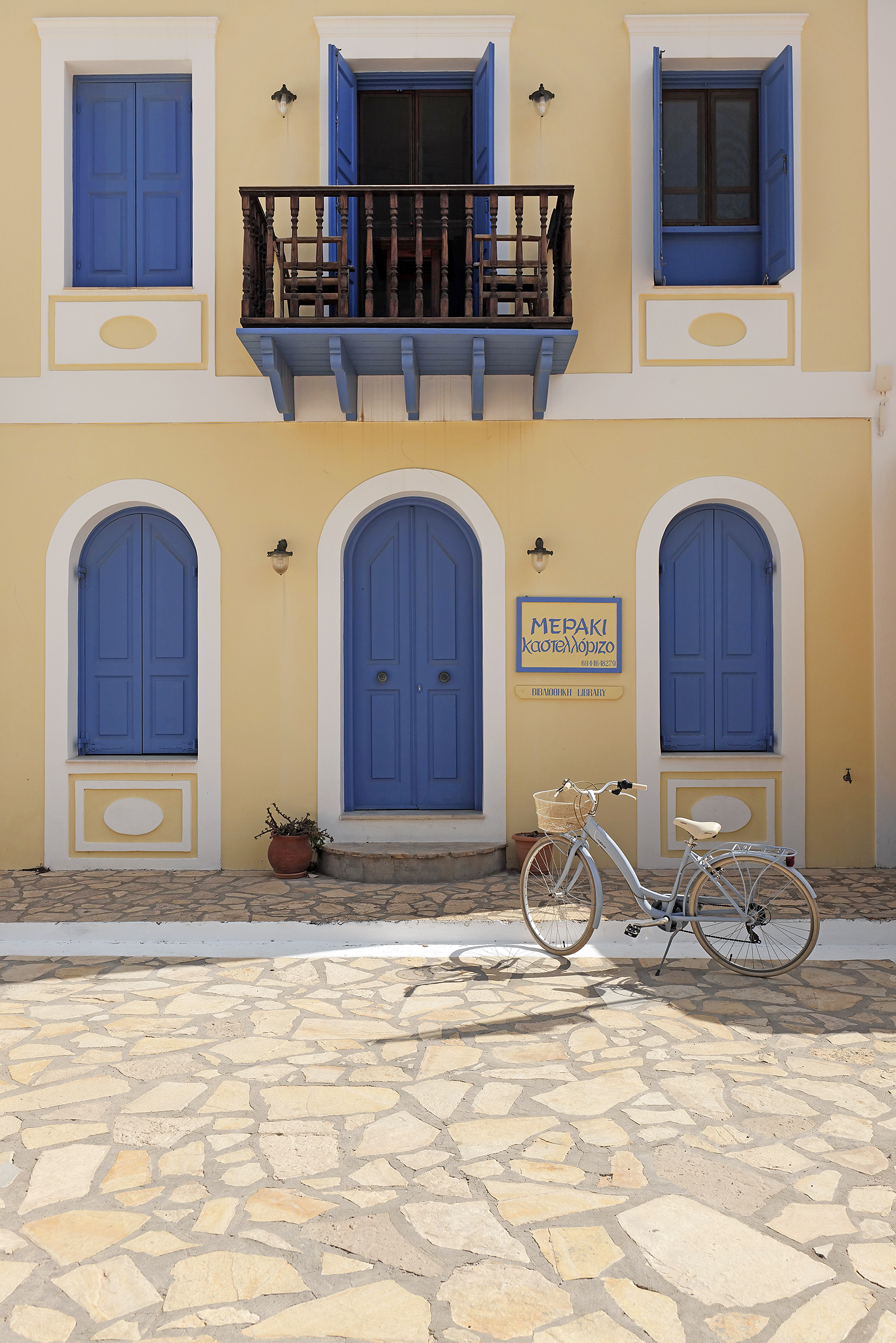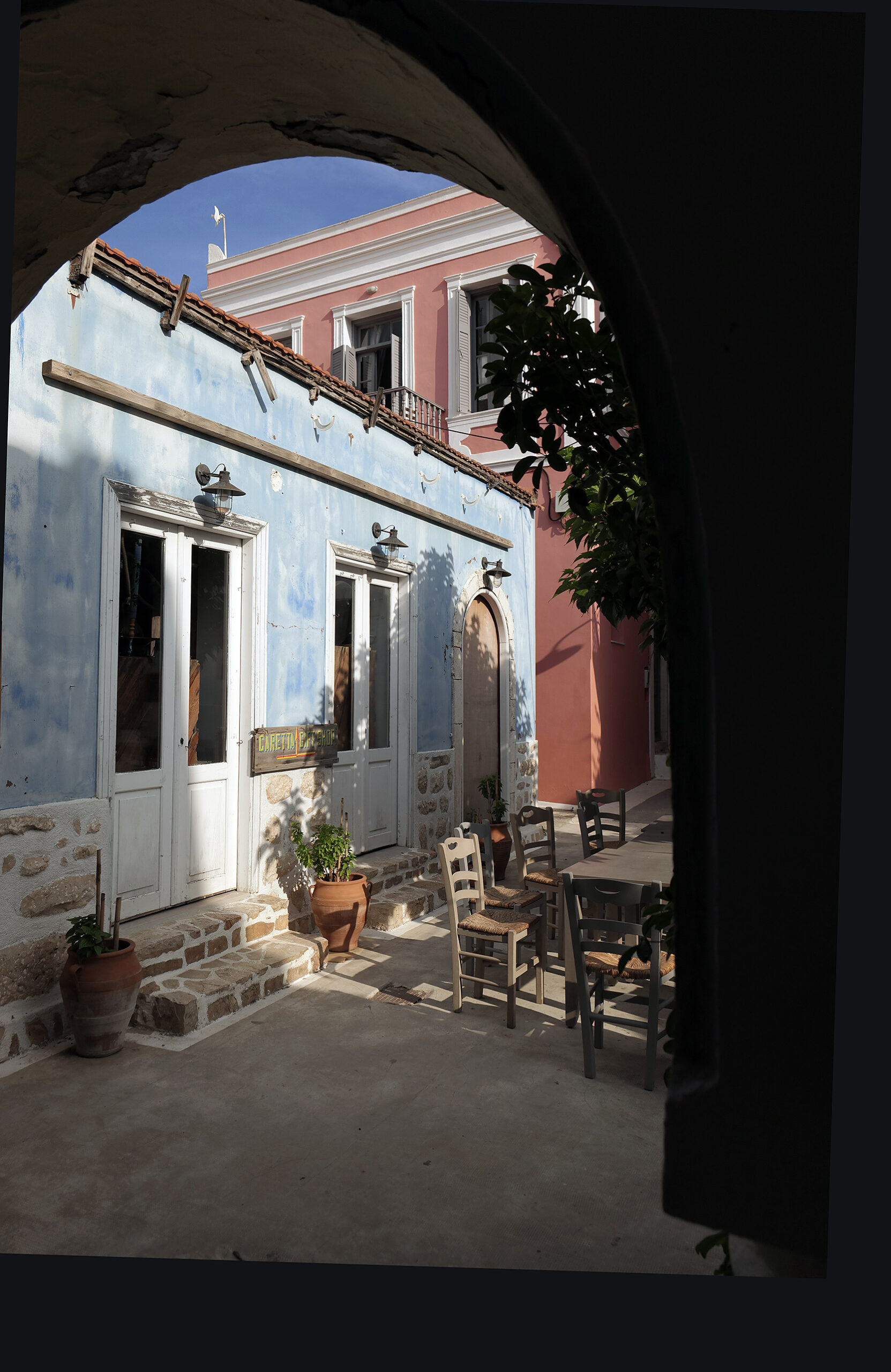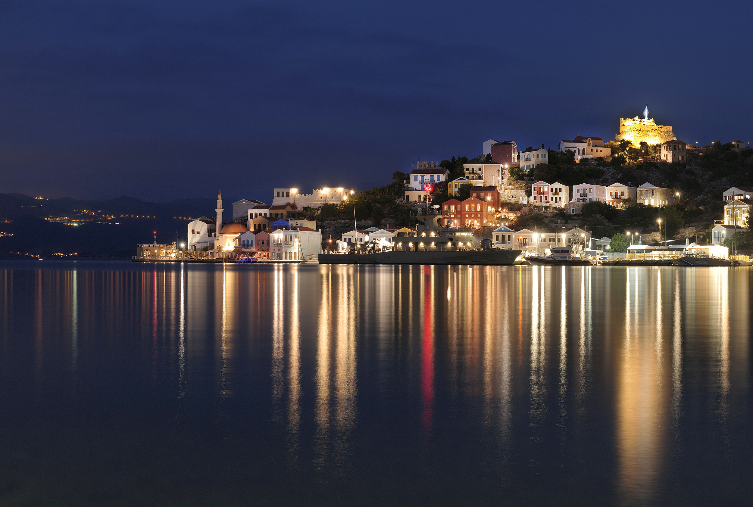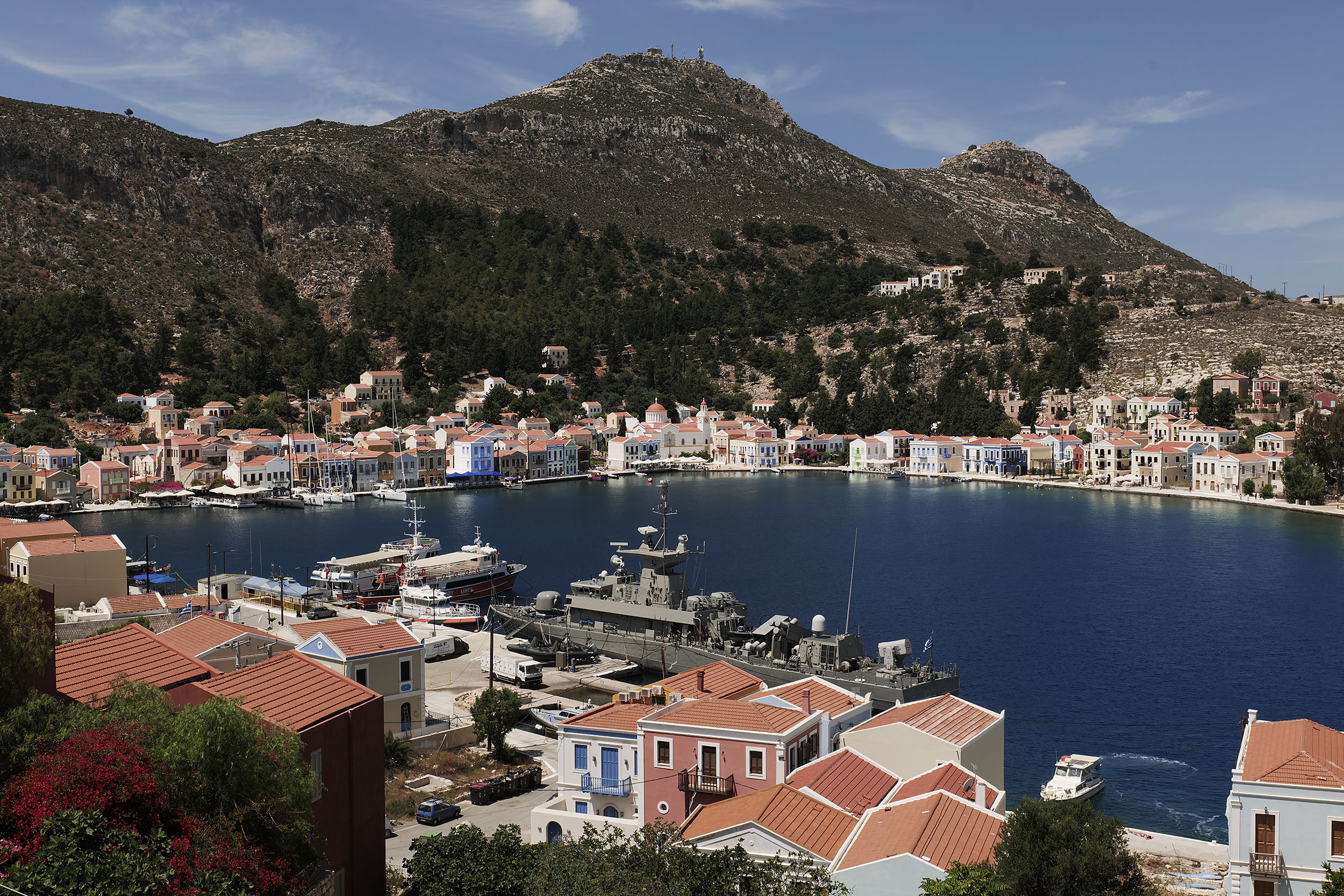 Λίγα λεπτά πριν τη στροφή προς τα δεξιά και την είσοδο στο λιμάνι, το πλοίο ηχεί την κόρνα του με περηφάνεια, θα έλεγε κάποιος, καθώς περνά δίπλα από την ιστορική νησίδα Ρω. Πριν την είσοδο στον φυσικό και προστατευμένο κόλπο της Μεγίστης, ένα πολεμικό πλοίο με ελληνική σημαία στέκει υπομονετικά λίγο πιο έξω αφού, όπως θα παρατηρήσω σε λίγο, το λιμάνι δεν έχει χώρο για τη μανούβρα του επιβατηγού αλλά και το αγκυροβόλι του πολεμικού ταυτόχρονα. Το γκρίζο, πεντακάθαρο στρατιωτικό σκάφος, ένδειξη και της εγγύτητας της Μεγίστης στα σύνορα με την Τουρκία, θα ξαναμπεί στο λιμάνι μετά την αναχώρηση του επιβατηγού/οχηματαγωγού. Αυτό, παρεμπιπτόντως, είναι και το μόνο βαρετό χρωματικά στοιχείο κατά την άφιξη στο λιμάνι. Είχα δει φωτογραφίες σε οδηγούς αλλά και εικόνες από την ταινία “Mediterraneo”, η οποία είχε γυριστεί εδώ και είχε προσφέρει την καλύτερη διαφήμιση στον τόπο, αλλά η φυσική παρουσία γεμίζει τον επισκέπτη με μια πλημμύρα χρωμάτων, υπέροχης αρχιτεκτονικής και ατόφιας αισθητικής.