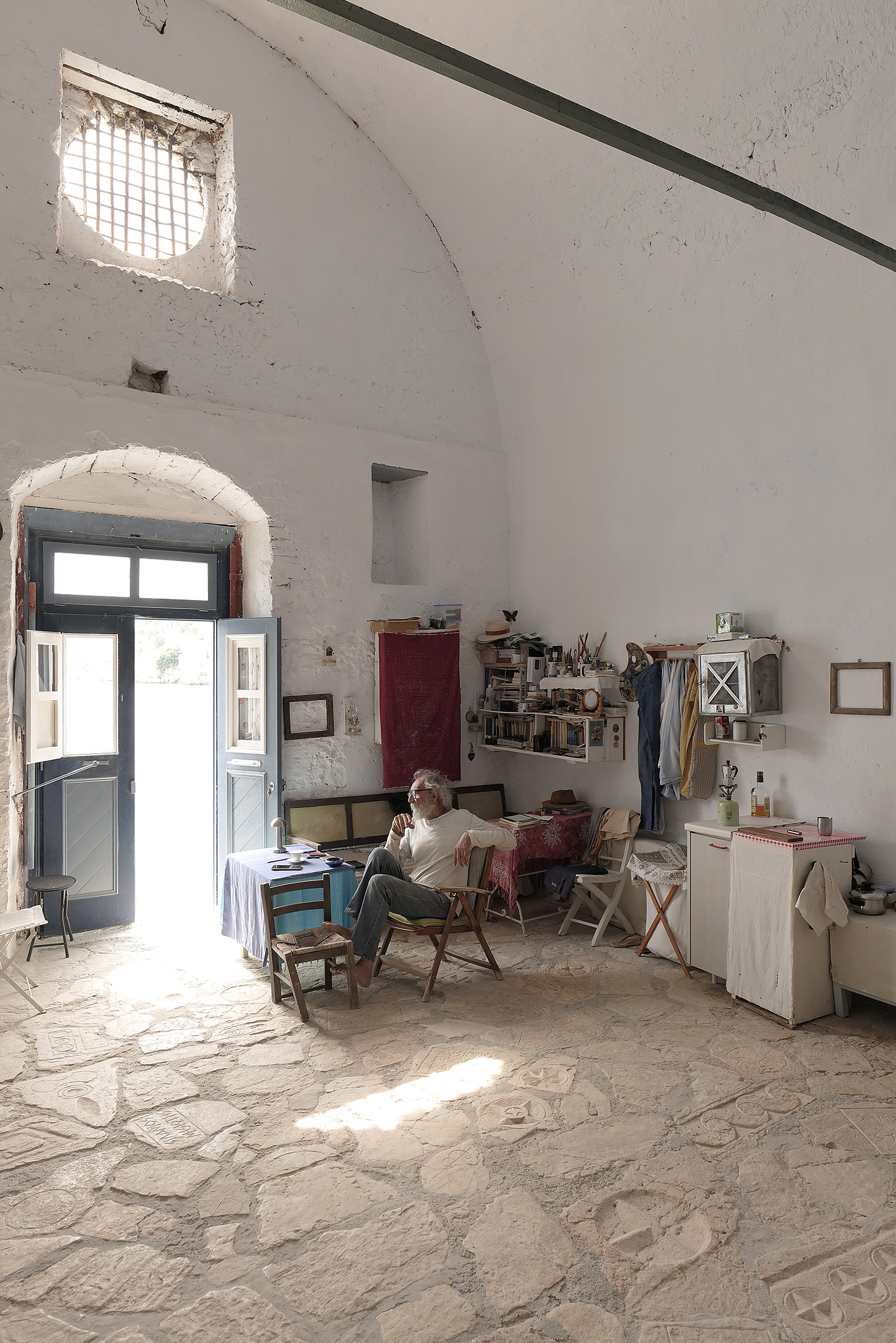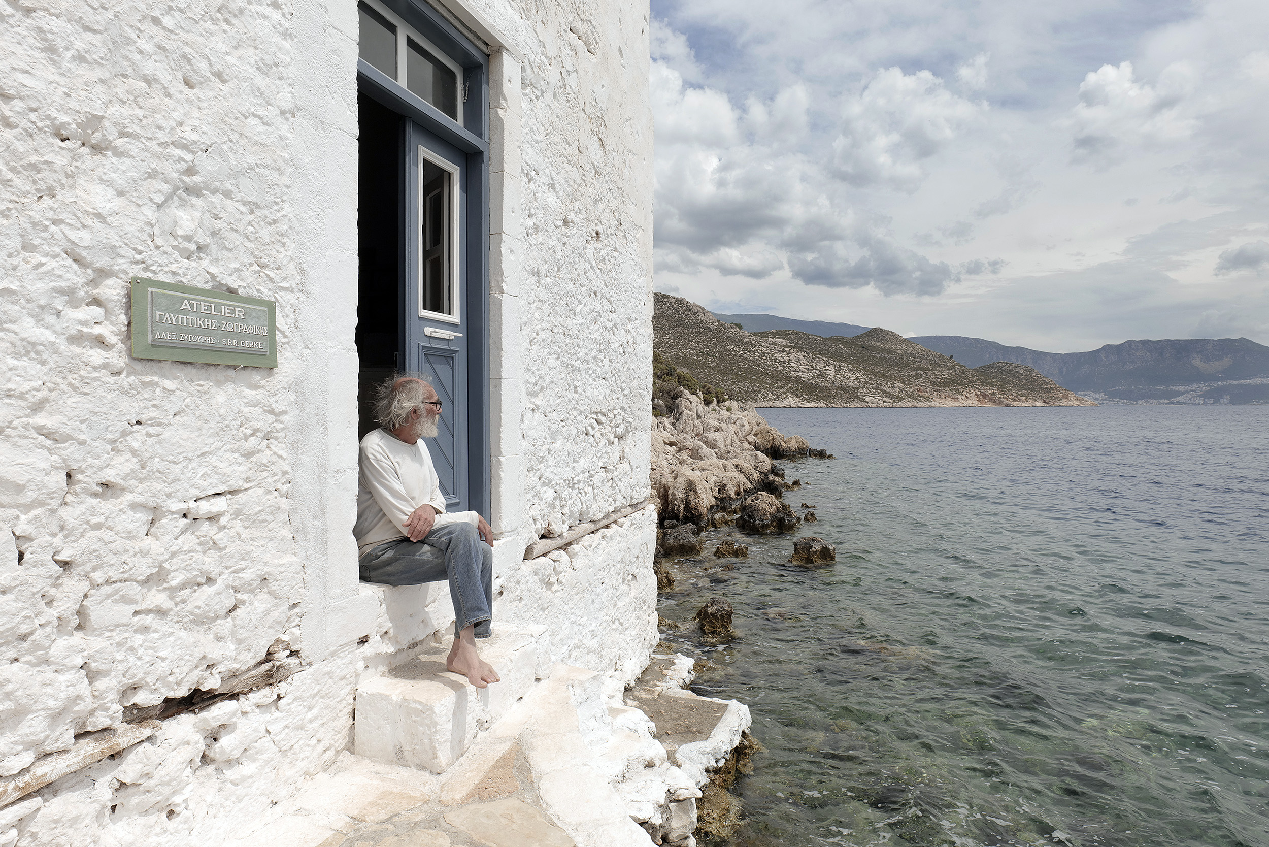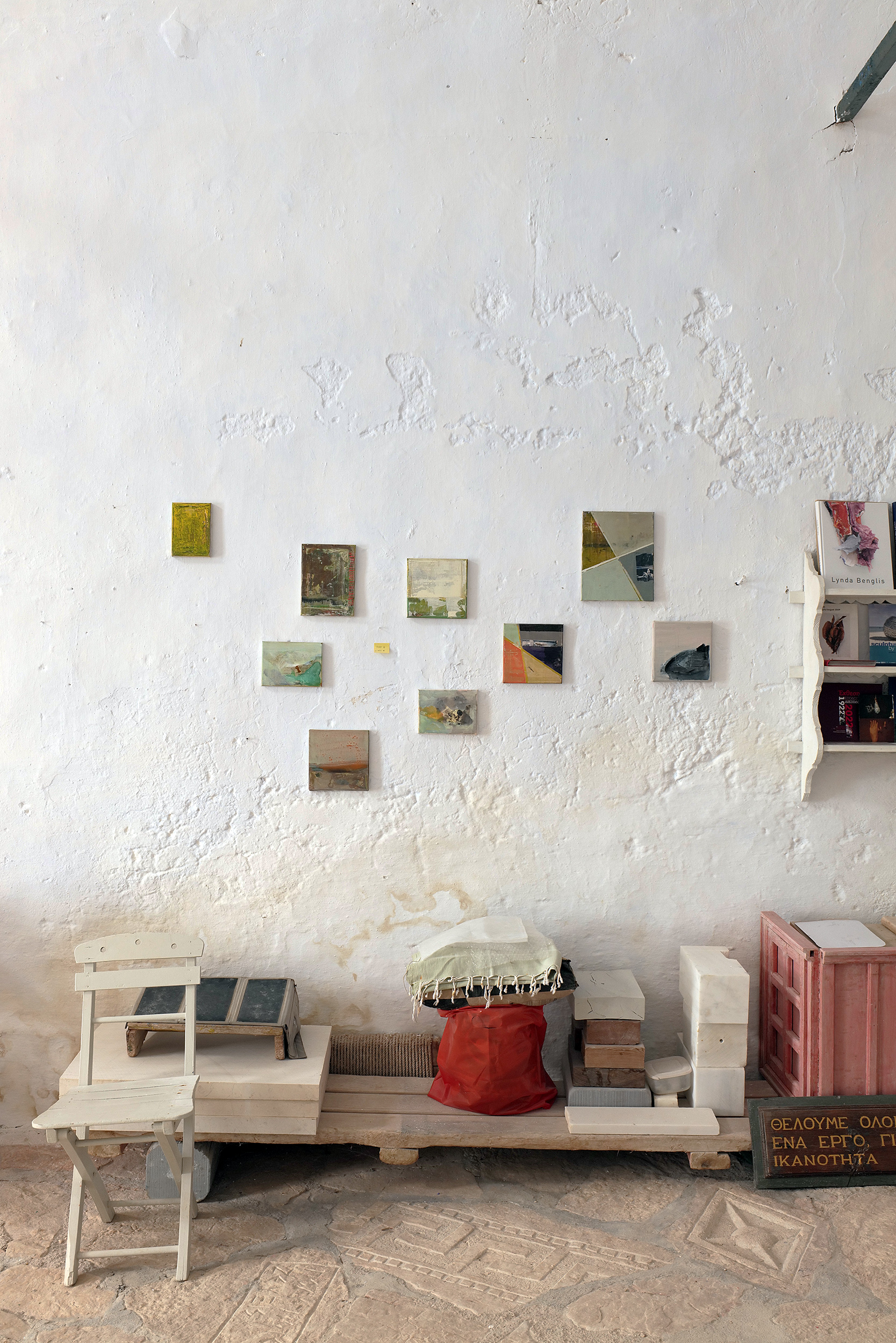 Το ατελιέ του δεν είναι προνομιακό μόνο χάρη στην καλαισθησία που του έχει προσδώσει ο ίδιος, με το λαμπρό φως του ήλιου να φωτίζει μέχρι μέσα τα έργα αλλά και τις σκέψεις του, αλλά και λόγω της θέσης του με θέα ολόκληρο τον υπόλοιπο οικισμό. Καθώς μου προσφέρει τον καφέ που μόλις έφτιαξε στη βιδωτή, τόσο ιταλική, συσκευή του εσπρέσο, μοιράζομαι μαζί του την εμπειρία μου από την επίσκεψη στα μελίσσια του Νικόλα Μαλτέζου, ψηλά πάνω από το φανταστικό αεροδρόμιο του νησιού αλλά και απέναντι από το Φρούριο του Παλαιόκαστρου, όπου αλλάξαμε κάποιες θέσεις στις κυψέλες, ελέγξαμε την παραγωγή μελιού αλλά και μιλήσαμε για τη μελισσοκομία, έχοντας φορέσει, φυσικά, τις προστατευτικές στολές.