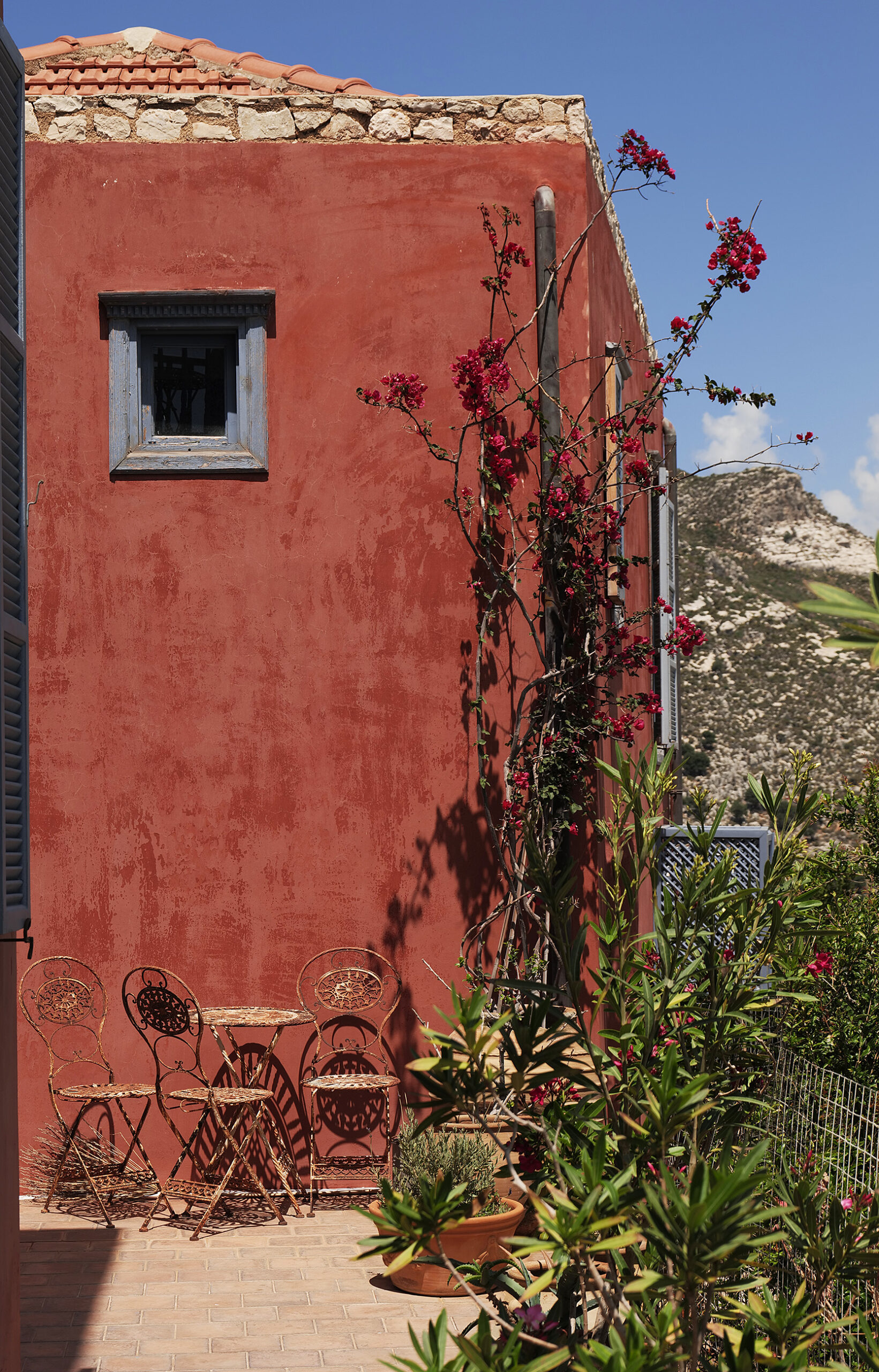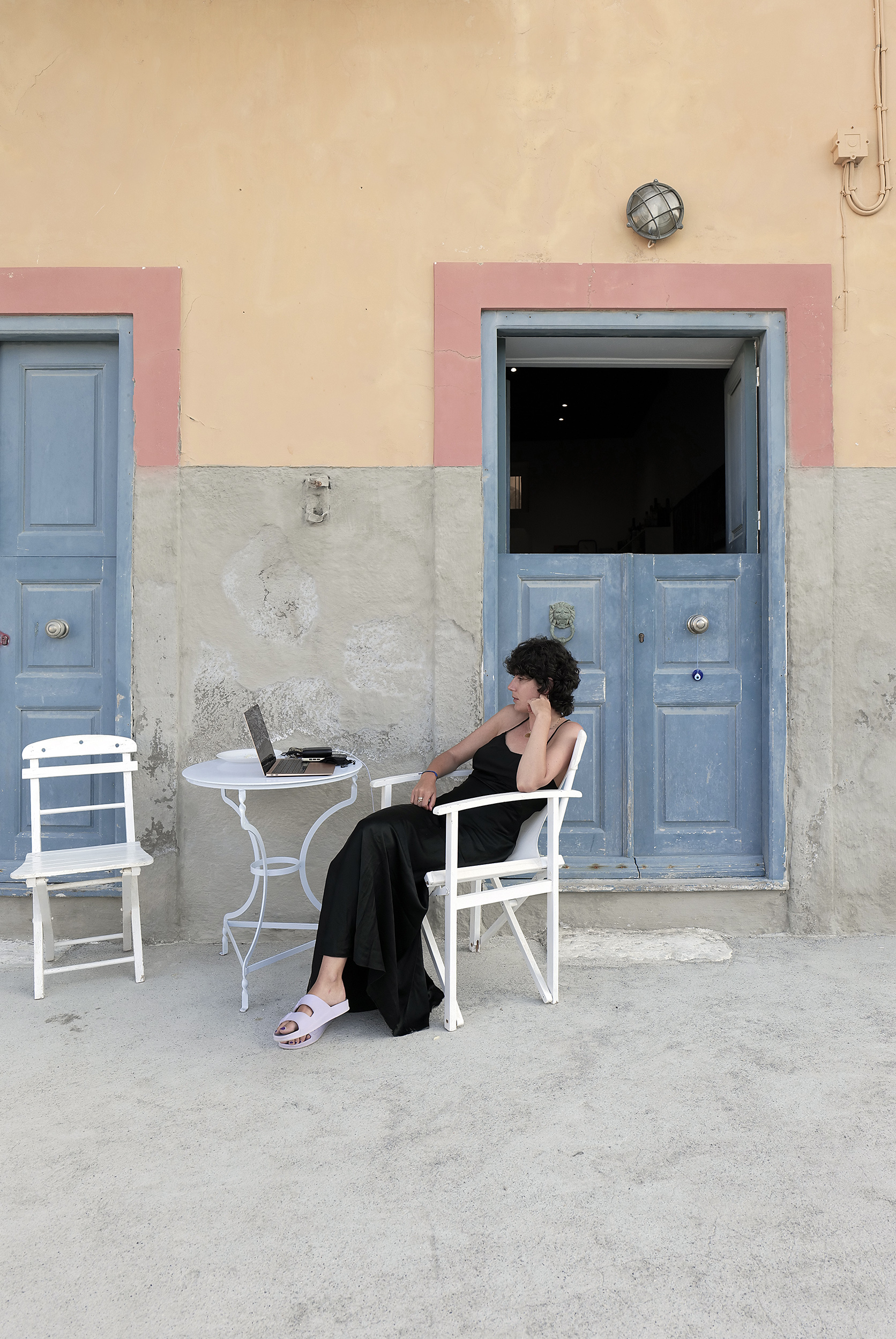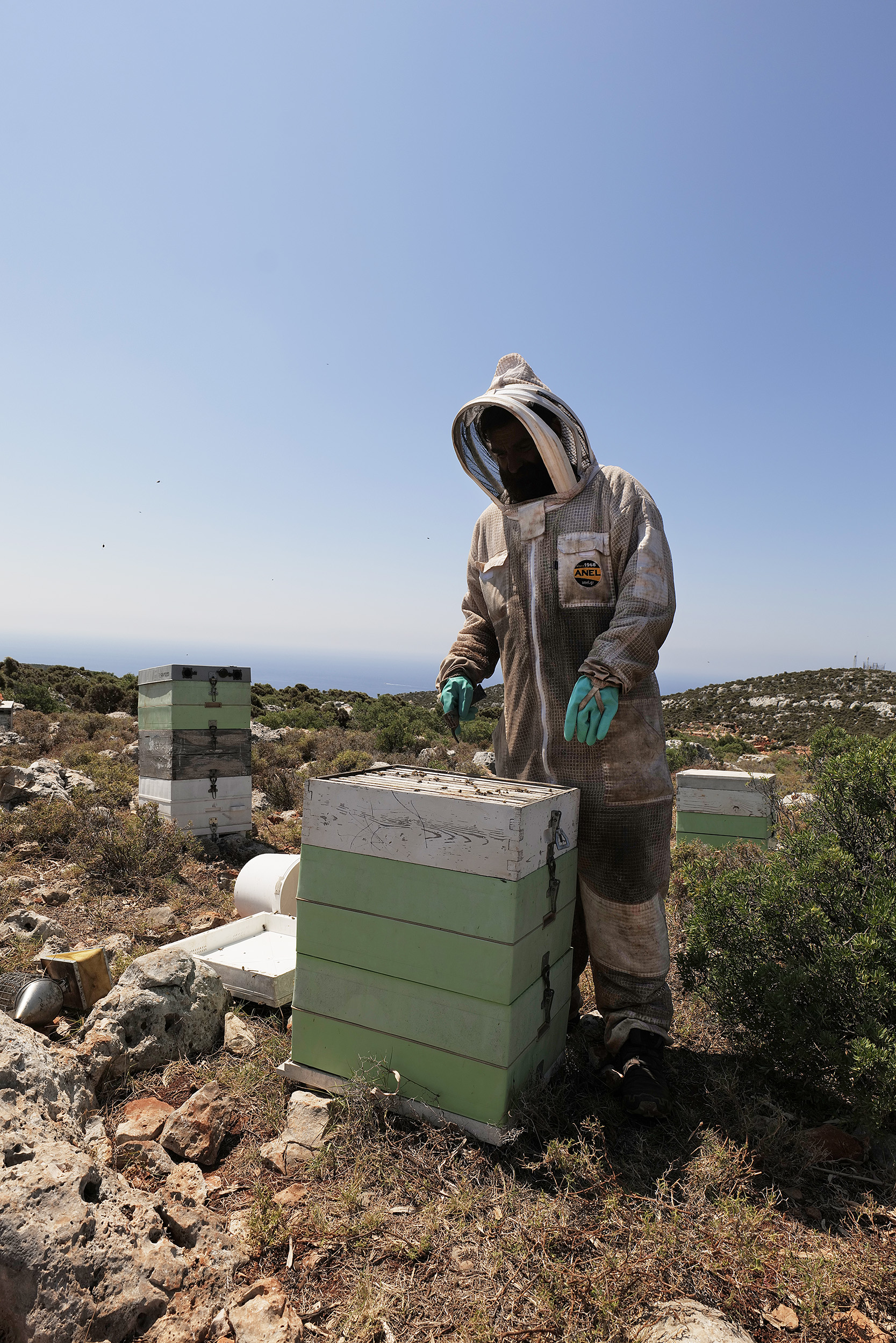 Το ατελιέ του δεν είναι προνομιακό μόνο χάρη στην καλαισθησία που του έχει προσδώσει ο ίδιος, με το λαμπρό φως του ήλιου να φωτίζει μέχρι μέσα τα έργα αλλά και τις σκέψεις του, αλλά και λόγω της θέσης του με θέα ολόκληρο τον υπόλοιπο οικισμό. Καθώς μου προσφέρει τον καφέ που μόλις έφτιαξε στη βιδωτή, τόσο ιταλική, συσκευή του εσπρέσο, μοιράζομαι μαζί του την εμπειρία μου από την επίσκεψη στα μελίσσια του Νικόλα Μαλτέζου, ψηλά πάνω από το φανταστικό αεροδρόμιο του νησιού αλλά και απέναντι από το Φρούριο του Παλαιόκαστρου, όπου αλλάξαμε κάποιες θέσεις στις κυψέλες, ελέγξαμε την παραγωγή μελιού αλλά και μιλήσαμε για τη μελισσοκομία, έχοντας φορέσει, φυσικά, τις προστατευτικές στολές.