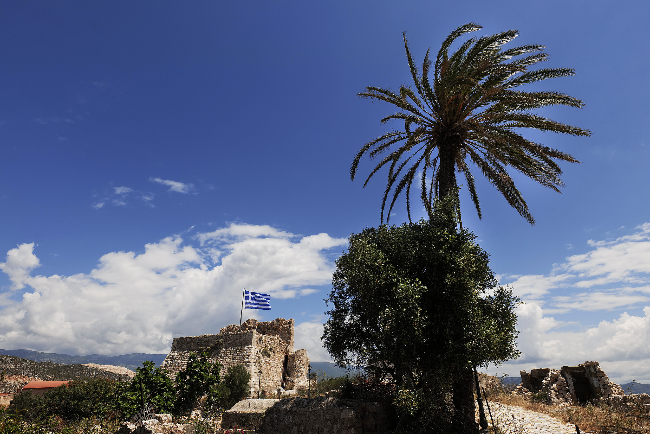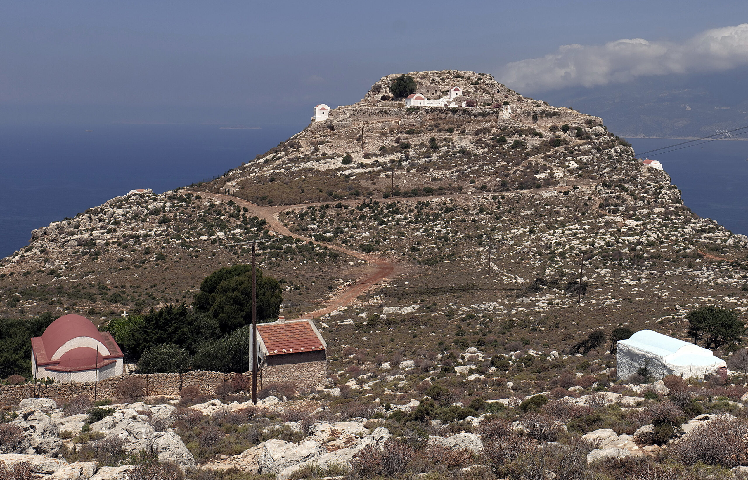 Επτά το πρωί. Ησυχία και σχετική δροσιά απλώνονται πάνω από το νησί. Ξεκινώ με βήμα ταχύ την ανάβαση προς το πεδίο ψηλά, 400 σκαλιά πάνω από τον οικισμό. Η κλίση είναι απότομη, απαιτητική. Το μονοπάτι και τα σκαλιά είναι φροντισμένα, καθαρά από επικίνδυνα για γλίστρημα χαλικάκια. Ξέπνοος καθώς ανεβαίνω, παρατηρώ τον αριθμό των σκαλοπατιών γραμμένο με μπλε χρώμα ανά πενήντα ή και εκατό, δίνοντας, ανάλογα στη διάθεση του πεζοπόρου, είτε κουράγιο είτε απογοήτευση για την απόσταση μέχρι την κορυφή. Η θέα όμως αποζημιώνει και συγχωρεί. Ο ήλιος στα ανατολικά χρυσίζει τα νερά και ζωγραφίζει τις σκιές των βραχονησίδων που συνθέτουν το νησιωτικό σύμπλεγμα της Μεγίστης, από την Ψωραδιά, το τοπικό, ιστορικά, σανατόριο, μέχρι τον Άγιο Γεώργιο αλλά και το τελευταίο ελληνικό νησί, τη Στρογγυλή.