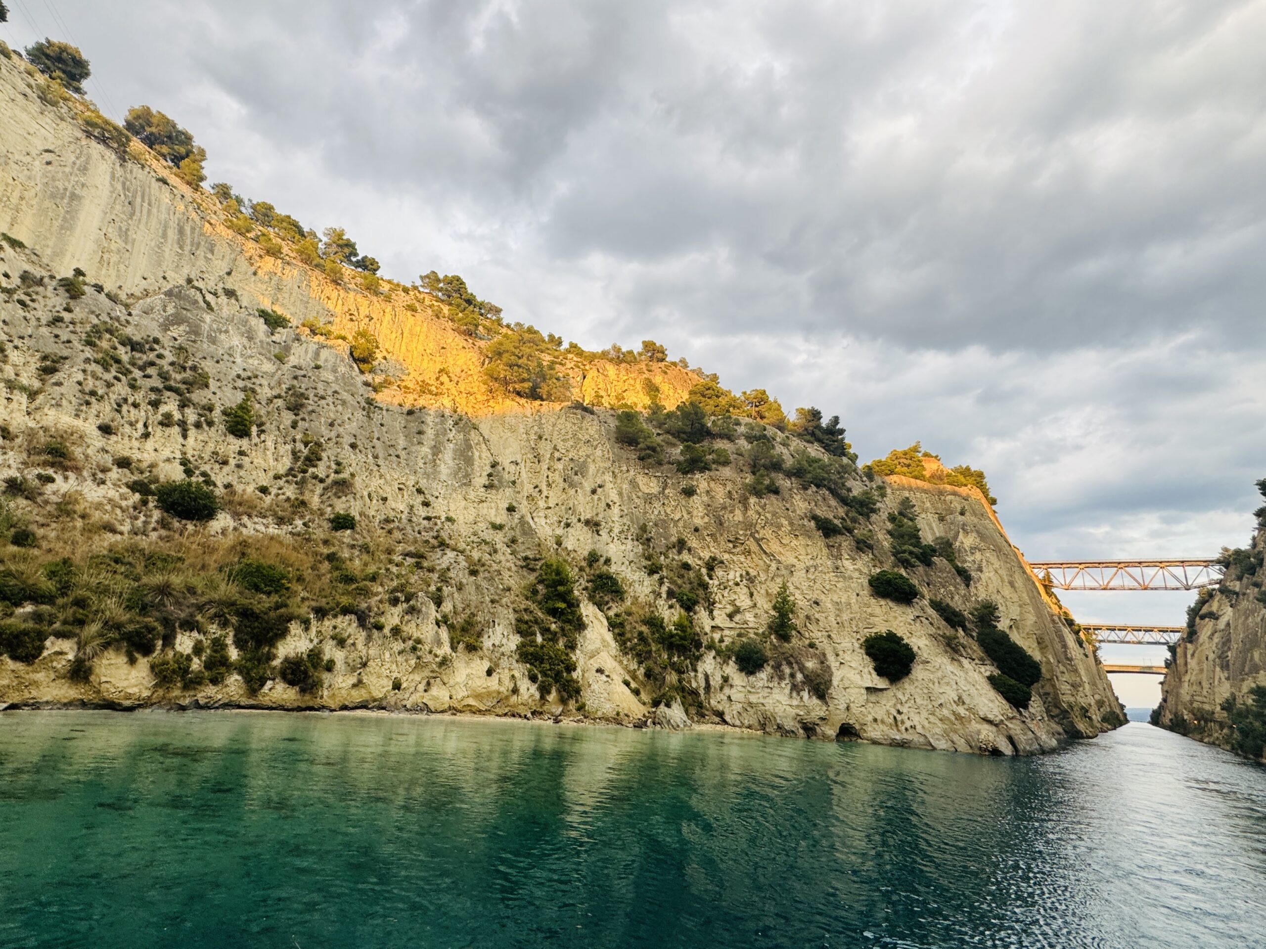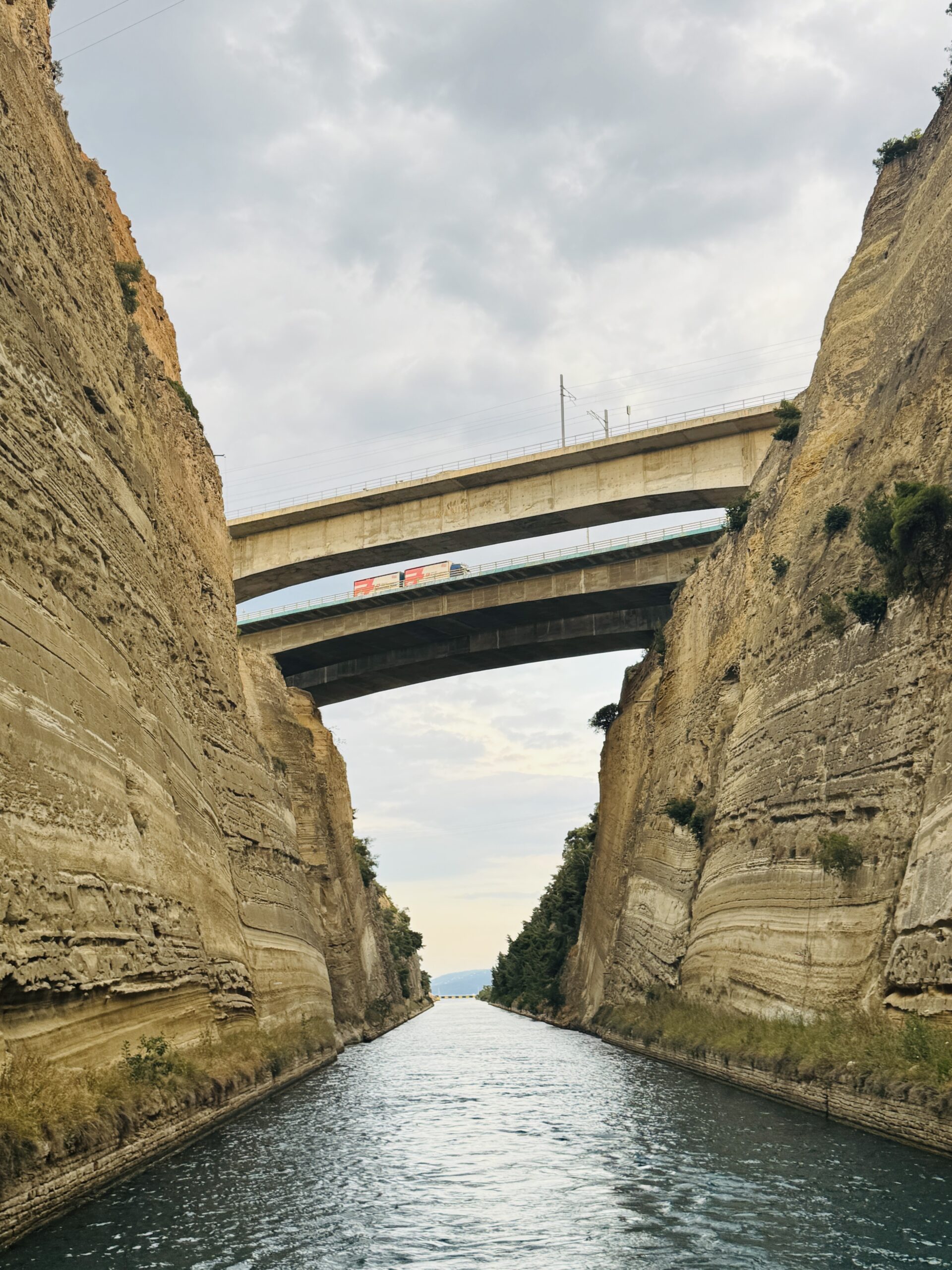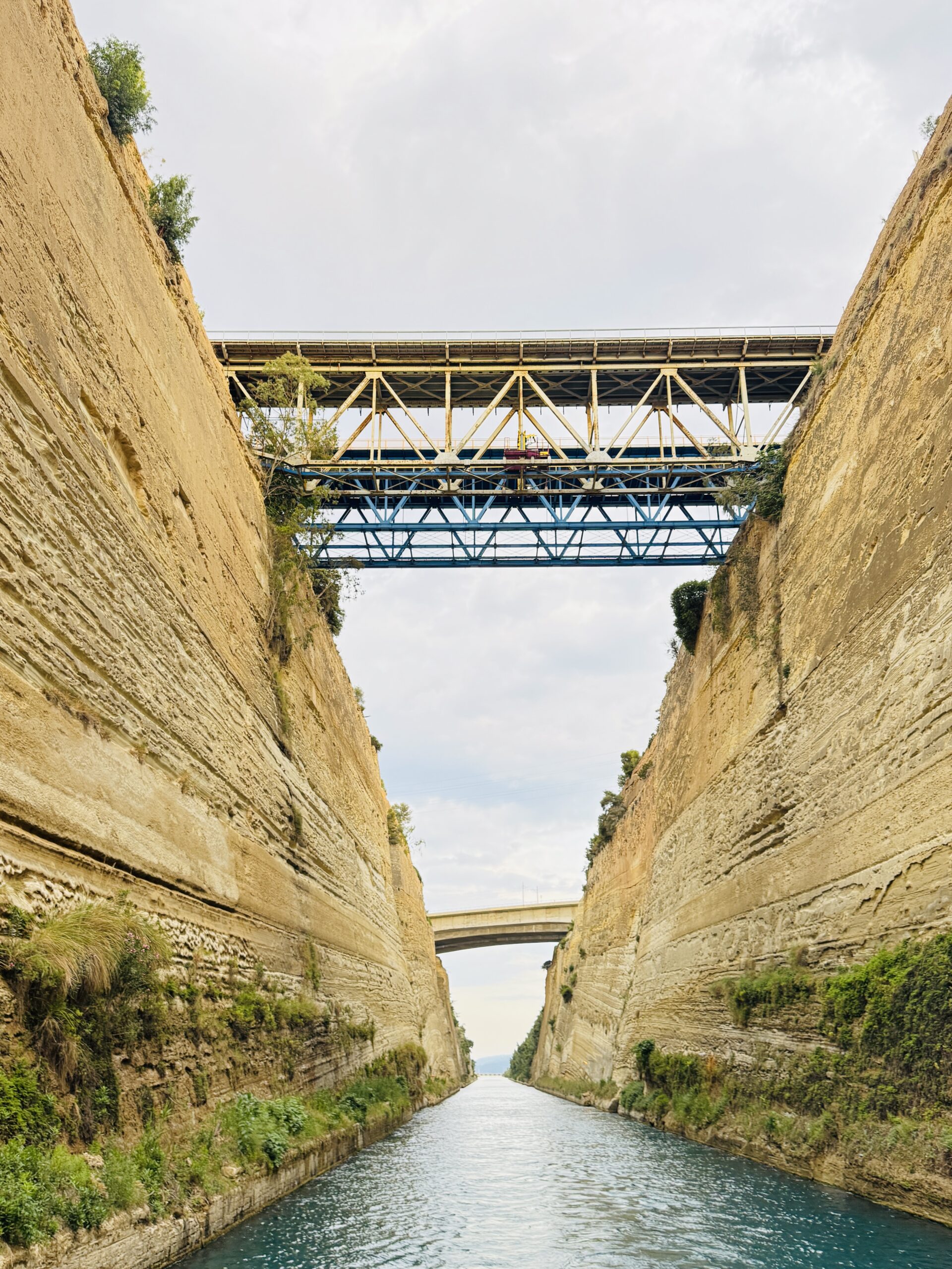 Εκατοντάδες φορές έχω περάσει από τις γέφυρες από ψηλά, ή την έχω δει από το αεροπλάνο, βλέποντας τη διώρυγα σαν μια στενή χαρακιά στη γη. Τώρα, για πρώτη φορά, παρατηρούσα τις γέφυρες από κάτω, μέσα από αυτό το τεχνητό πέρασμα που σκάλισε ο άνθρωπος στον βράχο. Τα τοιχώματα υψώνονταν απότομα προς τον ουρανό, φτάνοντας μέχρι τα 90 μέτρα, μα δεν προκαλούσαν αίσθημα κλειστοφοβίας. Το άνοιγμα των 21 μέτρων σε πλάτος έμοιαζε να έχει τις ιδανικές διαστάσεις για αυτή την εμπειρία.