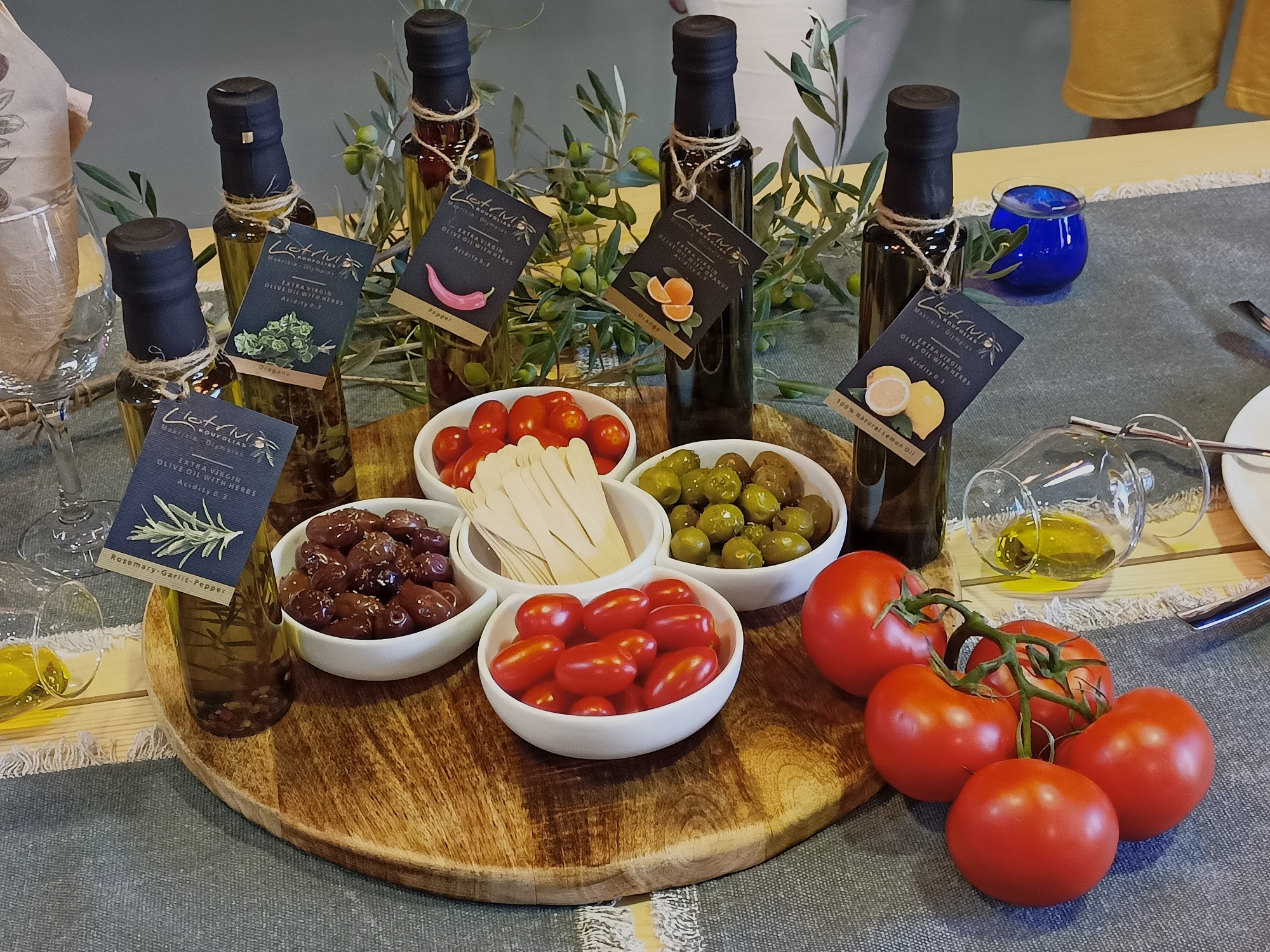 Ακολούθησε γευστική δοκιμή των λαδιών τους, συνοδεία νόστιμων μεζέδων πάνω σε φέτες ζυμωτού ψωμιού. Βρήκαμε θαυμάσιο το βραβευμένο έξτρα παρθένο ελαιόλαδο (κέρδισε φέτος το Berlin Global Olive Oil Awards), το οποίο παράγεται από ελιές κορωνέικης ποικιλίας, αλλά την παράσταση έκλεψαν τα ελαιόλαδα με λεμόνι και πορτοκάλι. Με το δεύτερο, μάλιστα, είχε παραχθεί και μους σοκολάτα τόσο γευστική, ώστε θα ορκιζόσουν ότι είχε χρησιμοποιηθεί ξύσμα πορτοκαλιού.