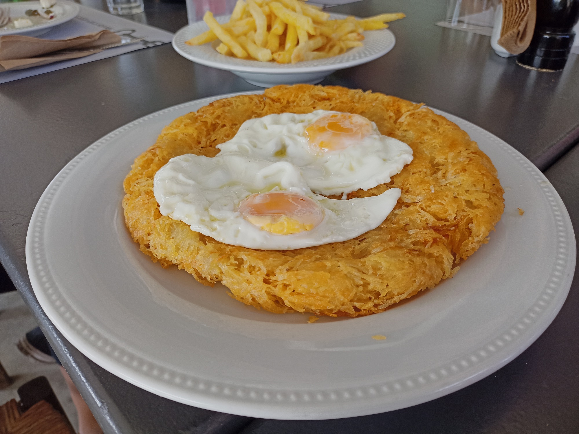 Στα Καλακαίικα, με σχεδόν 40 χρόνια ιστορίας, σε έναν ωραίο, πρόσφατα ανακαινισμένο χώρο. Νόστιμα κρέατα άψογα ψημένα (ζουμερά παϊδάκια και καλοπαρασκευασμένα μπιφτέκια), αλλά το πιάτο που εντυπωσίασε την παρέα μας ήταν κάτι πιο ιδιαίτερο: πατάτες πολύ ψιλοκομμένες, τηγανισμένες, σερβιρισμένες με αυγά μάτια από πάνω τους.