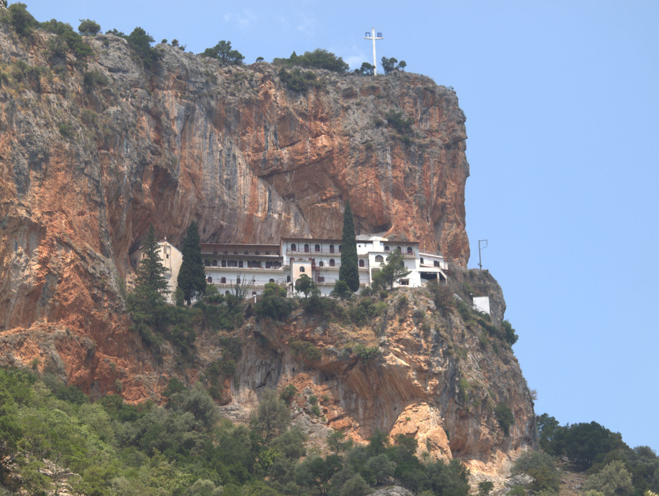 Ο δρόμος που πήραμε από το Λεωνίδιο συνεχίζει με στροφές δίπλα στην κοίτη του ποταμού για αρκετό διάστημα, σε ένα υποβλητικό τοπίο γεμάτο χαράδρες και κάθετους γκρεμούς. Κάποια στιγμή το βλέμμα πέφτει στην κρεμασμένη και χτισμένη μέσα στο βράχο Ιερά Μονή της Παναγίας της Ελώνης, η οποία λειτουργεί από το 1688. Δύσκολο να φανταστεί κανείς πώς κατάφεραν να χτίσουν όλο αυτό το συγκρότημα μέσα σε ένα τόσο σπηλαιώδες σημείο. Η θέα από χαμηλά είναι εντυπωσιακή. Λίγα χιλιόμετρα μετά, ο δρόμος στρίβει αριστερά, επιτρέποντάς σου να φτάσεις στην πύλη του μοναστηριού.