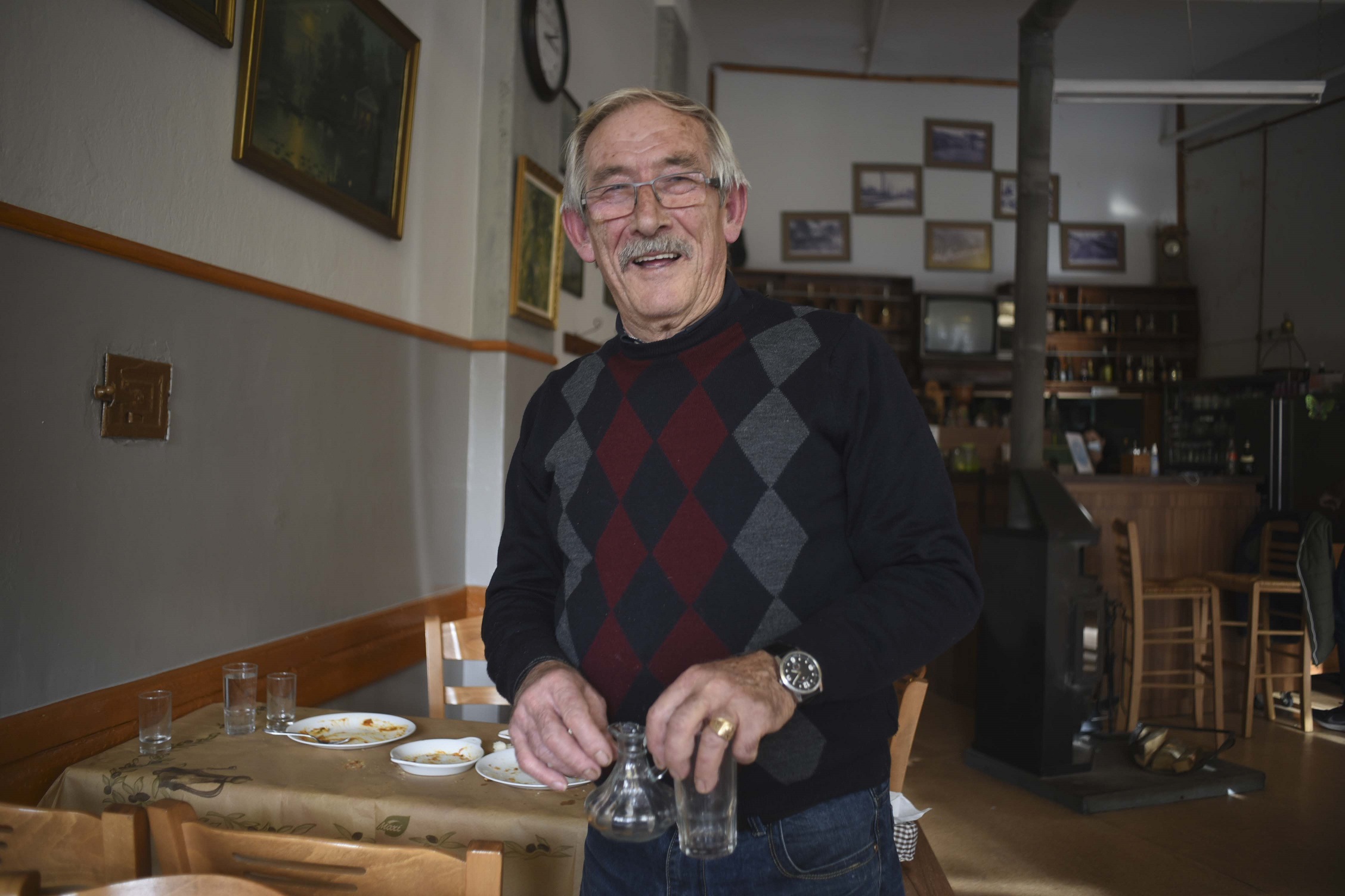 «Με τα χρόνια ο Θόδωρος ερχόταν για βόλτα με τις κόρες του, και έλεγε πάντα: “θα ξανάρθω, να ξέρεις”. Κι ερχόταν, μέχρι που δεν ξανάρθε. Όλοι τον κλάψαμε πολύ τότε. Νιώθω ευγνωμοσύνη τόσο για τη γνωστοποίηση του μαγαζιού όσο και για το πάθος να κρατώ αυτό το μαγαζί, που έγινε βίωμά μου», λέει ο Γιώργος. Από την κουζίνα, ακούγονται πιάτα να βροντάνε ρυθμικά. «Η γυναίκα του Θόδωρου έκανε παρέα με την κυρά μου και θυμόμαστε που μας ζητούσε το ζαχαρούχο γάλα. Στα γυρίσματα της ταινίας “Αιωνιότητα και μια μέρα” παίζω ο ίδιος και λέω στον Μπρούνο Γκανζ την ατάκα “Δύσκολο να βρεις ταξί, ο δρόμος είναι χάλια”, δίνοντας του ένα ποτήρι νερό από τον μπουφέ μου. Καταχείμωνο ήταν, κι η Φλώρινα στα λευκά της», μας διηγείται ακούραστα ο κυρ Γιώργος.