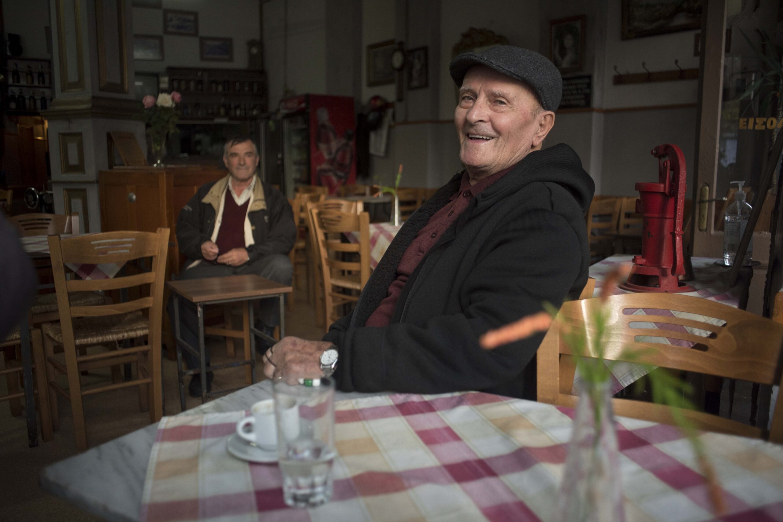 Απόγευμα η ώρα πέντε. Οι γλυκύτατοι ηλικιωμένοι θαμώνες περιμένουν να μπούνε για το καφεδάκι και το χαρτάκι τους. Με μια παιδιάστικη έκπληξη όλη η μικροκοινωνία του «Διεθνές» ποζάρει στον φακό.
