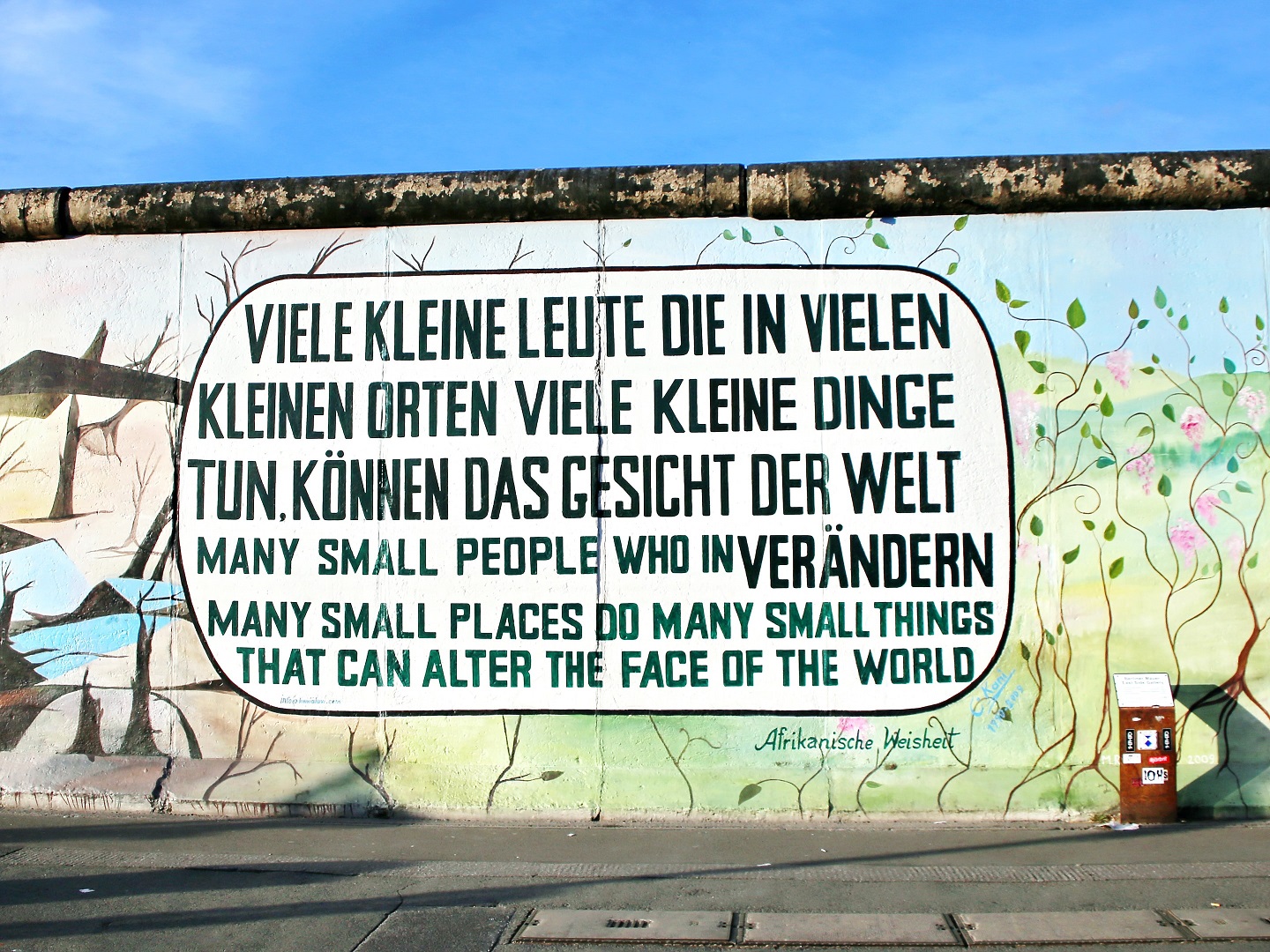 Εδώ και πολλά χρόνια τα τμήματα του Τείχους που διασώζονται είναι καλυμμένα με πολύχρωμα, «γελαστά» γκράφιτι, πλημμυρισμένα με σημαντικά κοινωνικά μηνύματα και την ελπίδα για έναν καλύτερο κόσμο. Περπατήστε κατά μήκος του και θαυμάστε τις όμορφες ζωγραφιές που αποτελούν αυτό που είναι πλέον γνωστό ως East Side Gallery (Πινακοθήκη της Ανατολικής Πλευράς), την πιο ζωντανή, μεγάλη, ιστορική υπαίθρια γκαλερί στον κόσμο.