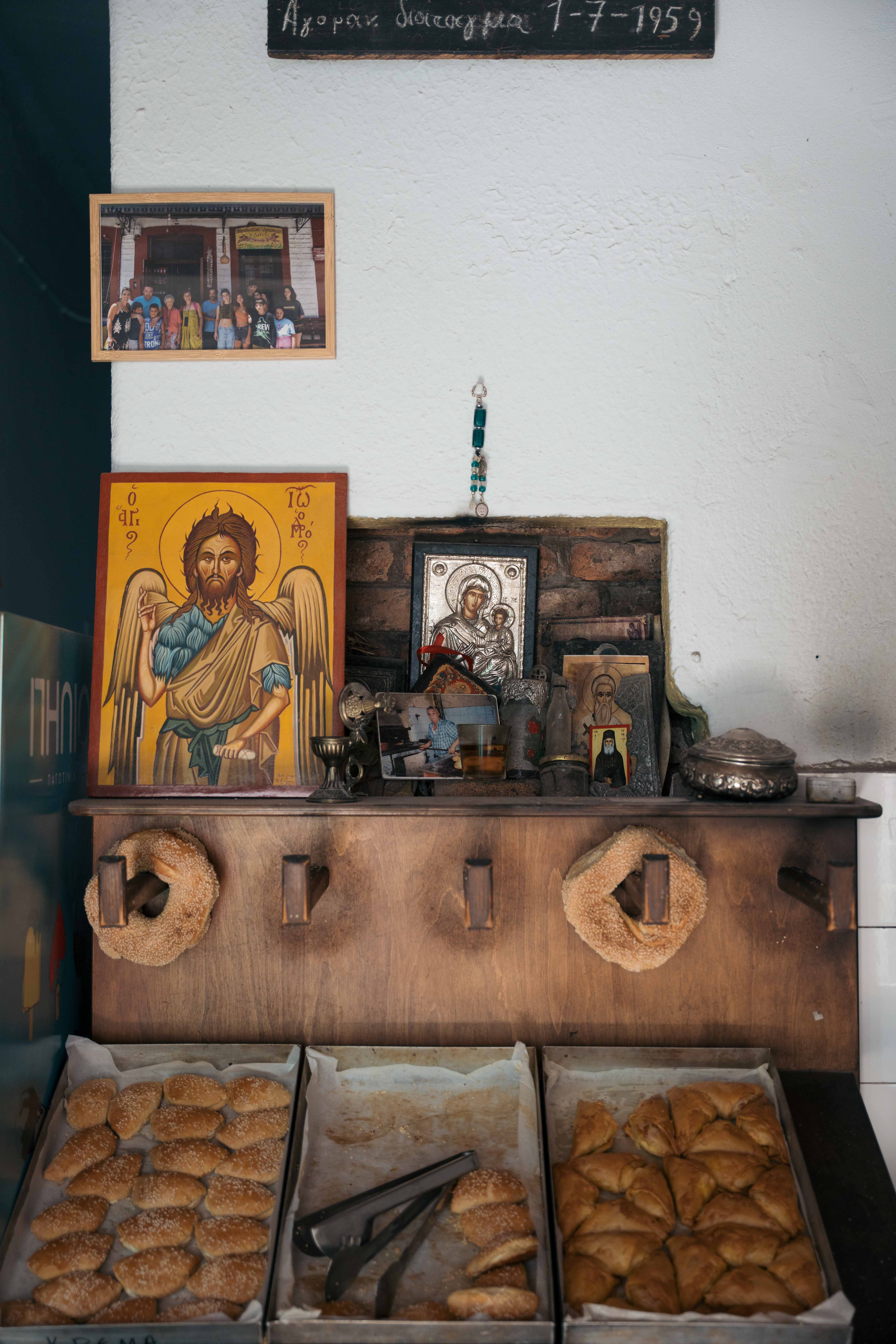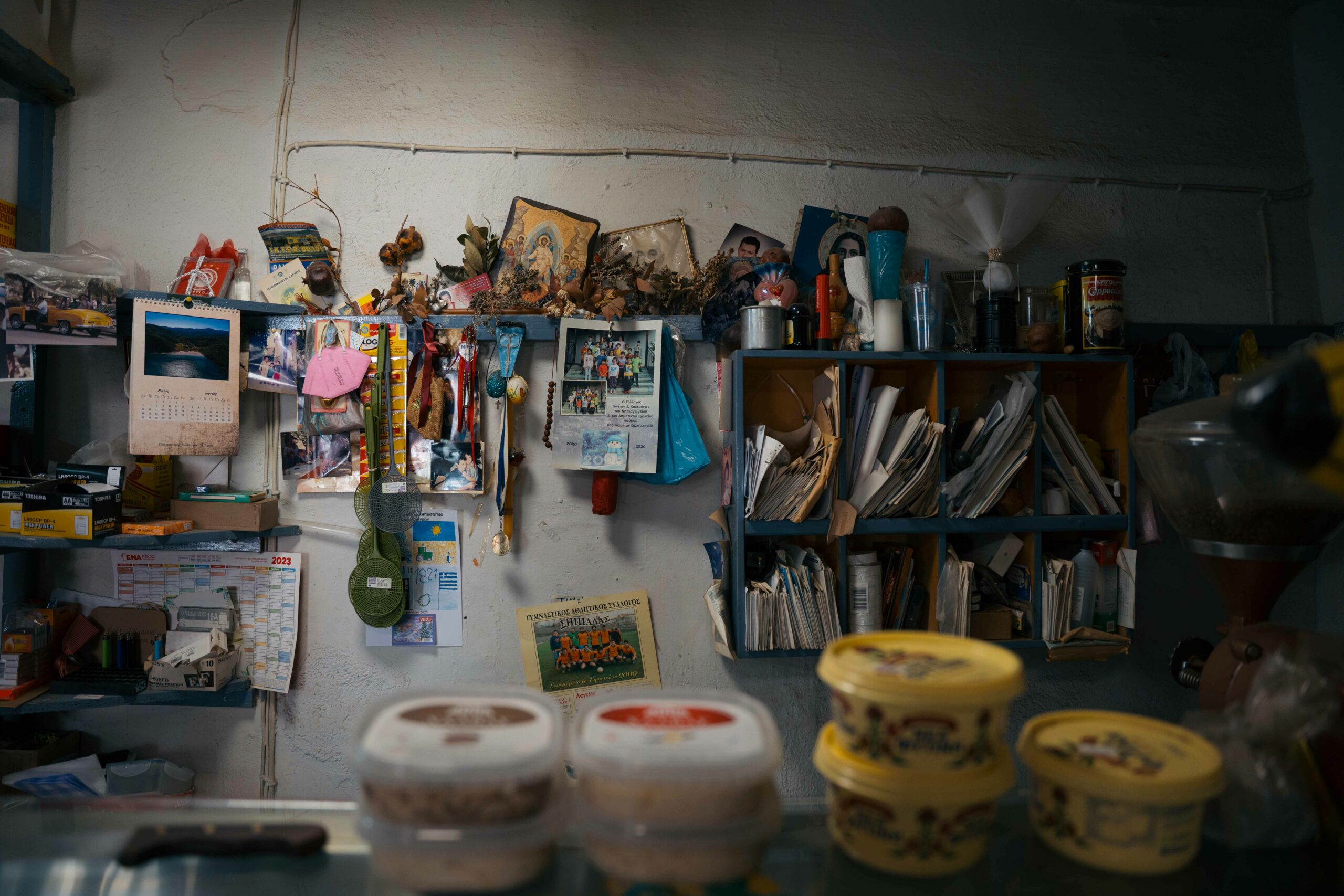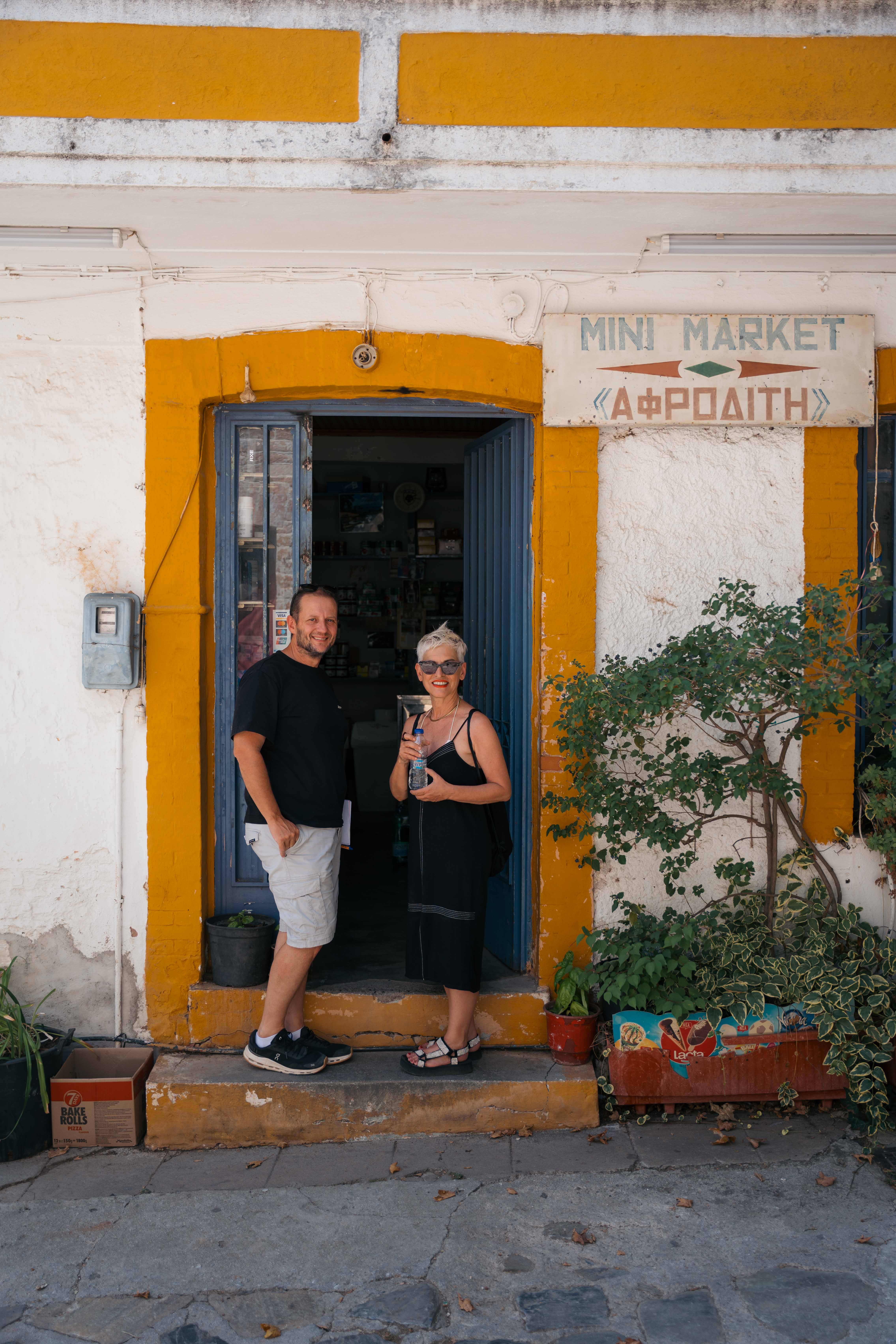 Συναντήσαμε την Αφροδίτη στο παντοπωλείο, στην πλατεία. Εργάζεται εδώ από 13 χρονών, καθώς το είχε ο παππούς της και στη συνέχεια ο πατέρας της. Το άνοιξαν το 1964. Μπαίνοντας μέσα, έχεις την εικόνα του παλαιού παντοπωλείου με τα πράγματα στις προθήκες. Έχει μείνει ανέγγιχτο στον χρόνο.