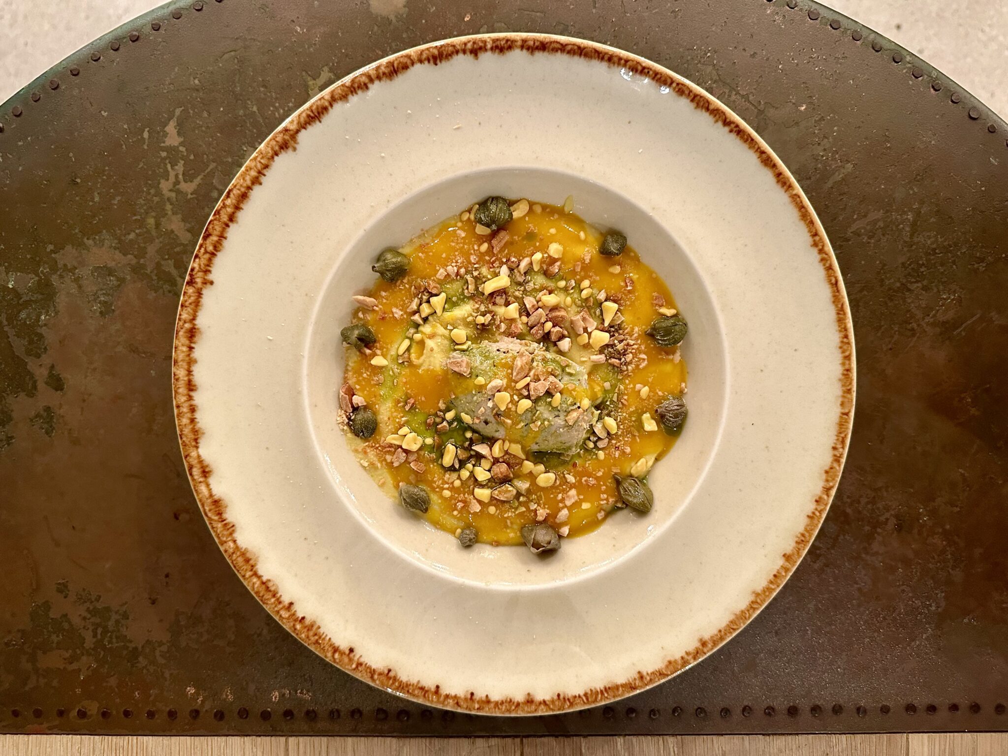 Το εστιατόριο βρίσκεται σε ένα σταυροδρόμι μικρών πεζόδρομων που τους σκιάζουν μπουκαμβίλιες κάτω από τις οποίες παρατάσσονται μαγαζιά για φαγητό, καφέ και ποτό. Είναι μια καθαρά κυκλαδίτικη νότα στην νεοκλασική Ερμούπολη. Ποια πιάτα ξεχωρίζετε ανάμεσα στα κυρίως που περιλαμβάνει το μενού;, θα τον ρωτήσω. «Την τσιπούρα με συριανή μαϊντανοσαλάτα και καρπάτσιο από φρέσκο καλαμάρι και το σπαγγέτι με μελάνι σουπιάς, ελληνικό μπλε καβούρι, καρπάτσιο σουπιάς, ζωμό αστακού και φύκια. Αλλά, και πιο mainstream επιλογές, όπως το χοντρό μακαρόνι με κιμά, που έχει στη βάση του πιάτου μια κρέμα από παλαιωμένη γραβιέρα Σύρου με σπόρια μάραθου για να το κάνω πιο ενδιαφέρον», μου απαντάει.