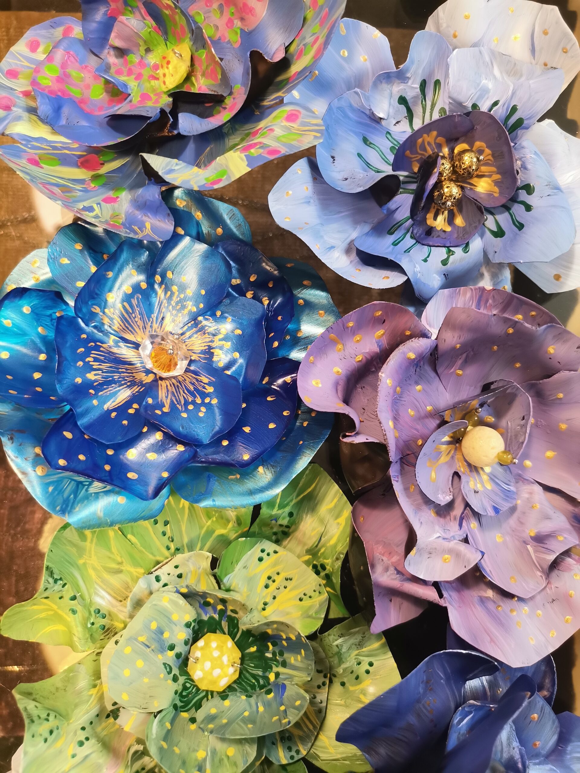 Η Χρυσάνθη είναι μια κομψή γυναίκα, με στυλ και άποψη. Είναι επίσης πολυτάλαντη και δημιουργική. Με υποδέχεται φορώντας στο πέτο της τρία μεγάλα λουλούδια τα οποία, όπως θα μάθω σε λίγο, είναι φτιαγμένα από επεξεργασμένο υλικό ακτινογραφιών. «Θέλησα να μετουσιώσω τις ακτινογραφίες που τυχαία βρέθηκαν στα χέρια μου και σιγά σιγά προέκυψε το λουλούδι. Τις επεξεργάζομαι με φωτιά και ψαλίδι, κάνω ζωγραφική, προσθέτω κάποιες πέτρες. Συμβολικά, ήθελα από αυτές τις σκούρες ακτινογραφίες, που μας προξενούν άγχος για το τι θα δείξουν, να δημιουργηθούν χρωματιστά λουλούδια. Αυτή τη συλλογή την ονομάζω «You are a flower». Κάθε λουλούδι από αυτά είναι μοναδικό, όπως άλλωστε και κάθε γυναίκα. Ζητώ λοιπόν από τις πελάτισσές μου να διαλέξουν το δικό τους, εκείνο που τους «μιλάει» ιδιαίτερα», λέει δείχνοντάς μου την απίθανη συλλογή της και προτρέποντάς με να επιλέξω το δικό μου.