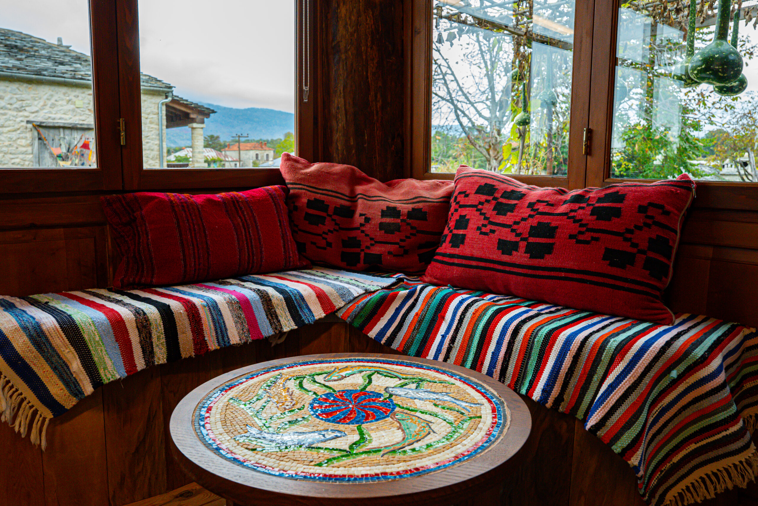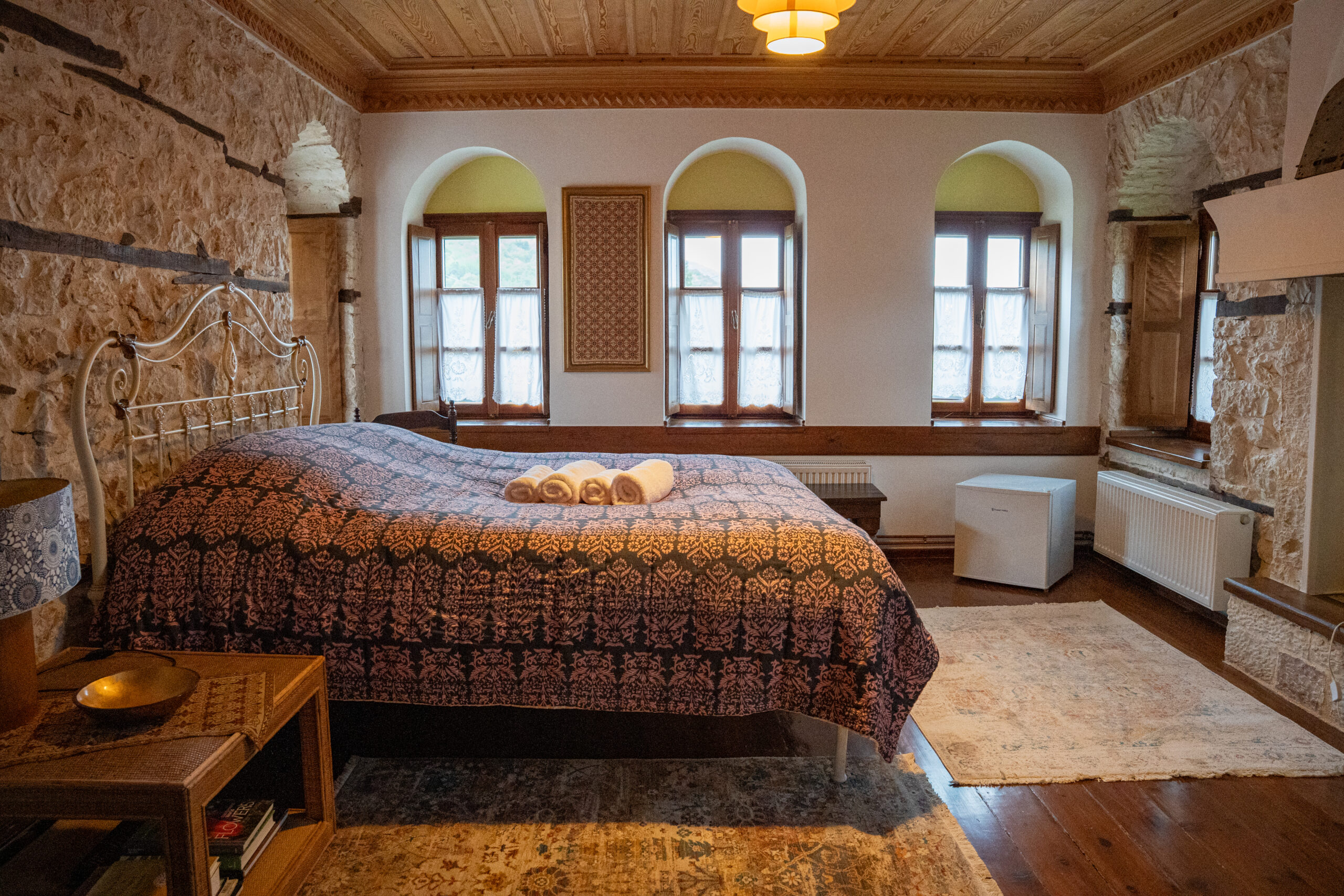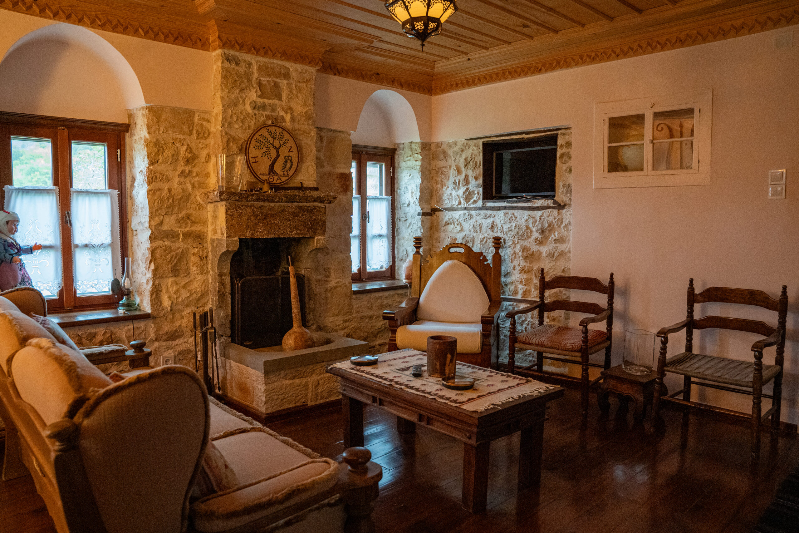 Στον προαύλιο χώρο, μια πιστή αναπαράσταση σαρακατσάνικης καλύβας στέκεται σαν βιωματικό μουσείο, υπενθύμιση της νομαδικής κτηνοτροφικής παράδοσης που διαμόρφωσε την Ήπειρο. Συναντήσαμε τον Χρήστο Κωσταρά που ανακάτευε τα στέμφυλα. Μας οδήγησε στα δωμάτια του ξενώνα, χώρους όπου το πέτρινο τοιχίο συναντά το ξύλο των οροφών, όπου κάθε γωνιά φέρει το βάρος της ιστορίας χωρίς να χάνει τη σύγχρονη άνεσή της.
