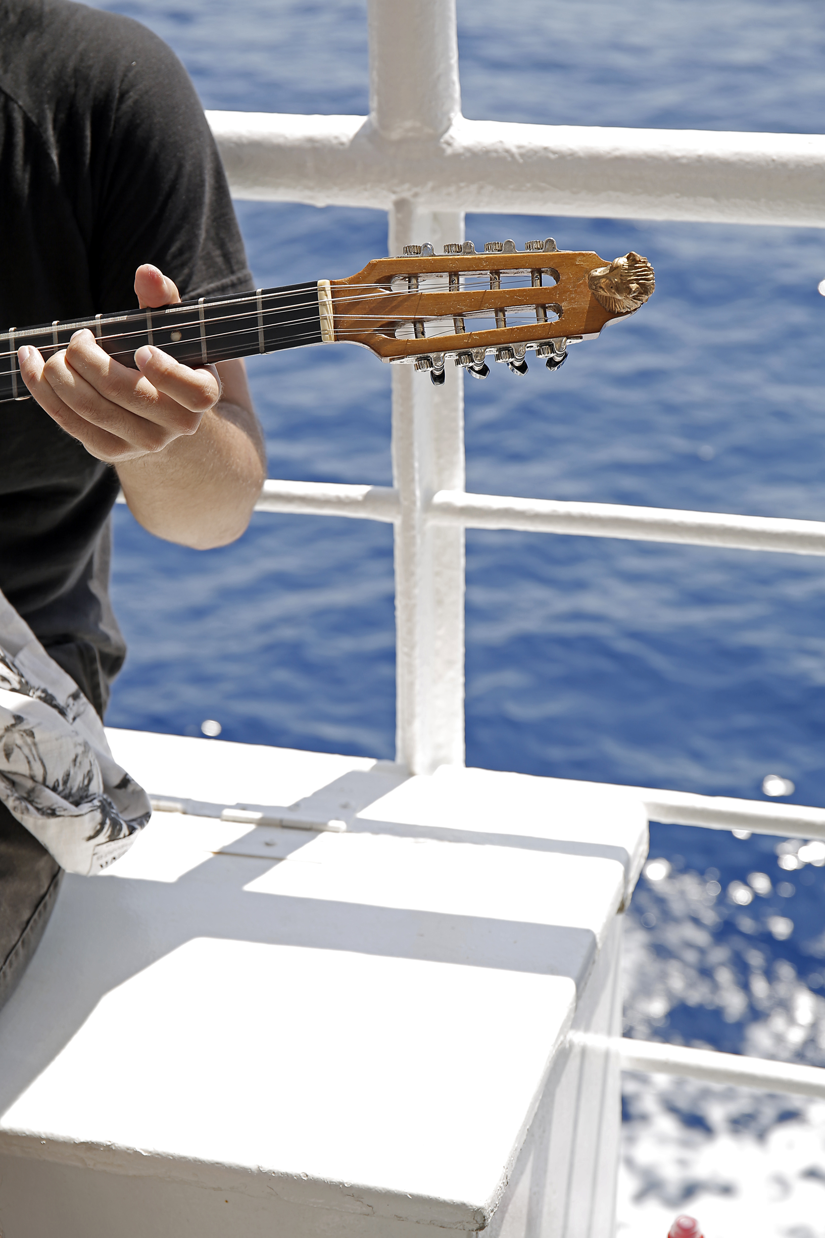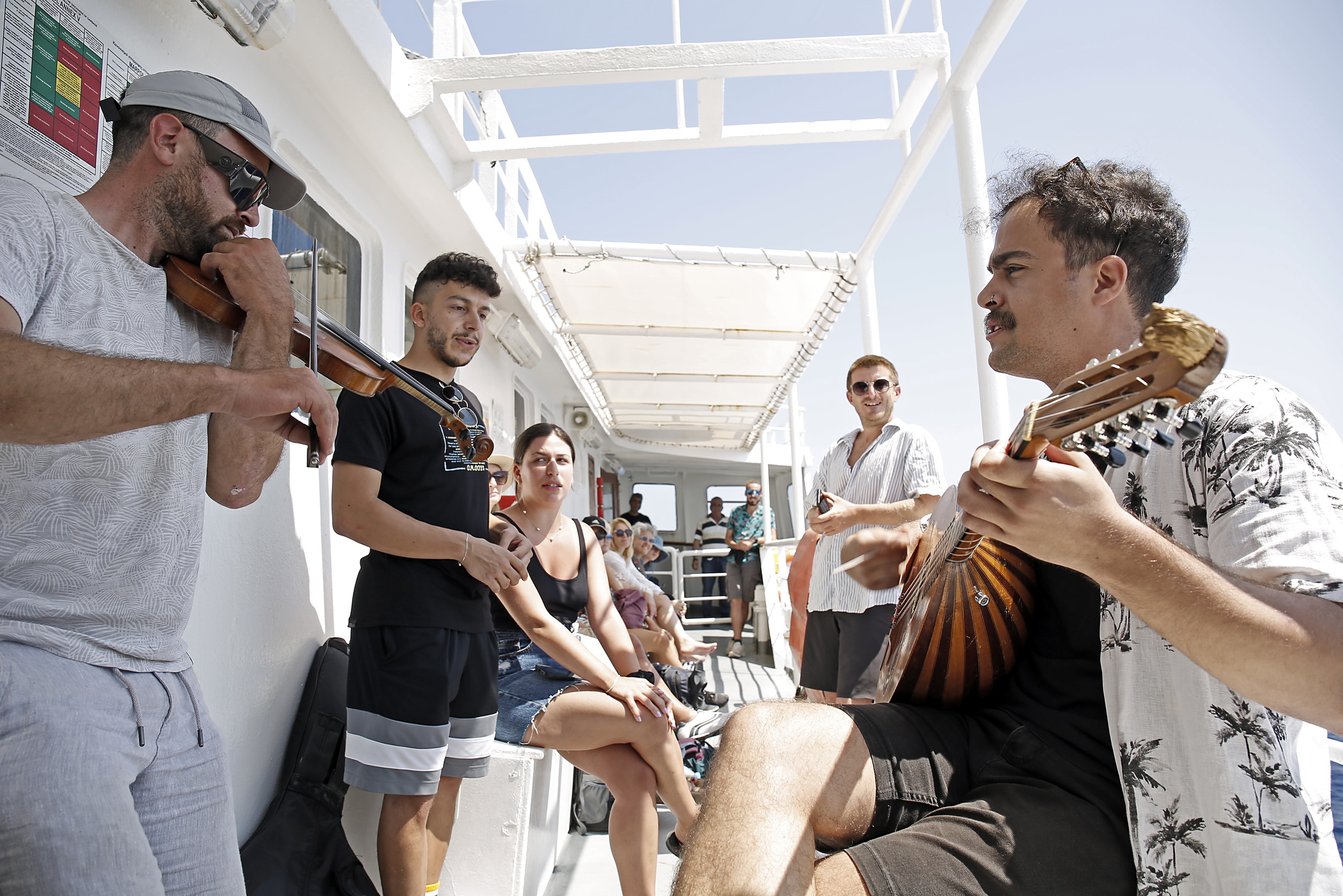 Έξω, στο κατάστρωμα, έχει στηθεί μία μικρή μουσική εκδήλωση, αυθόρμητη, με ήχους νησιώτικους, βιολί και λαούτο, κάνοντας τους έκπληκτους τουρίστες να γεμίσουν την μνήμη των κινητών τους με βίντεο και φωτογραφίες αυτής της απίθανης στιγμής ελληνικότητας, φέρνοντας στο σήμερα αναμνήσεις απλότητας και ανεπιτήδευτης ομορφιάς.
