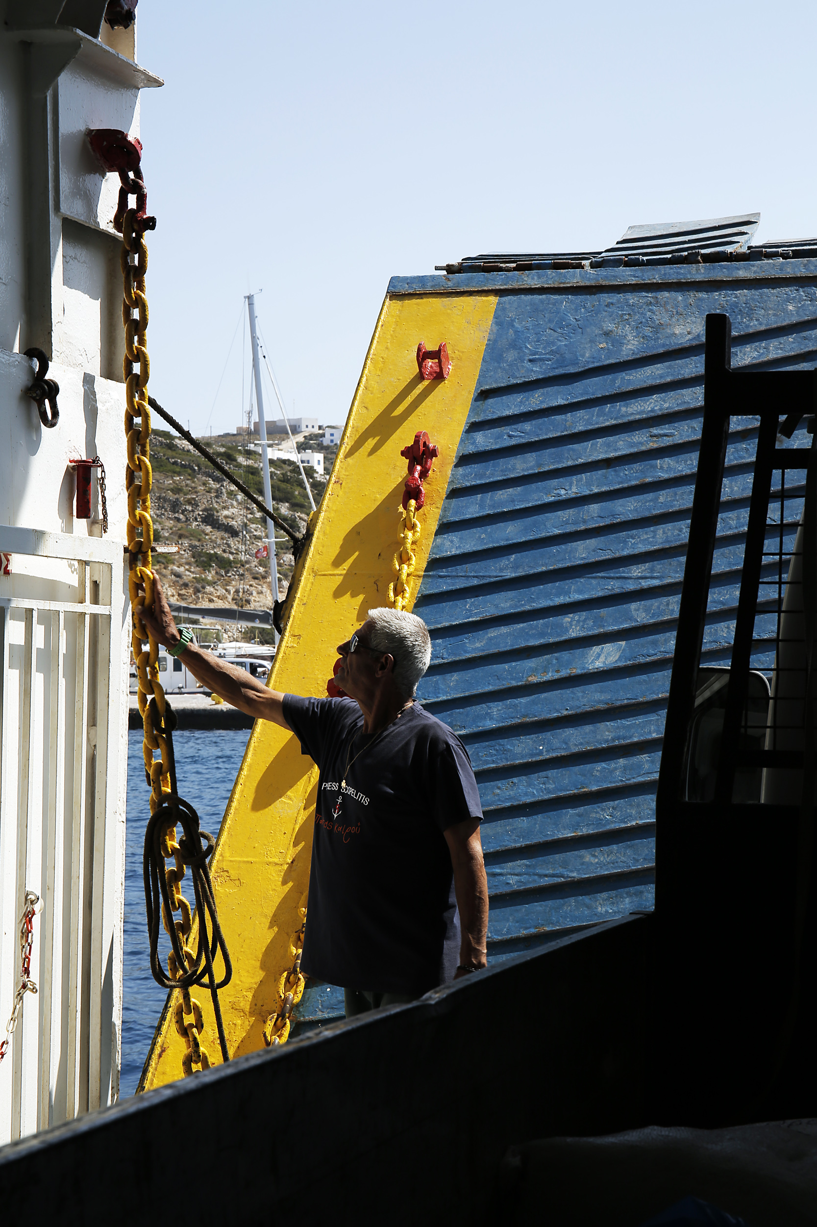 Καθώς το σκάφος γλιστράει όμορφα στην επιφάνεια της θάλασσας από νησί σε νησί, αφού σήμερα ο κυματισμός είναι μικρός και απολαυστικός, η ίδια σκηνή επαναλαμβάνεται σε κάθε προσέγγιση. Κόσμος περιμένει στην προβλήτα, ένα πλήθος ανθρώπων, ο καθένας περιμένοντας και κάτι από την άφιξη του πλοίου. Από ζαρζαβατικά για τα εστιατόρια (αφού οι τοπικές παραγωγές δεν αρκούν τους τουριστικούς μήνες), ανταλλακτικά για κάποια μικροζημιά, αλλά και επιβάτες οι οποίοι έχουν κλείσει δωμάτια στο συγκεκριμένο νησί. Ο καταπέλτης ακουμπά μαλακά στο τσιμέντο και, σαν κυψέλη, μπαινοβγαίνουν όλοι στο γκαράζ αφαιρώντας την πραμάτεια που προορίζεται για αυτούς από τη σηματοδοτημένη γωνιά.